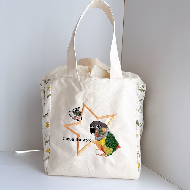 ご覧頂き有難うございます(*^_^*) サンコーのウィズキャリーMサイズがゆったりと入るキャリーバックです。 本体の帆布部分は1枚布を使用。似たサイズでタイプの異なるキャリーをお使いの方も底に縫い目がなく平らになりましたので安定感を損なわず入れていただけます。 通院の際に診察券やお薬をさっと入れるポケットはサイドと同じ布を使用してかわいさがUP☆冬場はカイロを入れてお使いいただけます。 (温度管理にくれぐれもご注意ください) 開口部の布は裏布と同じシーチングを使用しました。布が柔らかいので巾着が絞りやすく、小鳥さんの出し入れも安心で統一感も抜群です♪ 軽い仕上がりですので普段のお買い物やお出かけにもお使いいただけます☆ サイズ Mサイズ(ウィズキャリー水色サイズ) 幅約33㎝×奥行き22㎝×高さ24㎝ 持ち手約40㎝