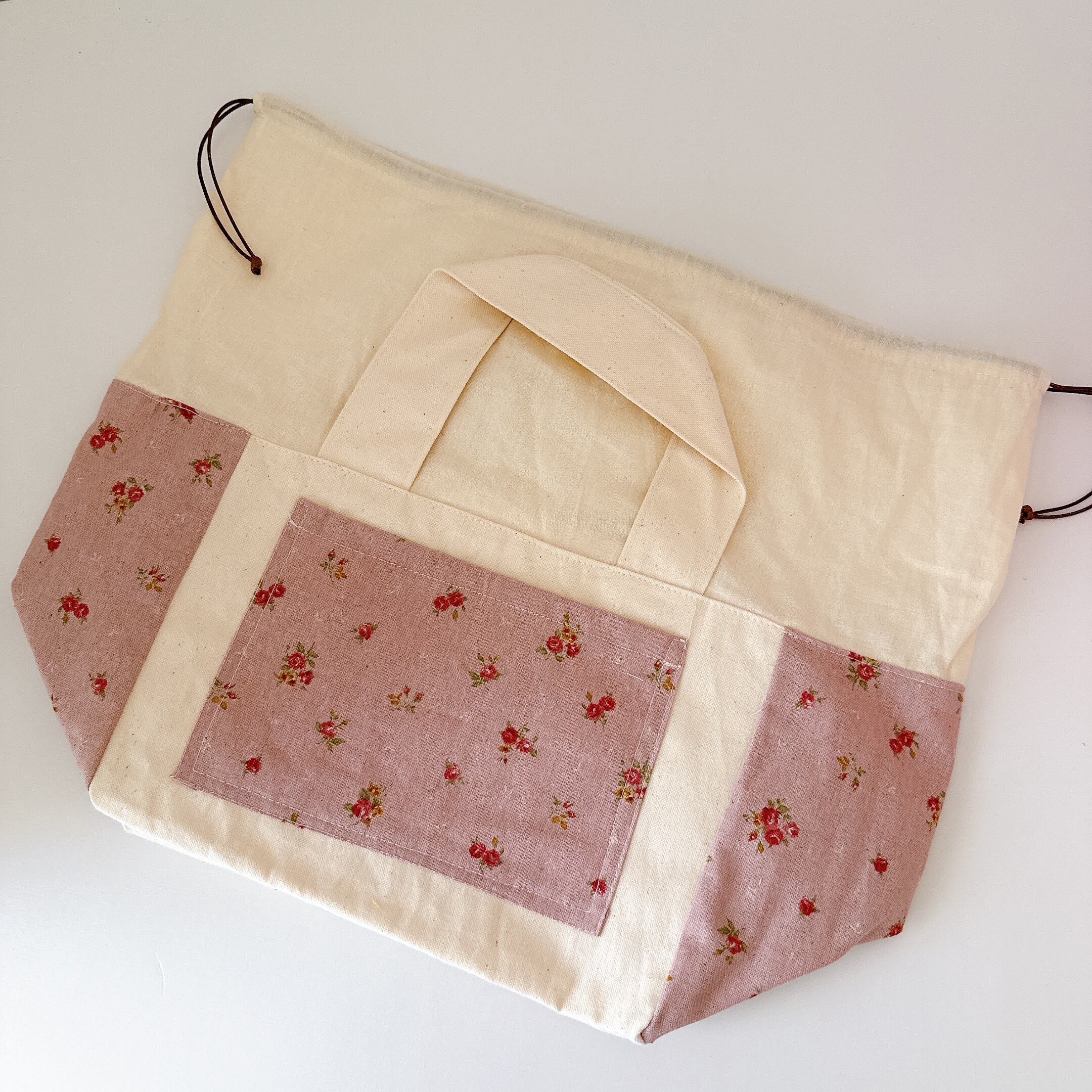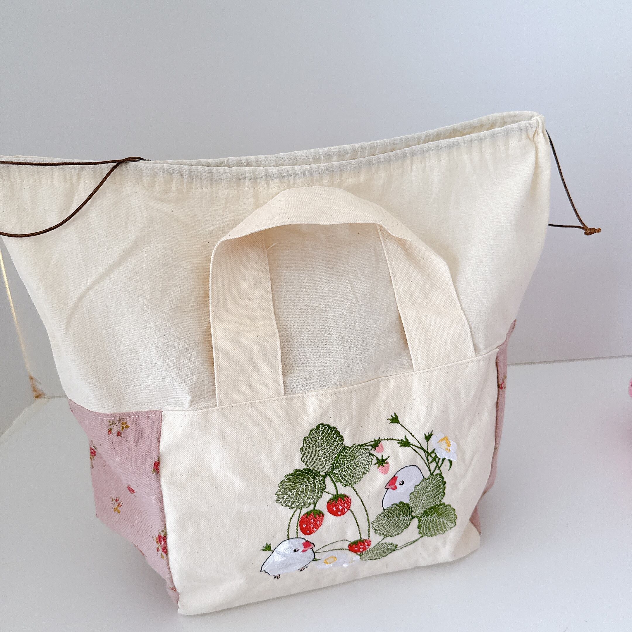 開口部の布は裏布と同じシーチングを使用しました。布が柔らかいので巾着が絞りやすく、小鳥さんの出し入れも安心で統一感も抜群です♪