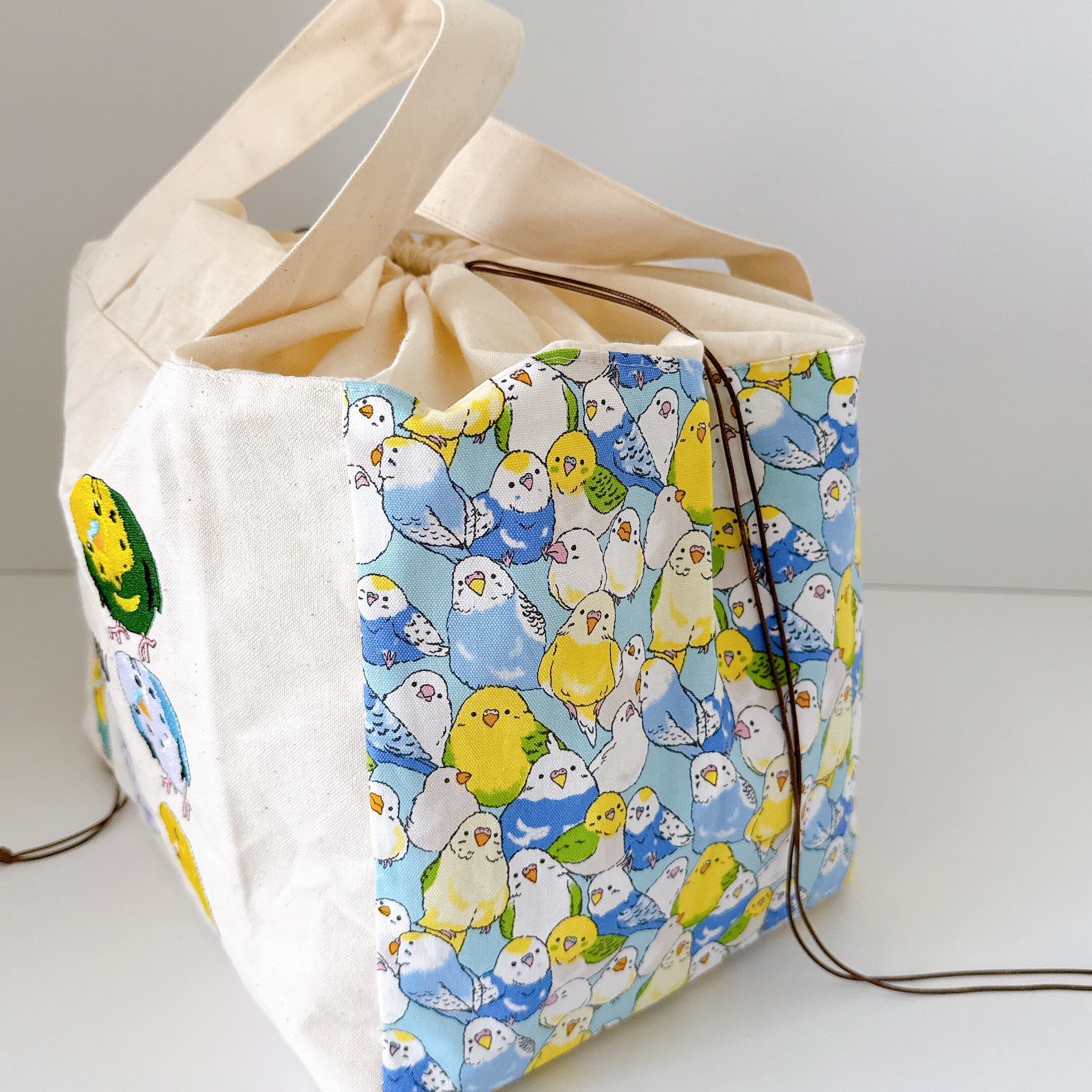 開口部の布は裏布と同じシーチングを使用しました。布が柔らかいので巾着が絞りやすく、小鳥さんの出し入れも安心で統一感も抜群です♪