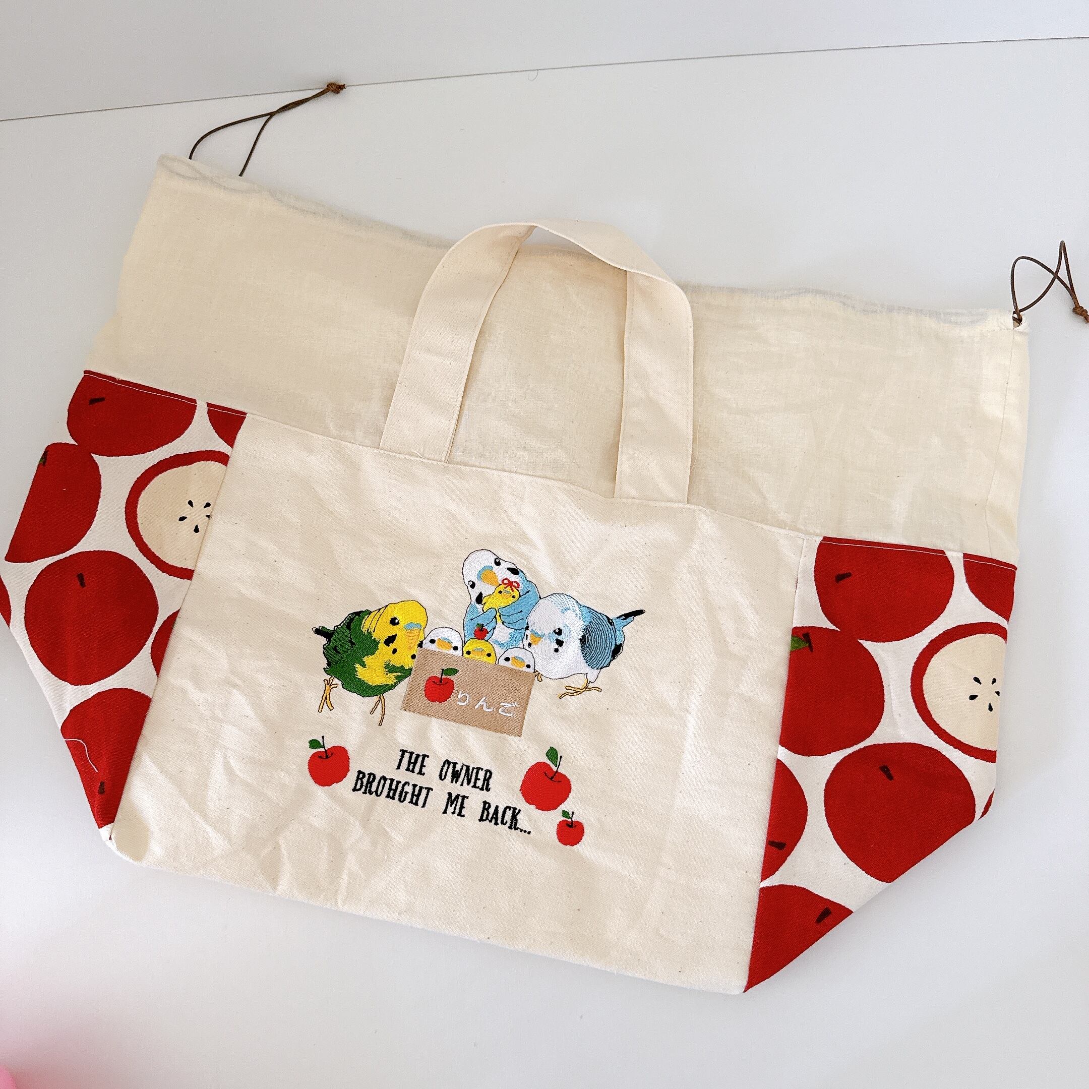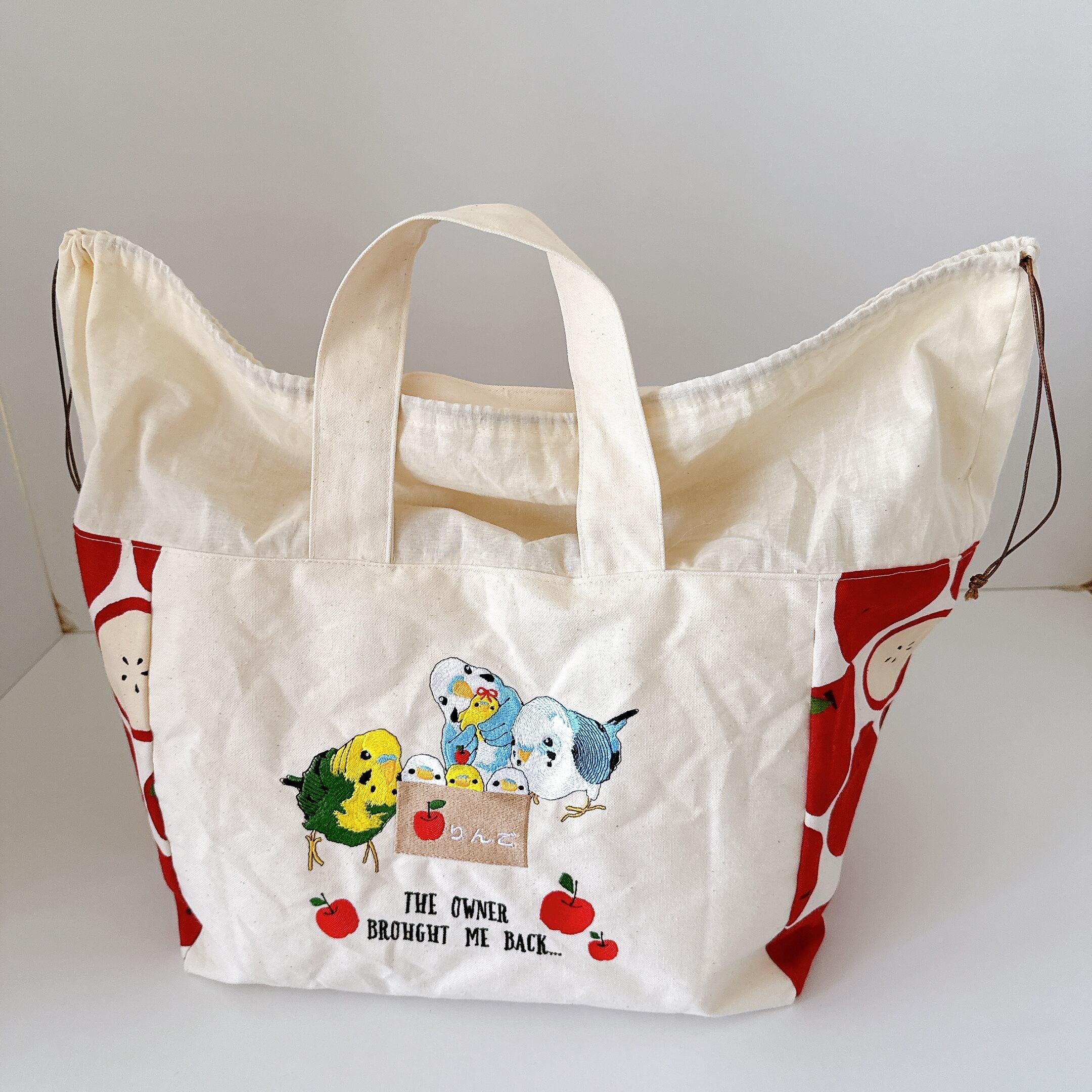 開口部の布は裏布と同じシーチングを使用しました。布が柔らかいので巾着が絞りやすく、小鳥さんの出し入れも安心で統一感も抜群です♪