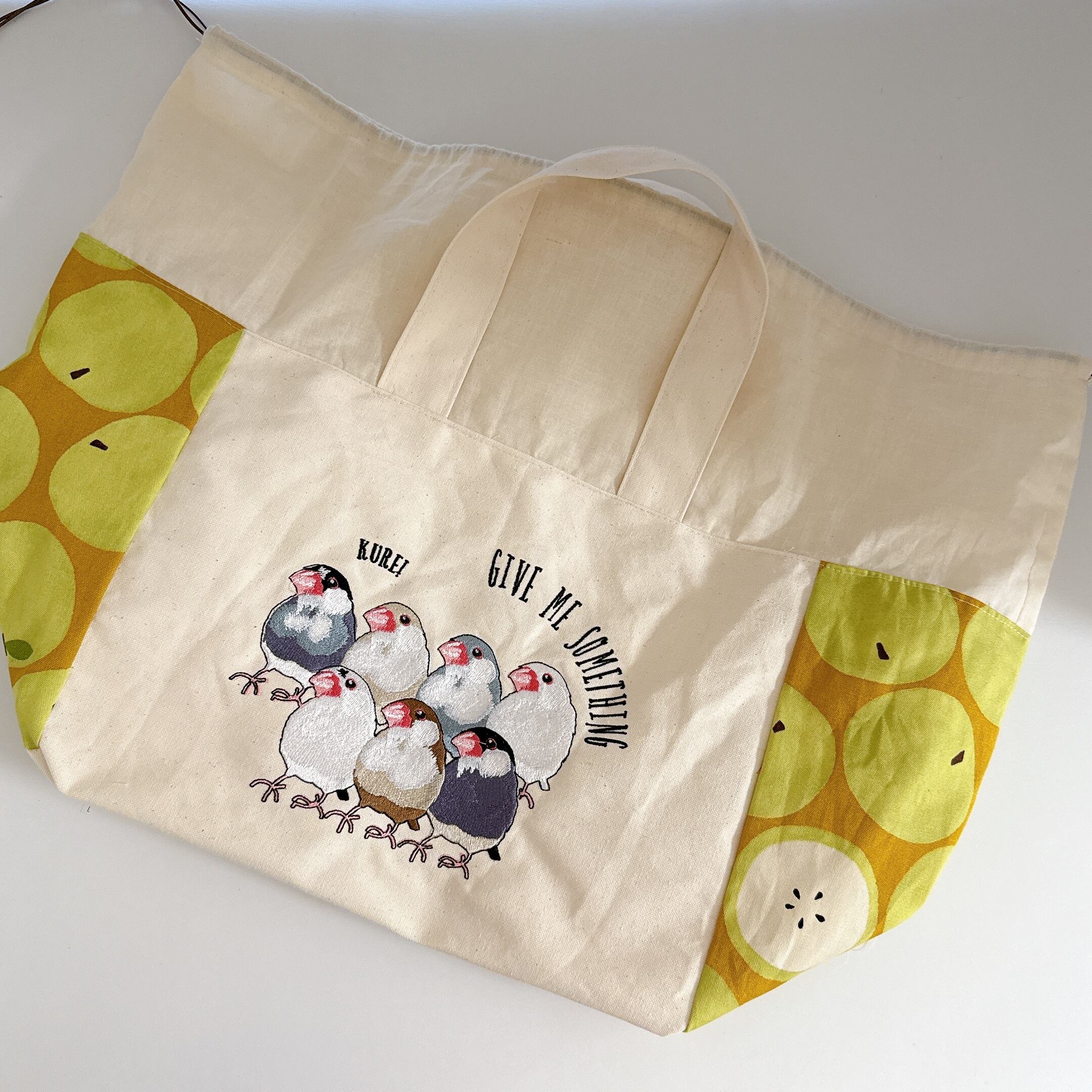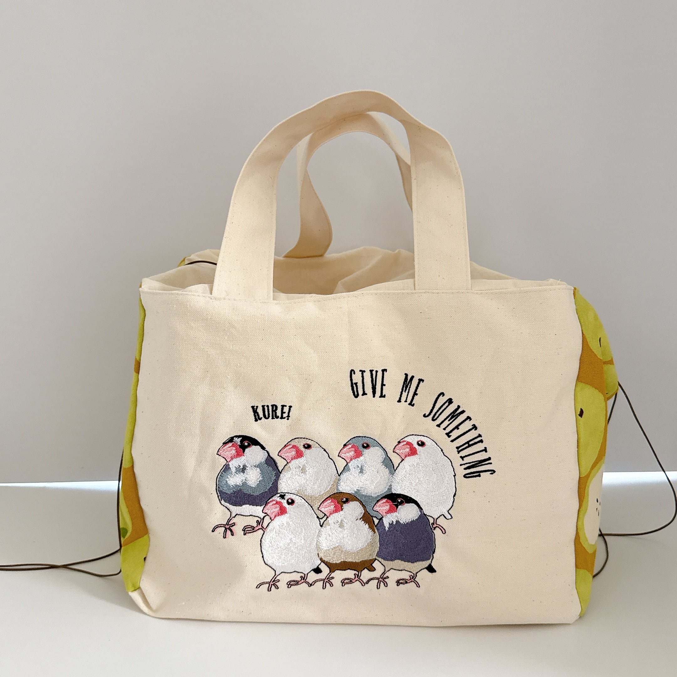 開口部の布は裏布と同じシーチングを使用しました。布が柔らかいので巾着が絞りやすく、小鳥さんの出し入れも安心で統一感も抜群です♪