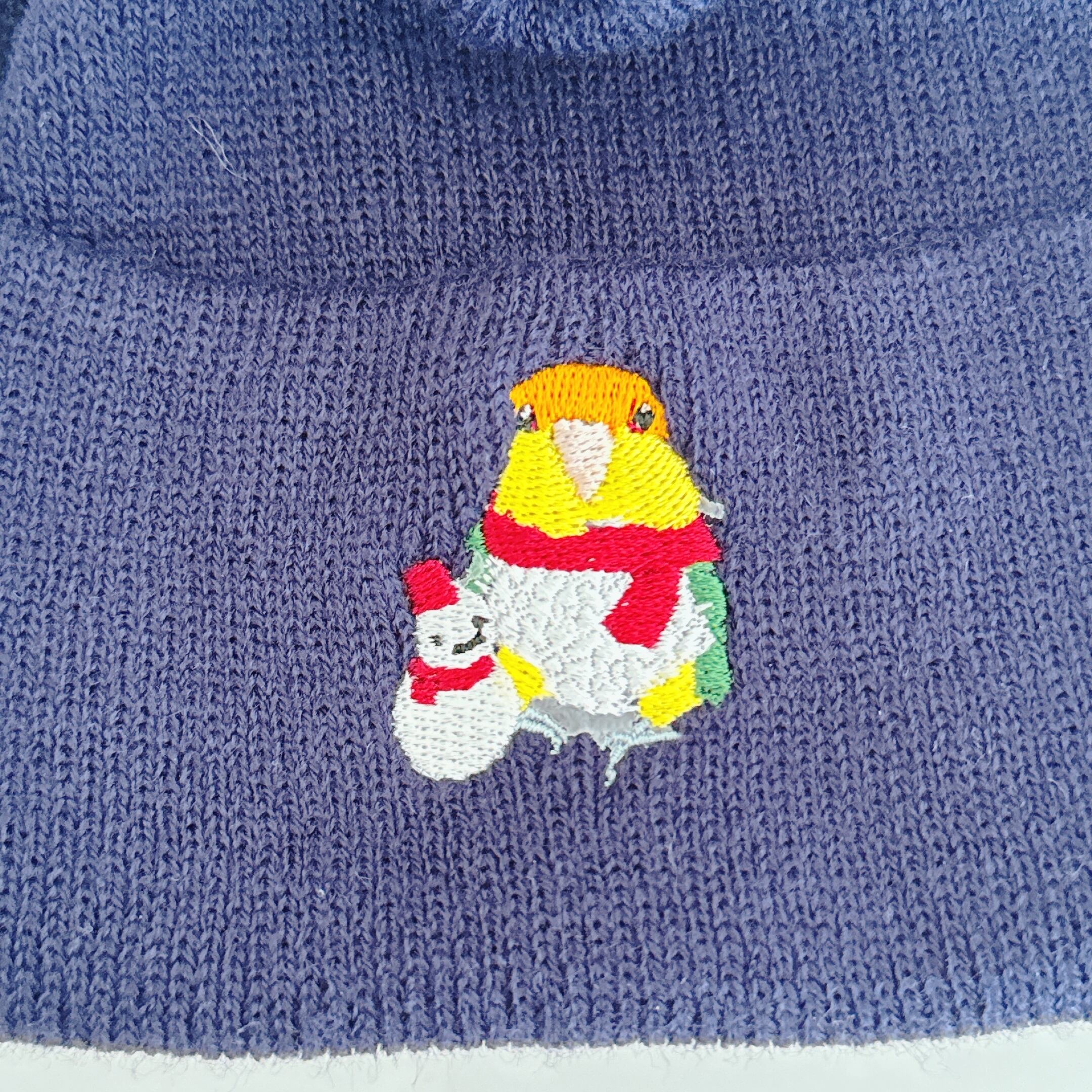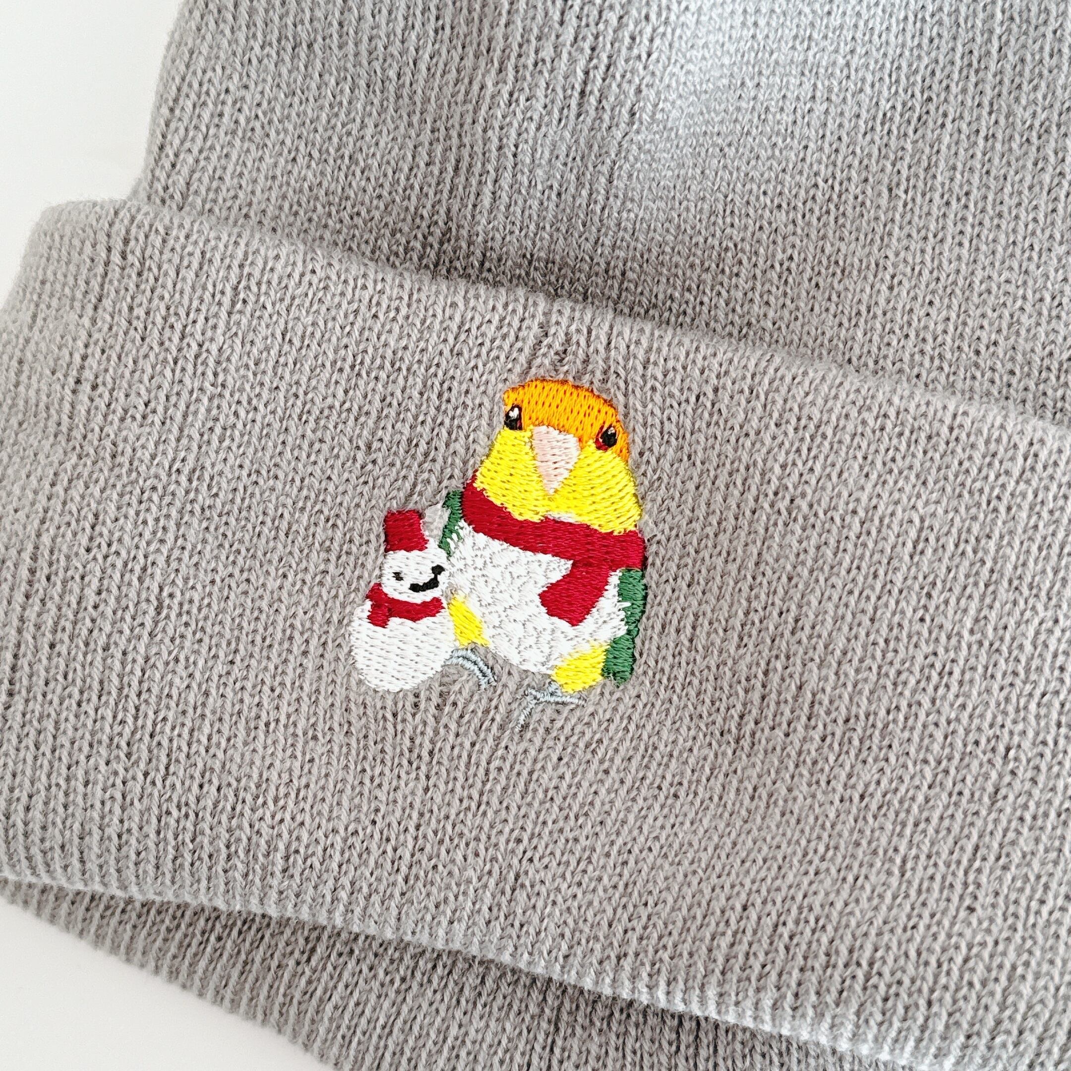 可愛らしいシロハラインコのデザインが特徴のビーニーです。
