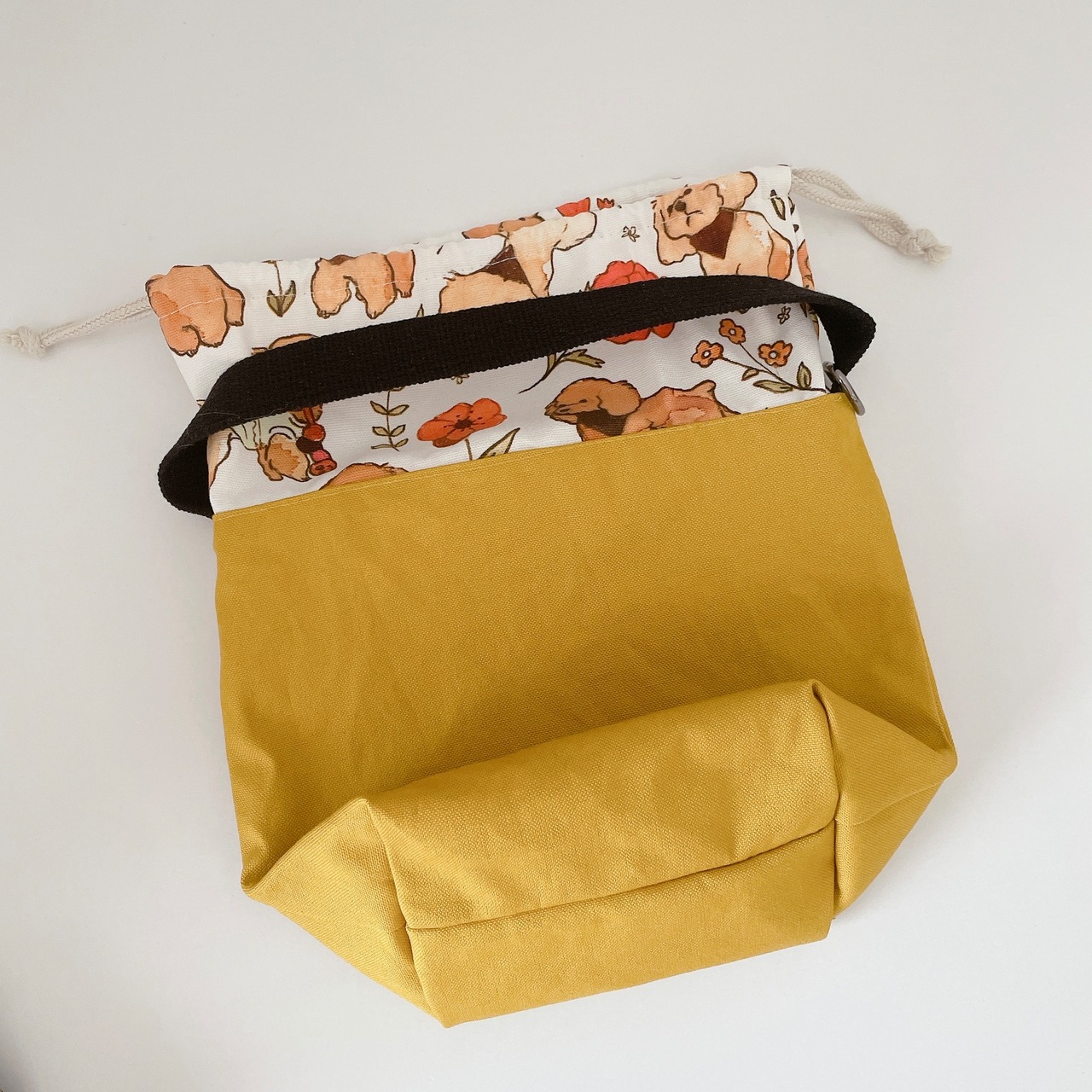 開口部は巾着です。巾着分ゆったりと使用できますので、500mlのペットボトルも中に入れてお散歩できます♩
