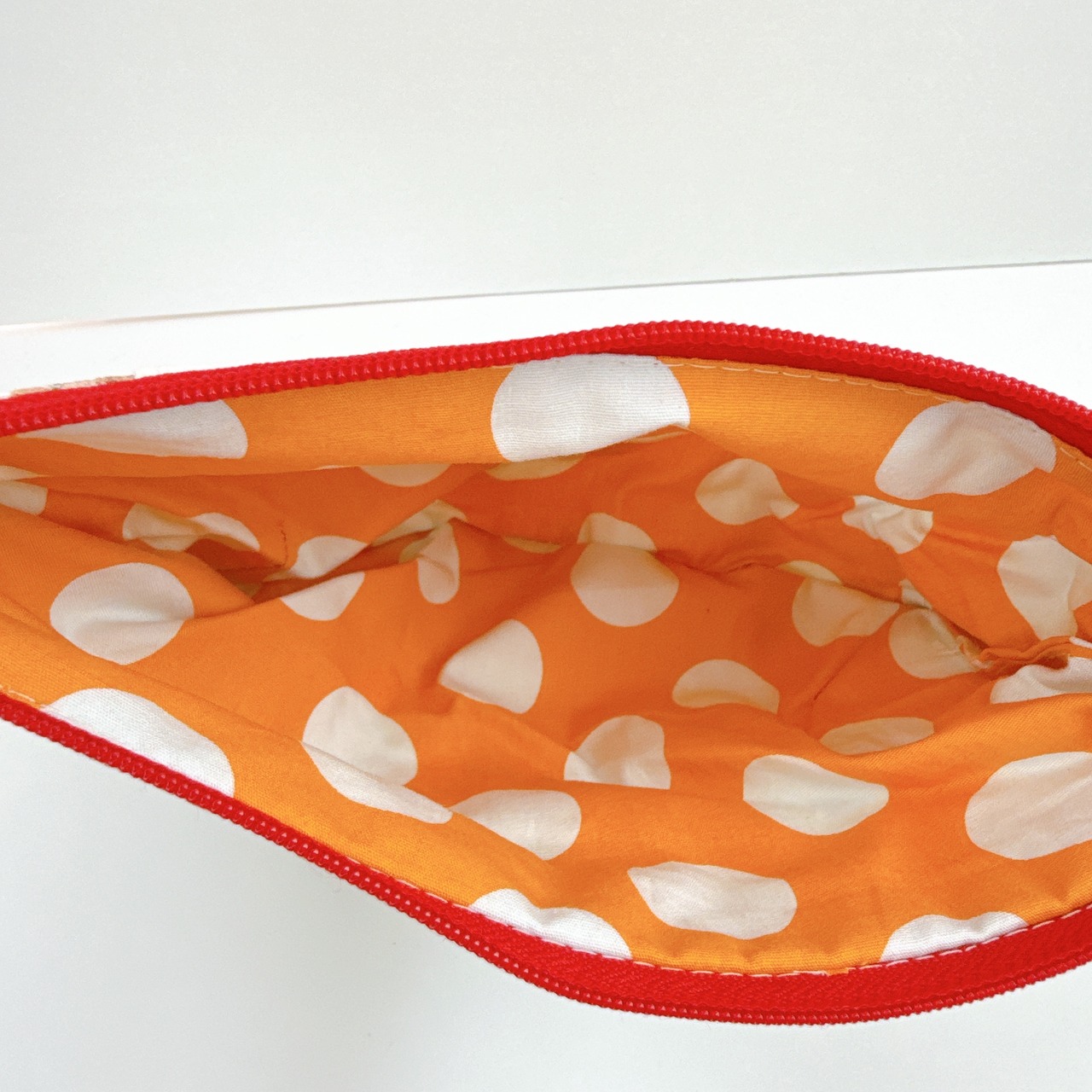通帳がゆったりと入るポーチです。開口部は20㎝ファスナーを使用して底にはタックをとっていますので中身が確認しやすく、お化粧品を入れるのにもおススメです♪