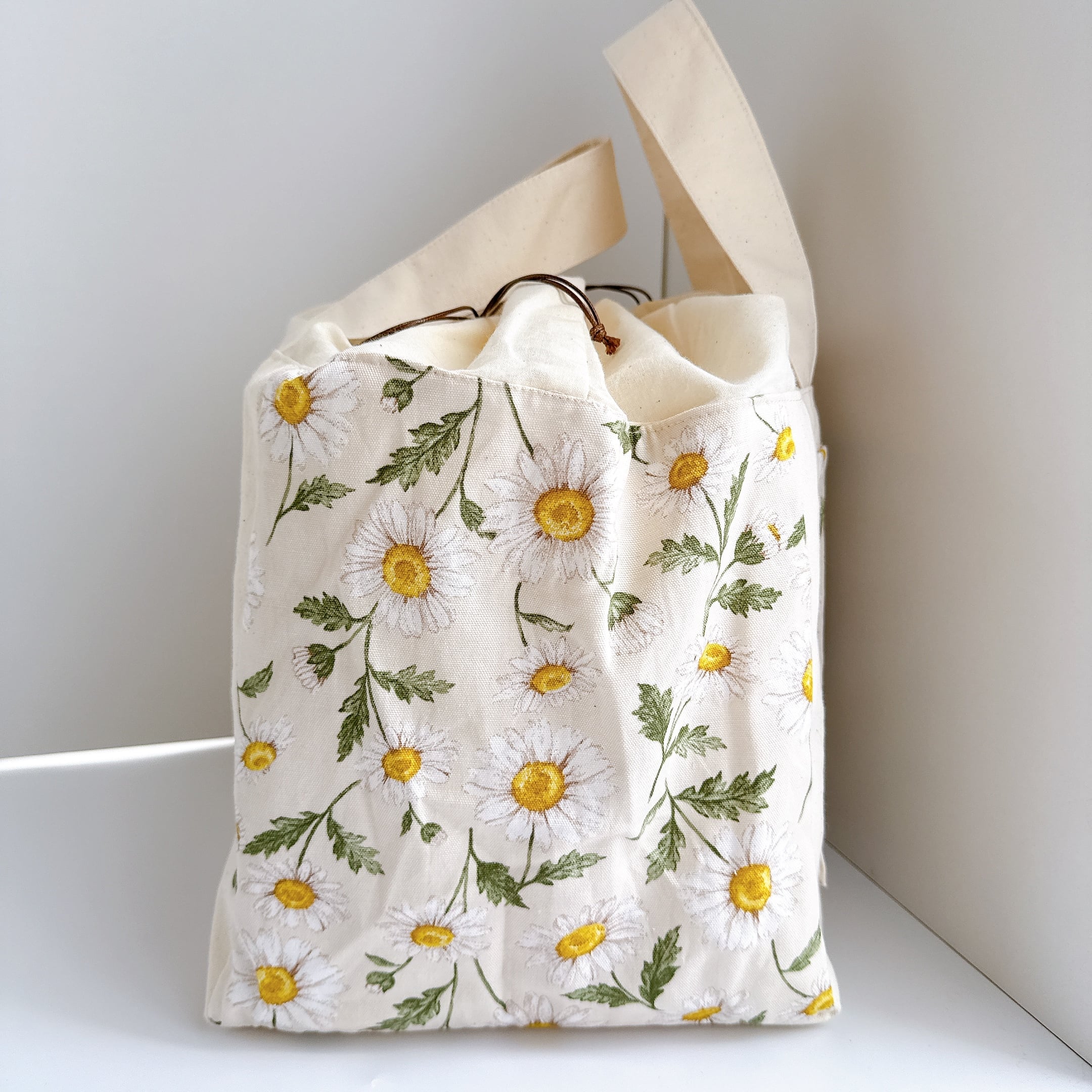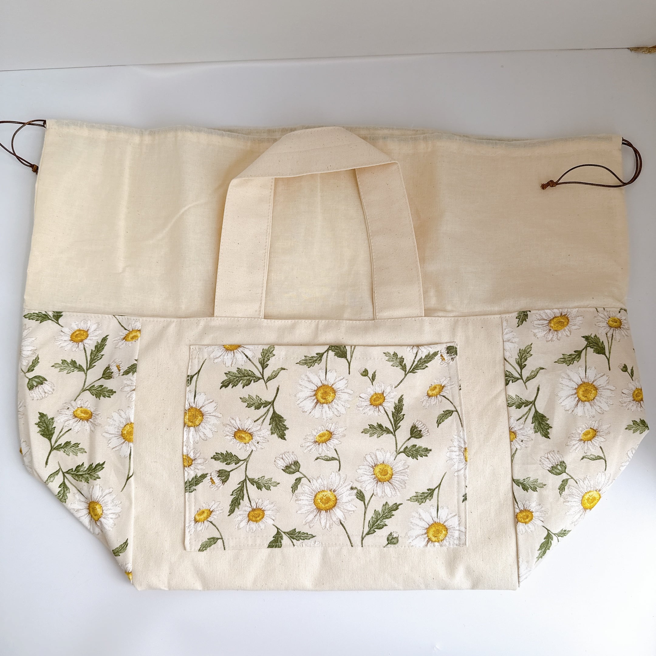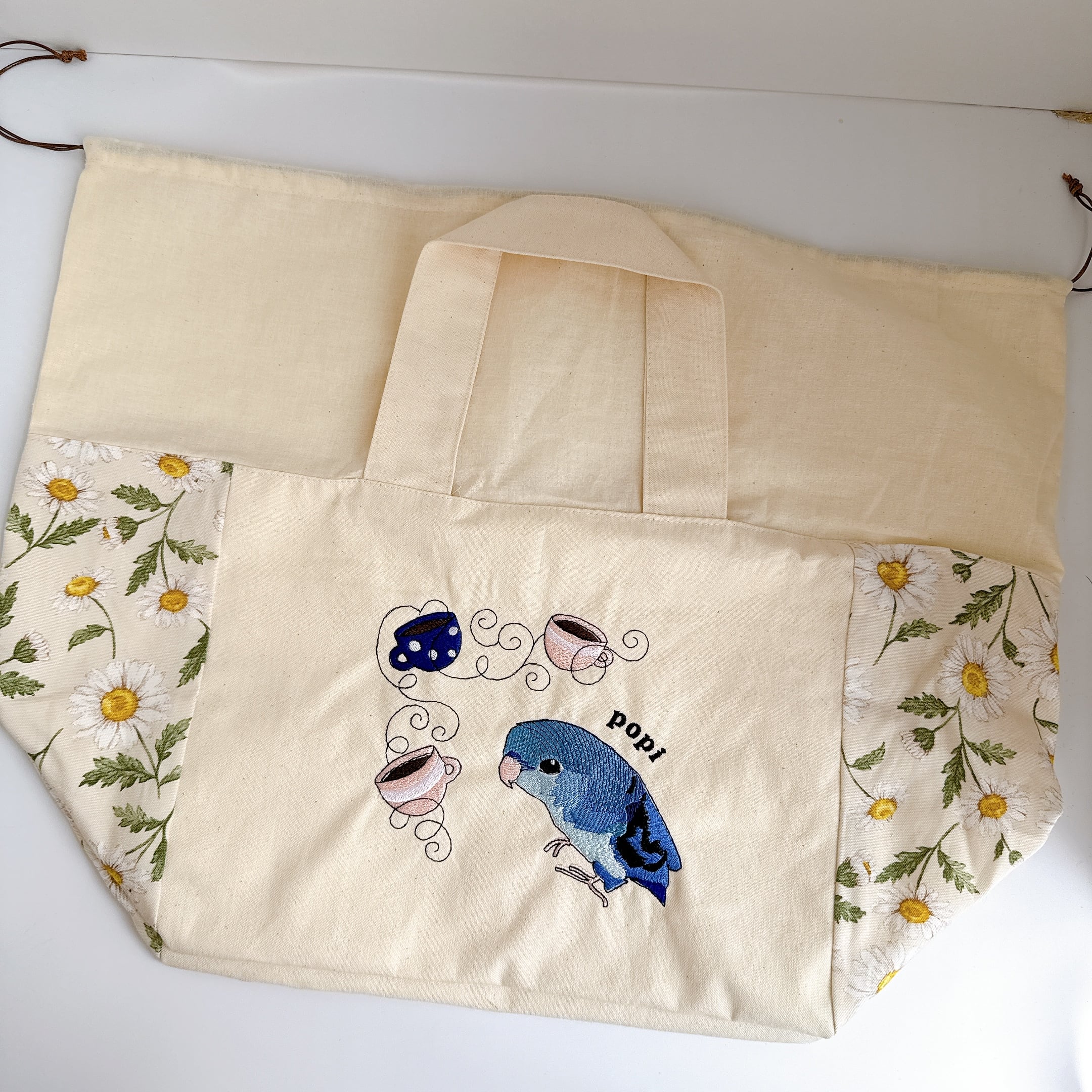 開口部の布は裏布と同じシーチングを使用しました。布が柔らかいので巾着が絞りやすく、小鳥さんの出し入れも安心で統一感も抜群です♪