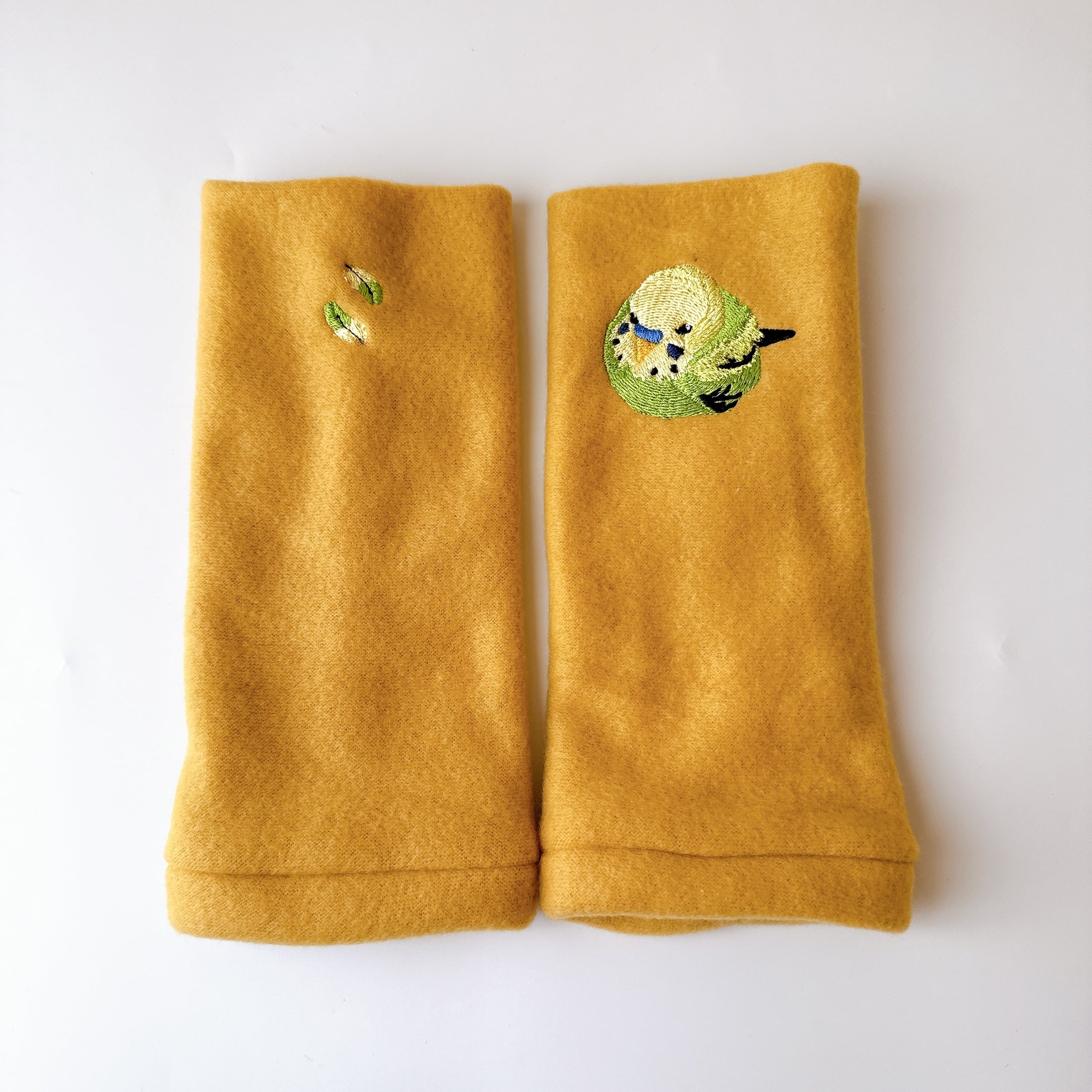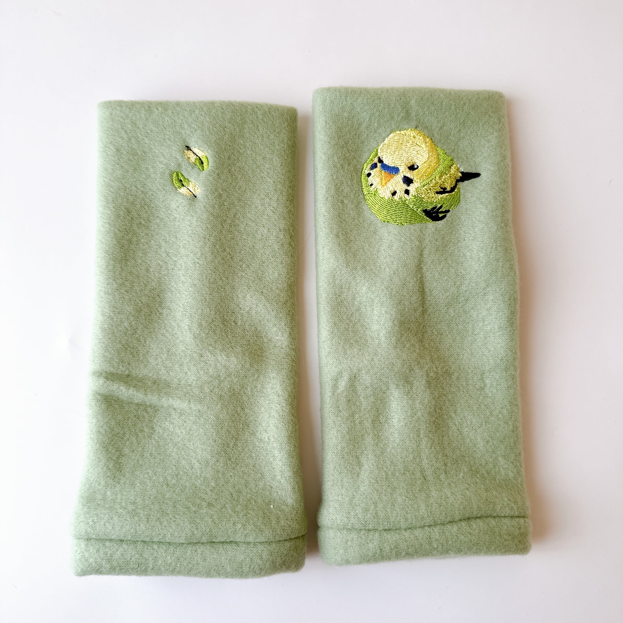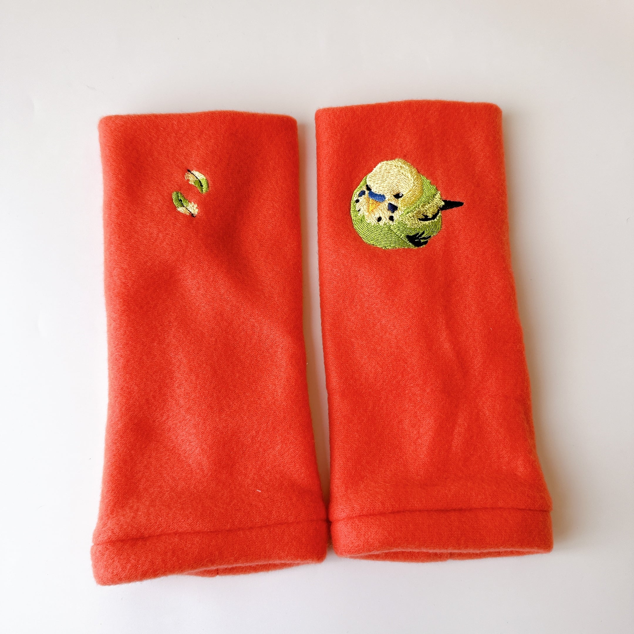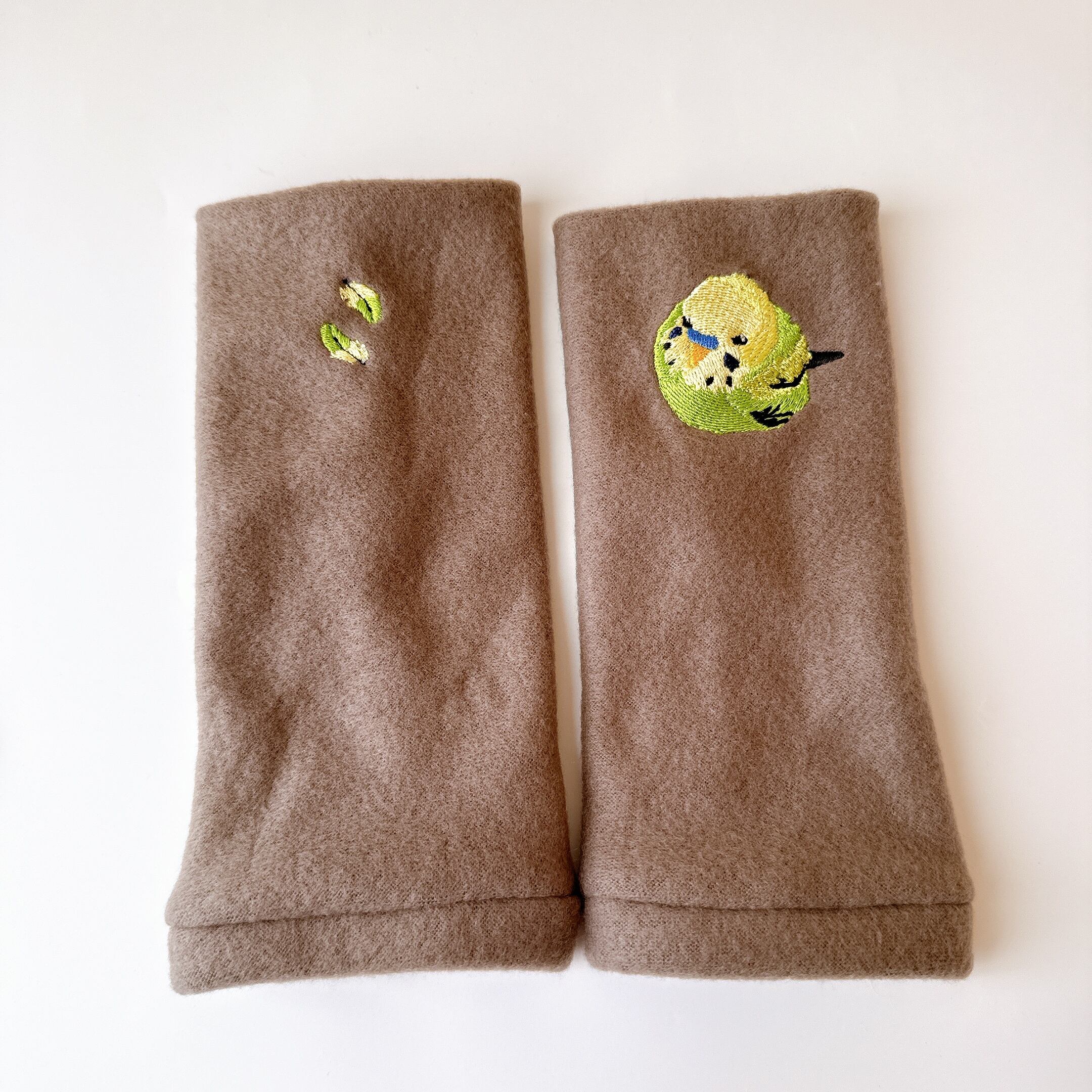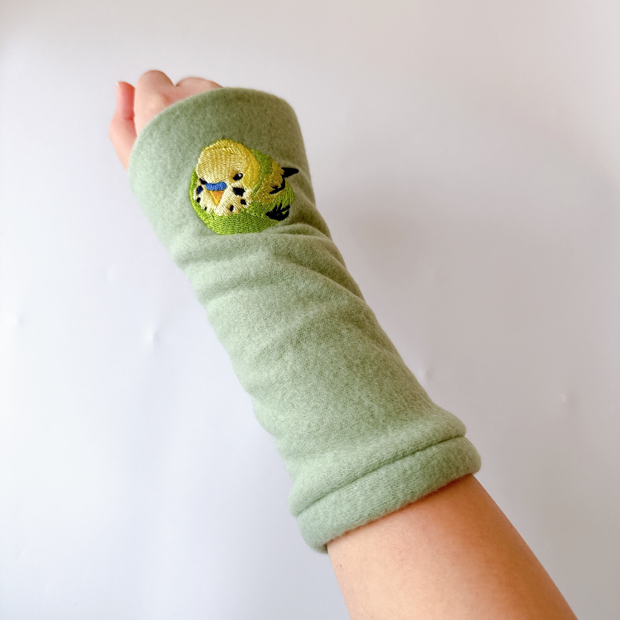 手の甲に座っているセキセイインコさんと目が合うようなデザインになっているハンド&リストウォーマーです^ ^