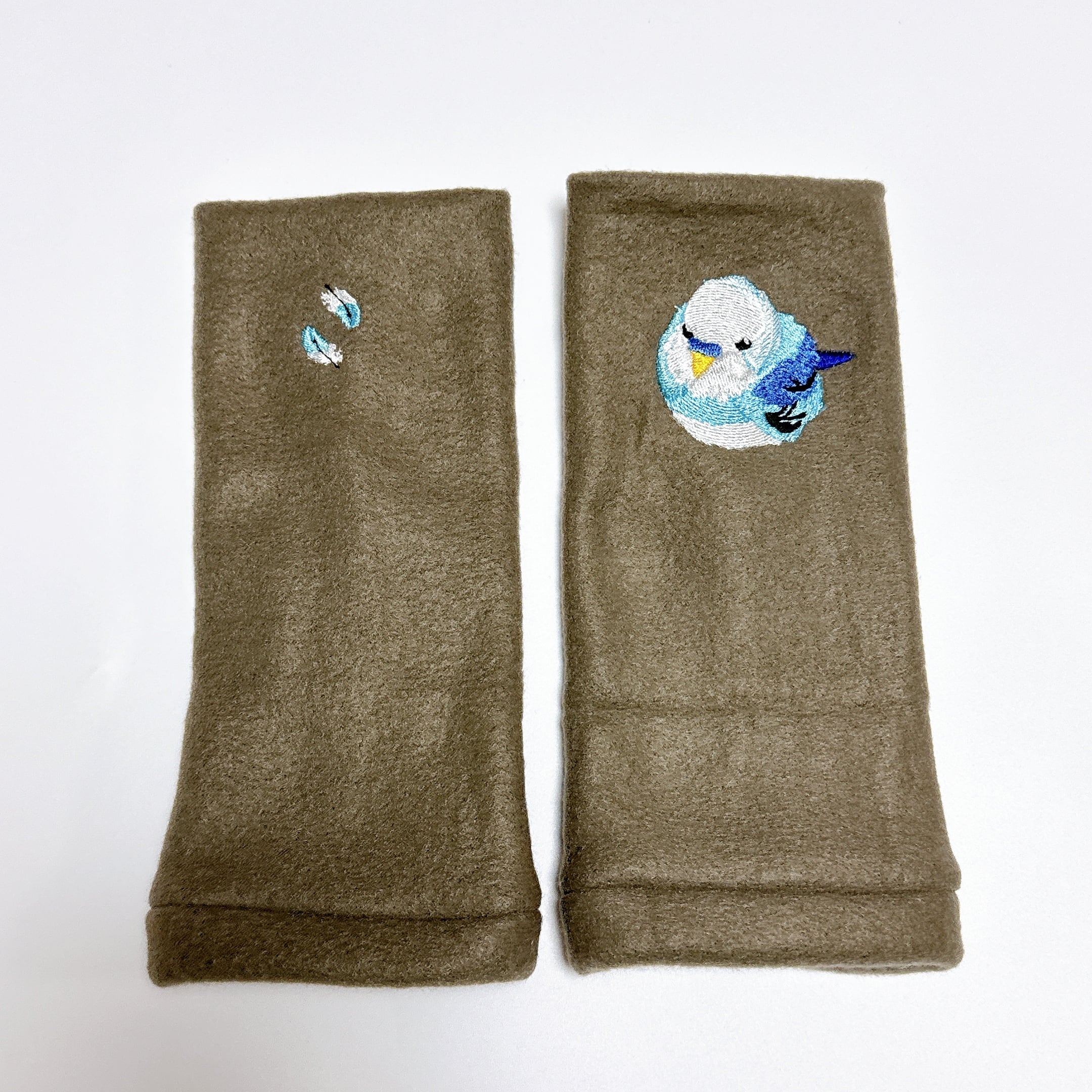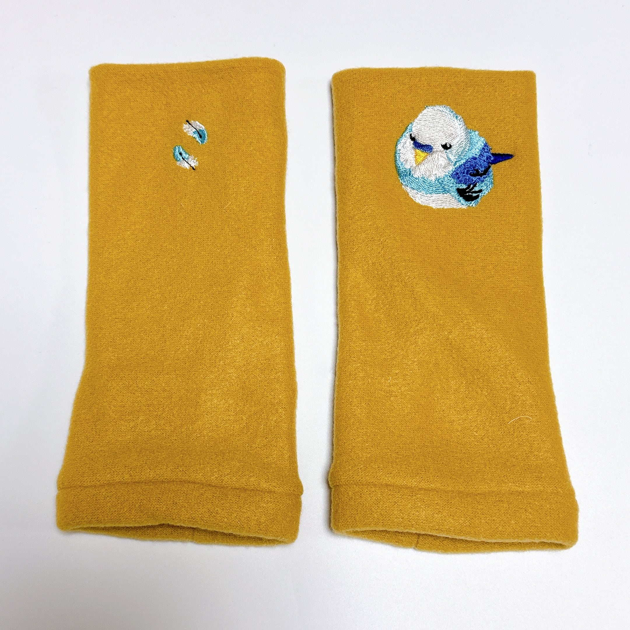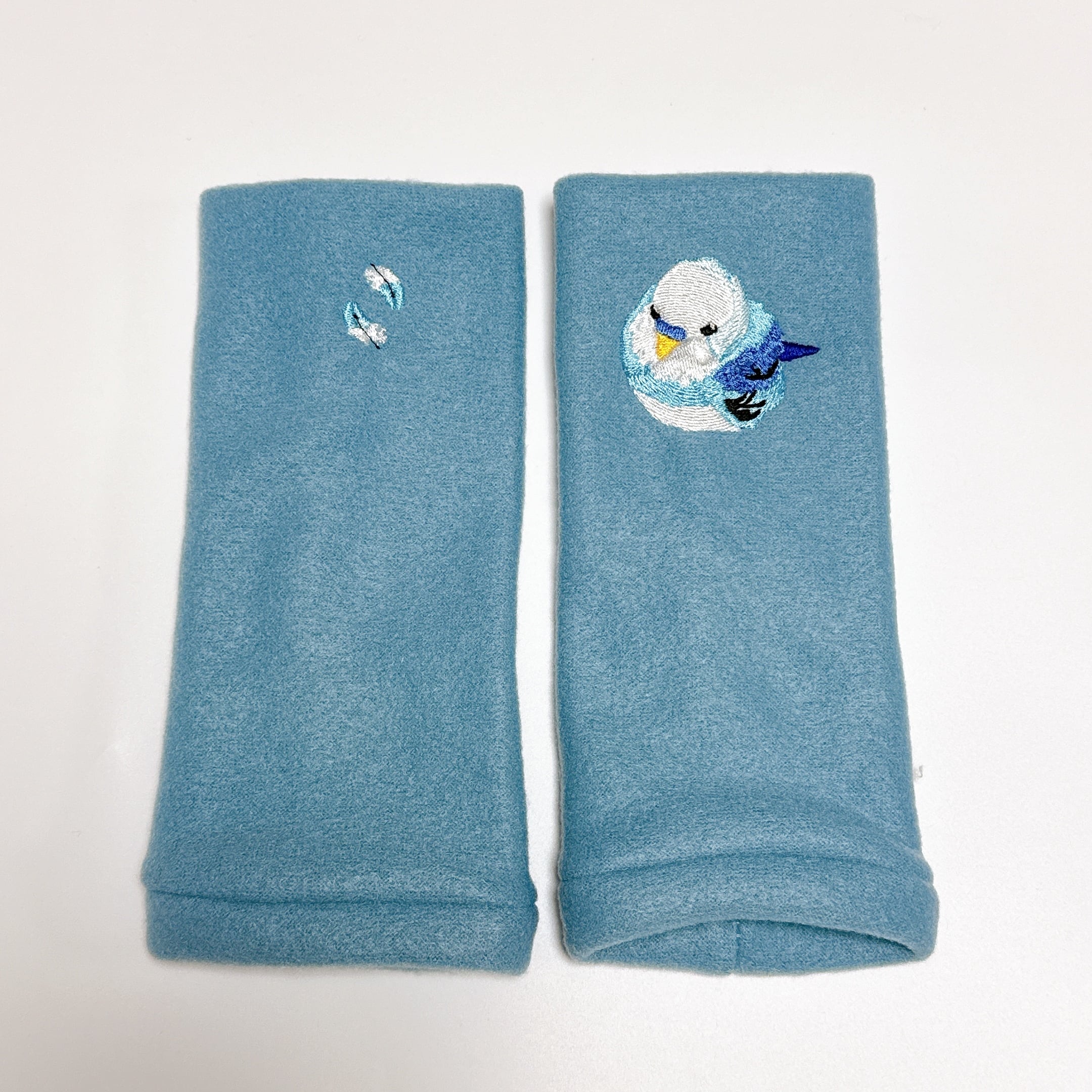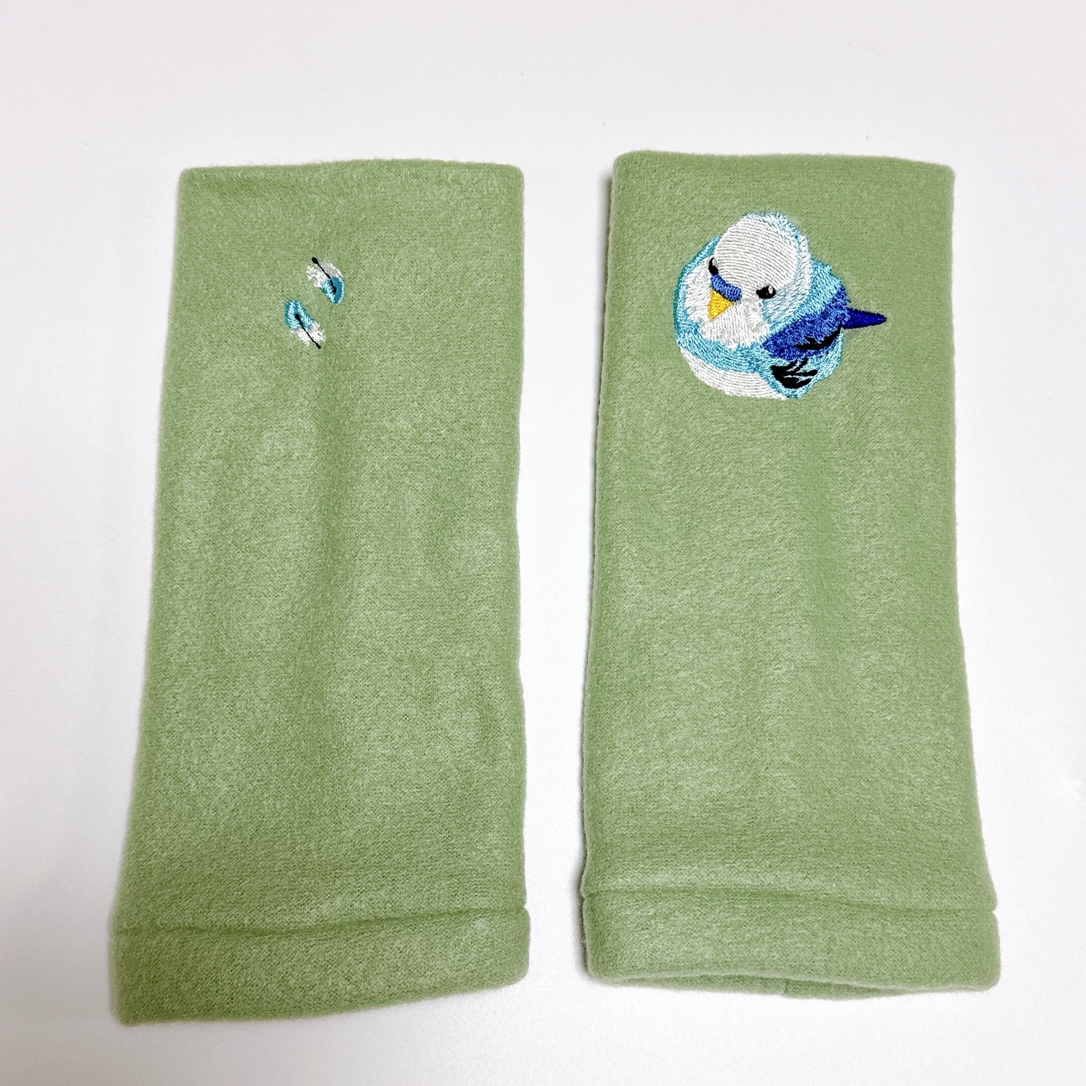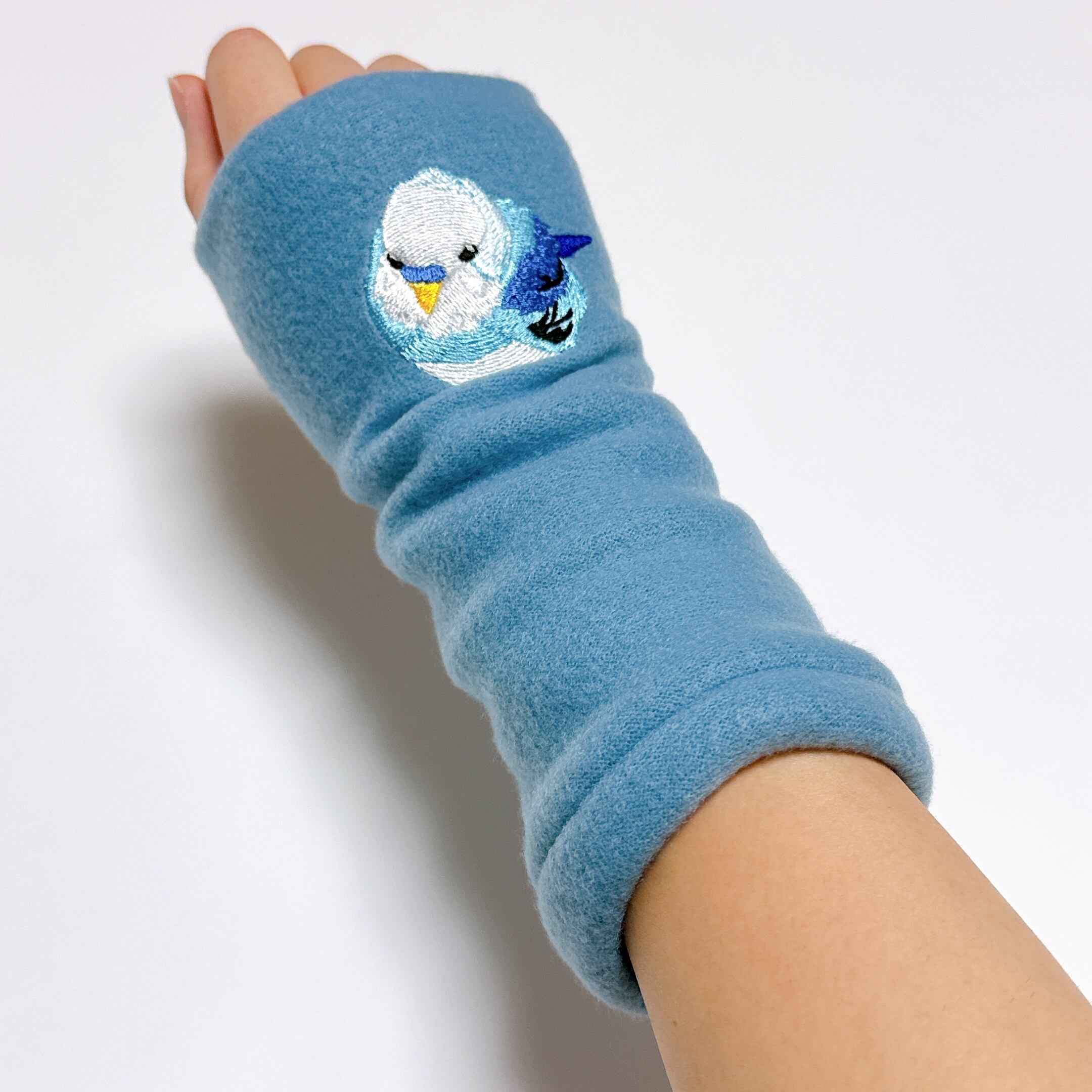手の甲に座っているセキセイインコさんと目が合うようなデザインになっているハンド&リストウォーマーです^ ^