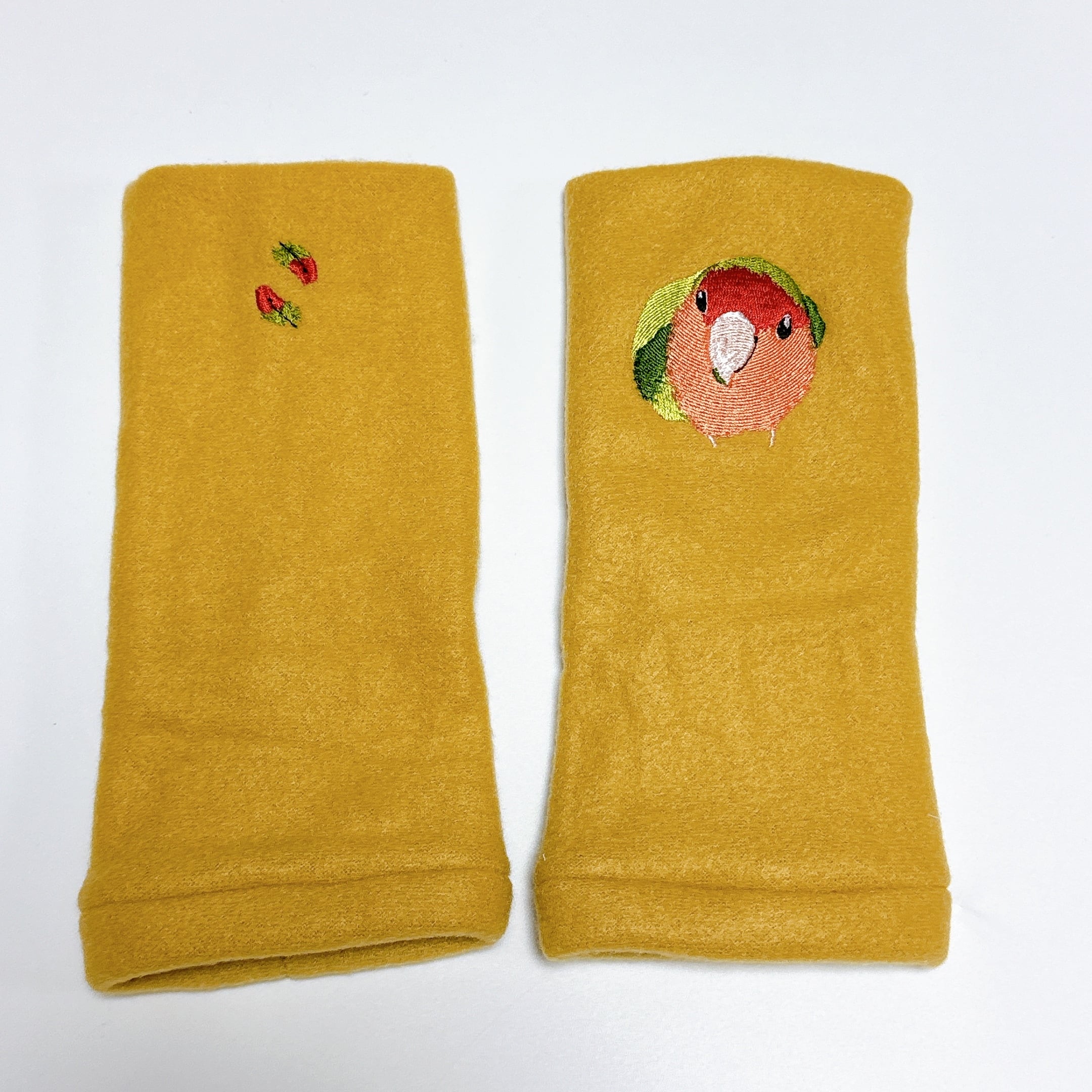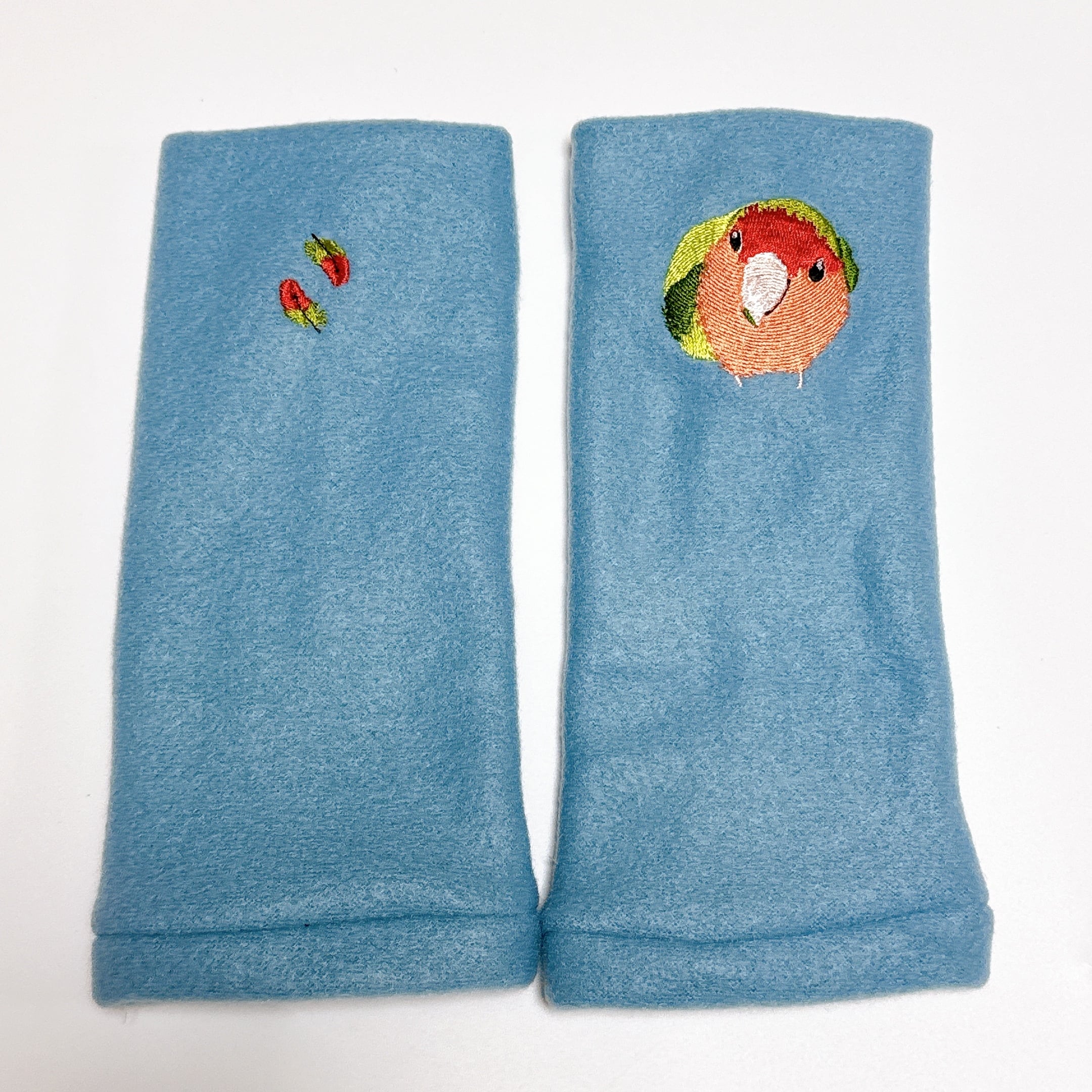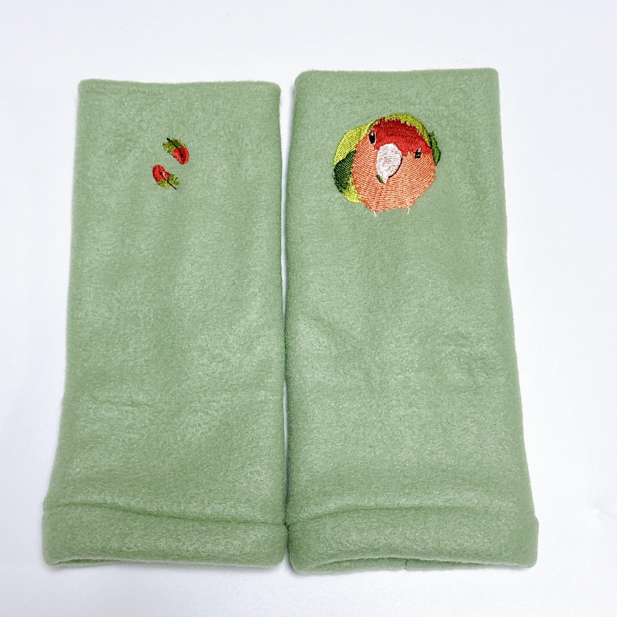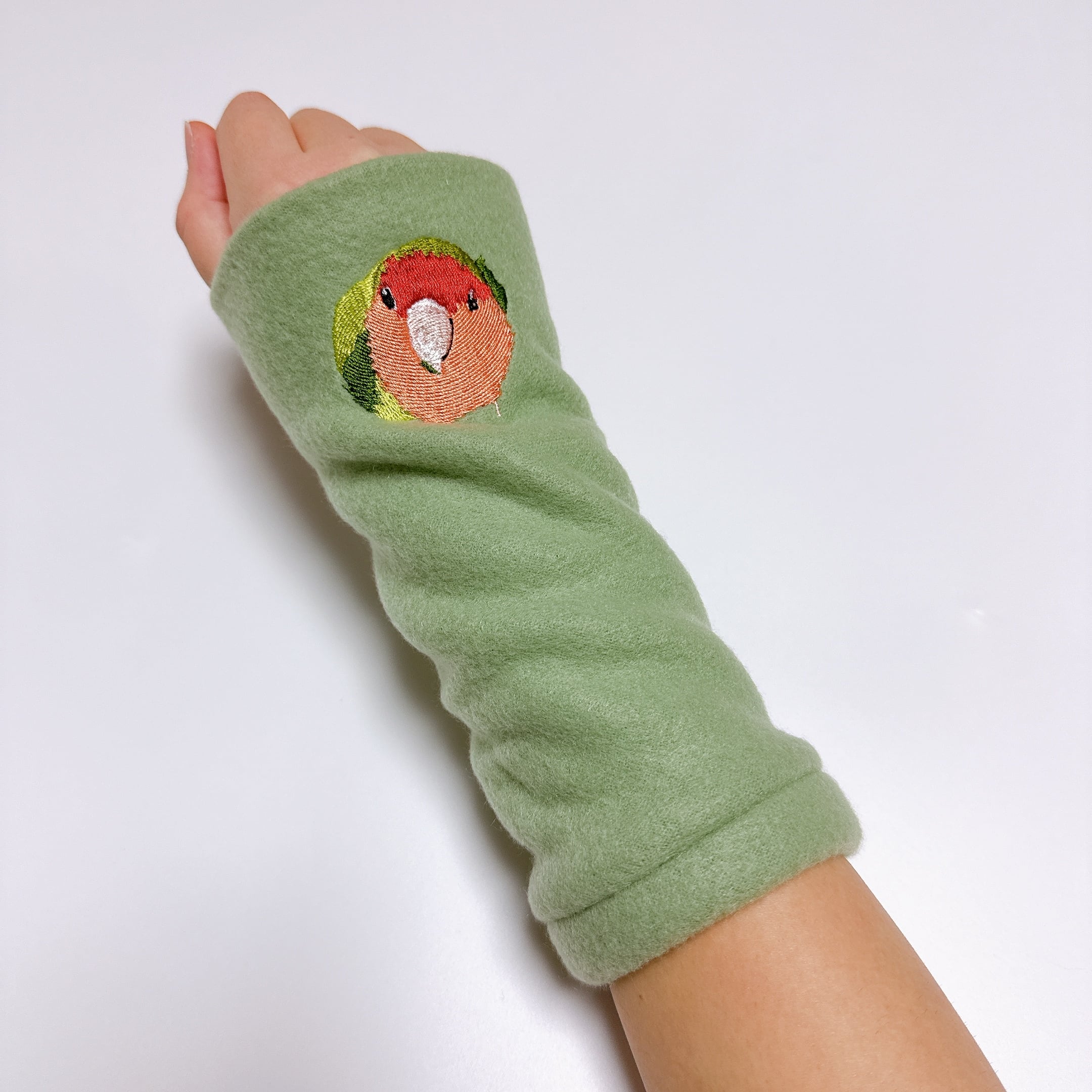 手の甲に座っているコザクラインコさんと目が合うようなデザインになっているハンド&リストウォーマーです^ ^