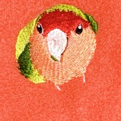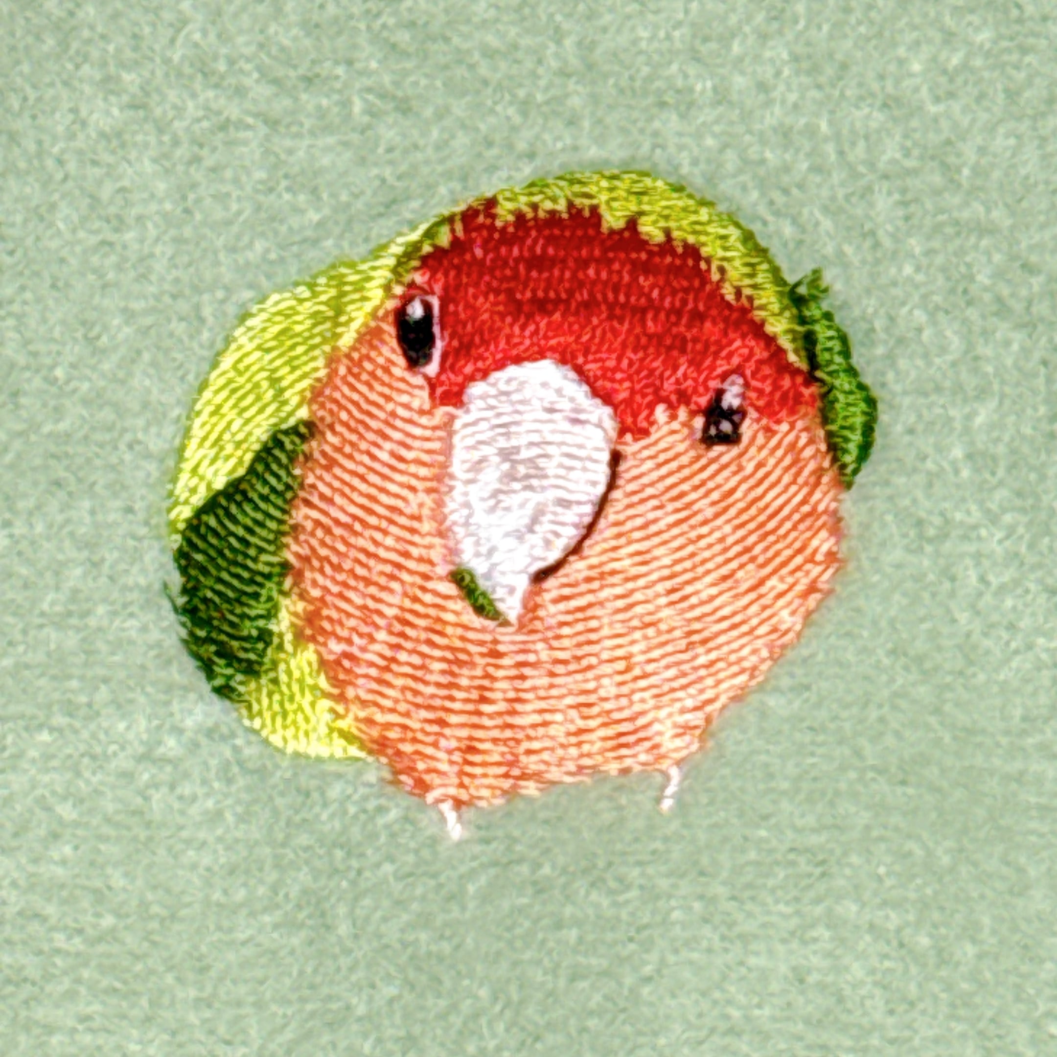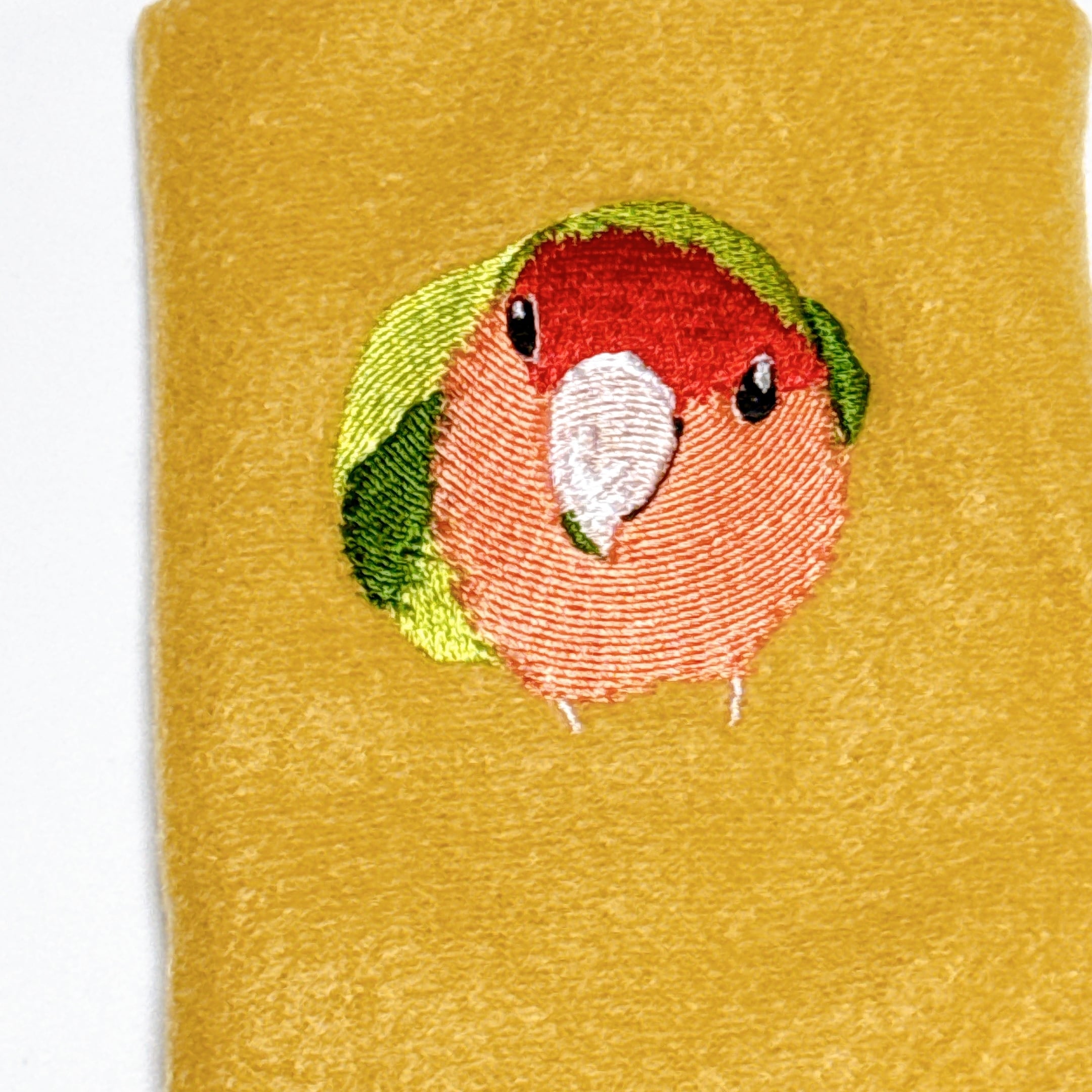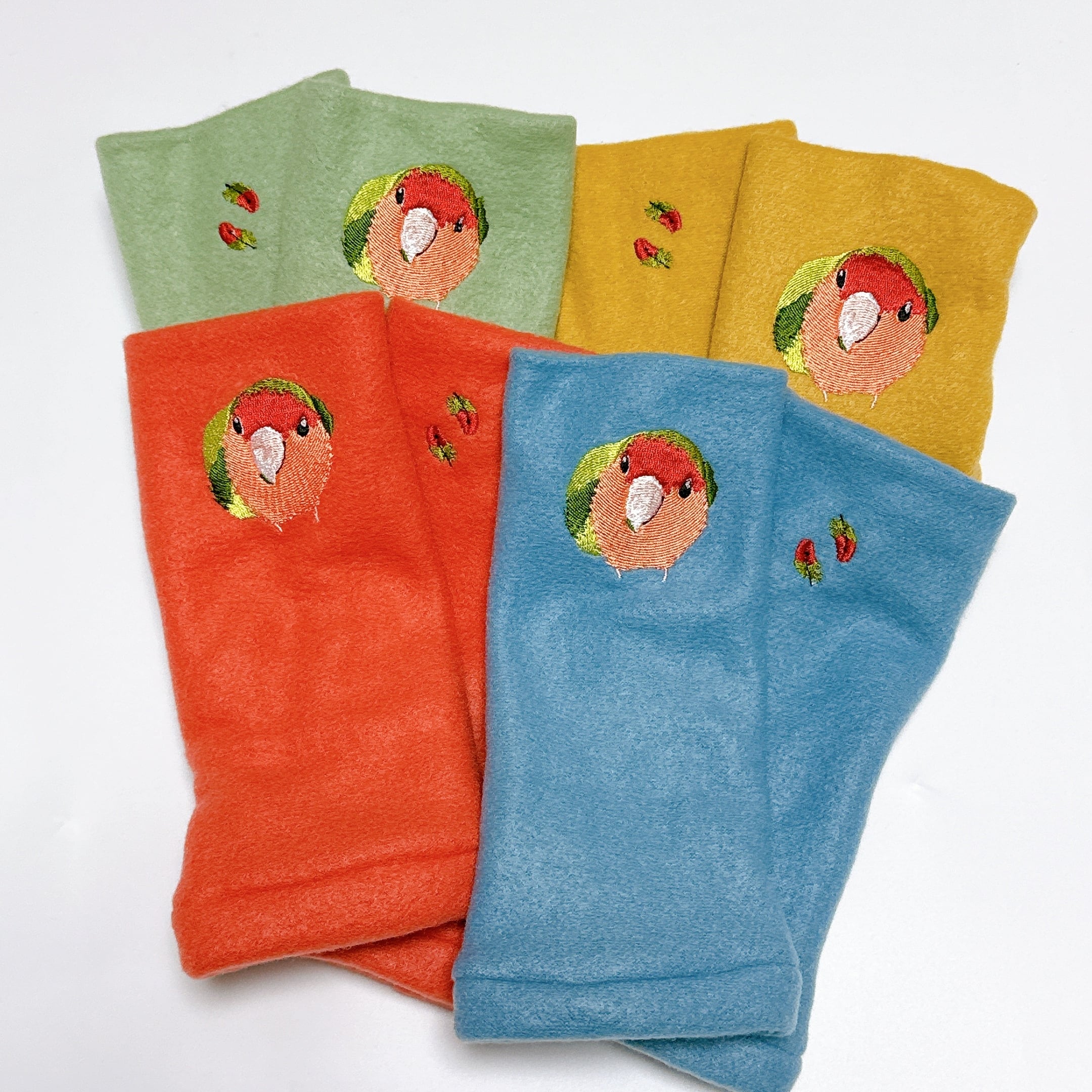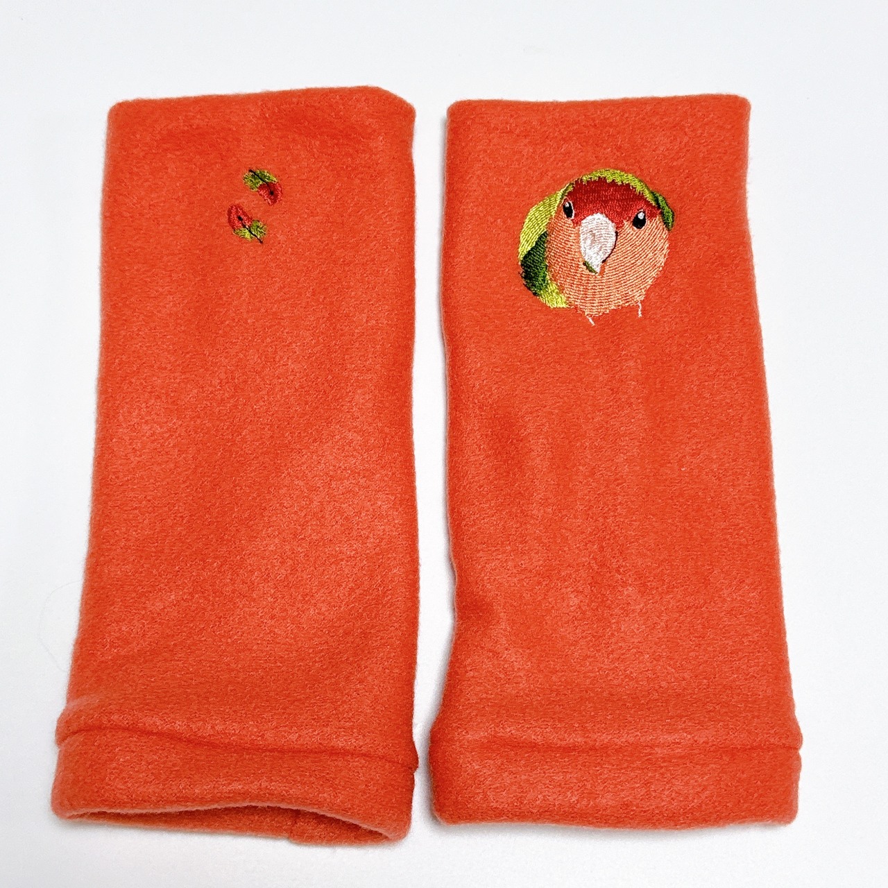 手の甲に座っているコザクラインコさんと目が合うようなデザインになっているハンド&リストウォーマーです^ ^