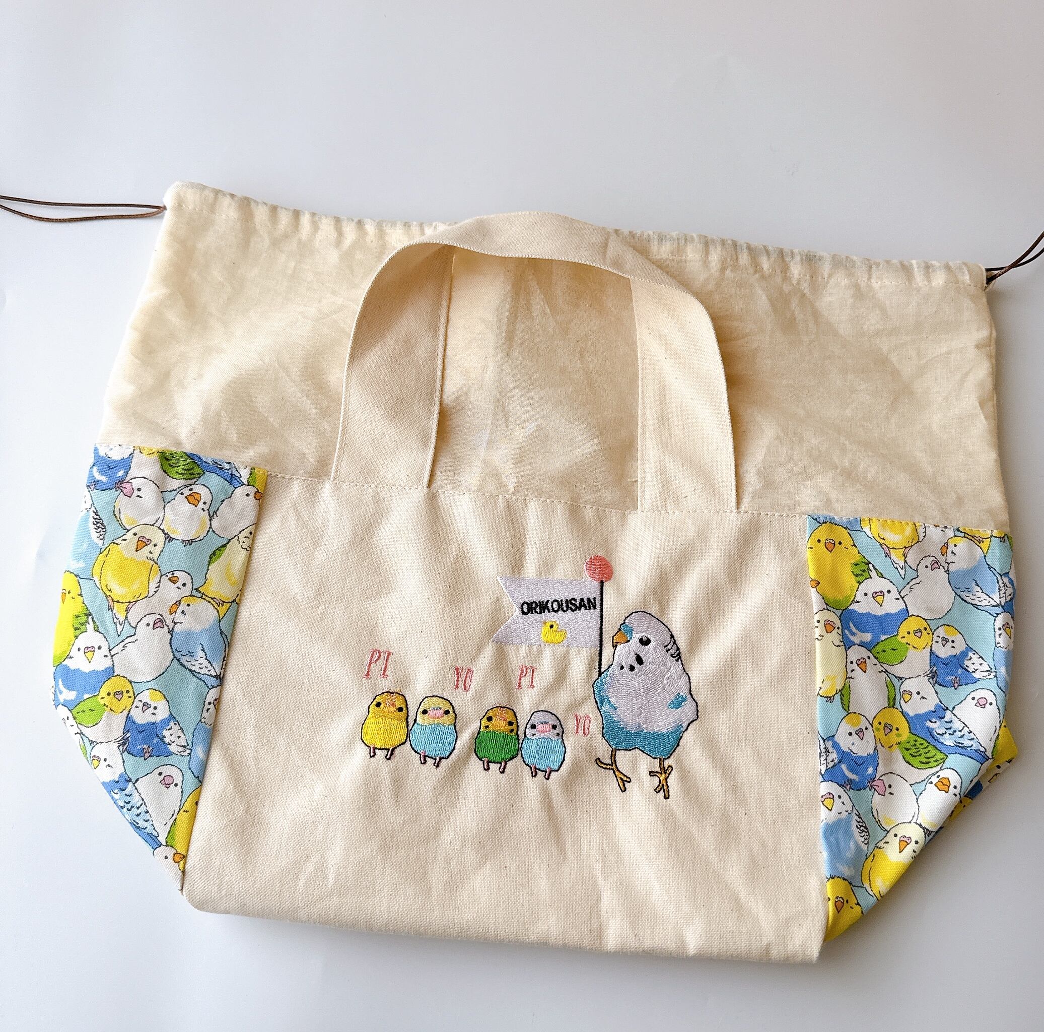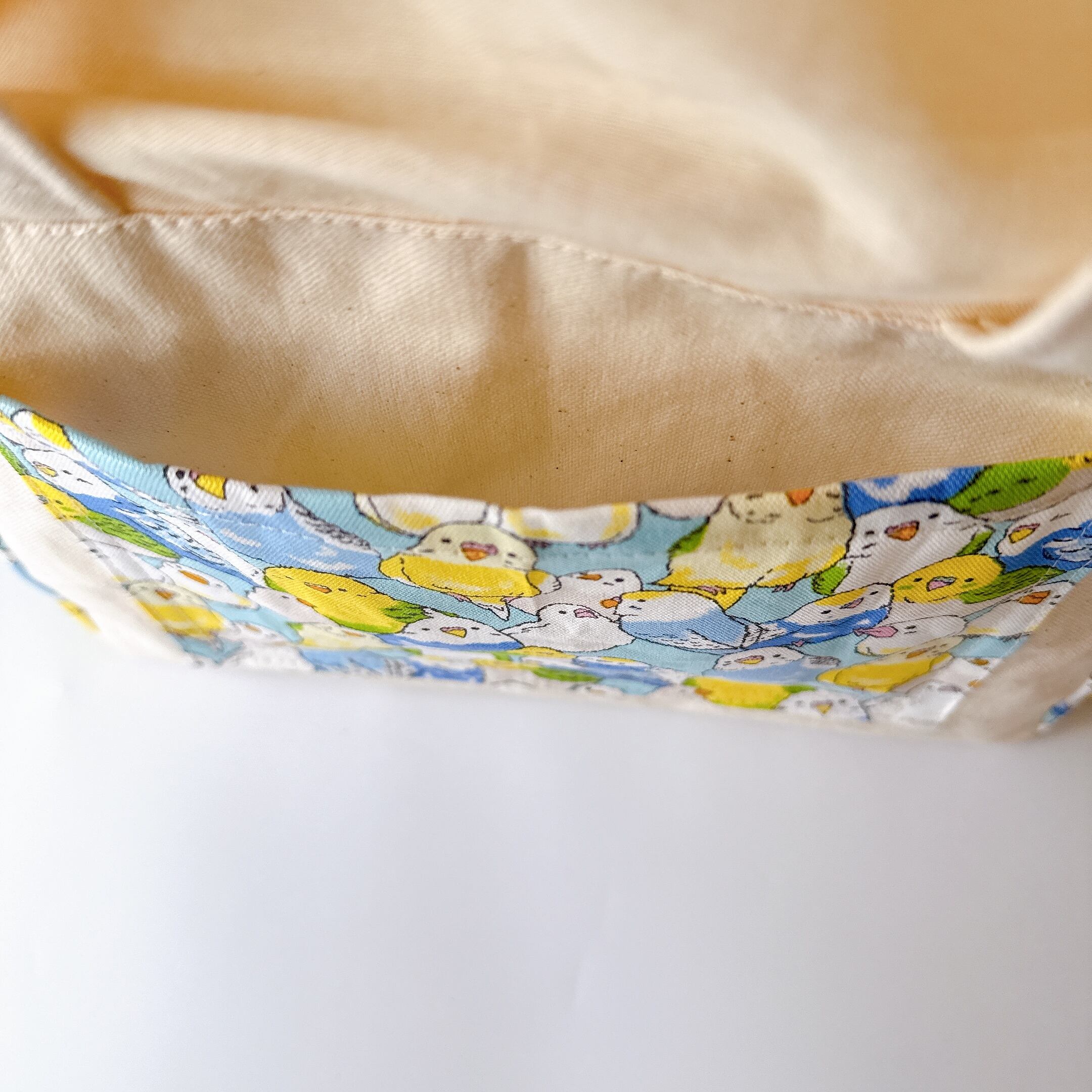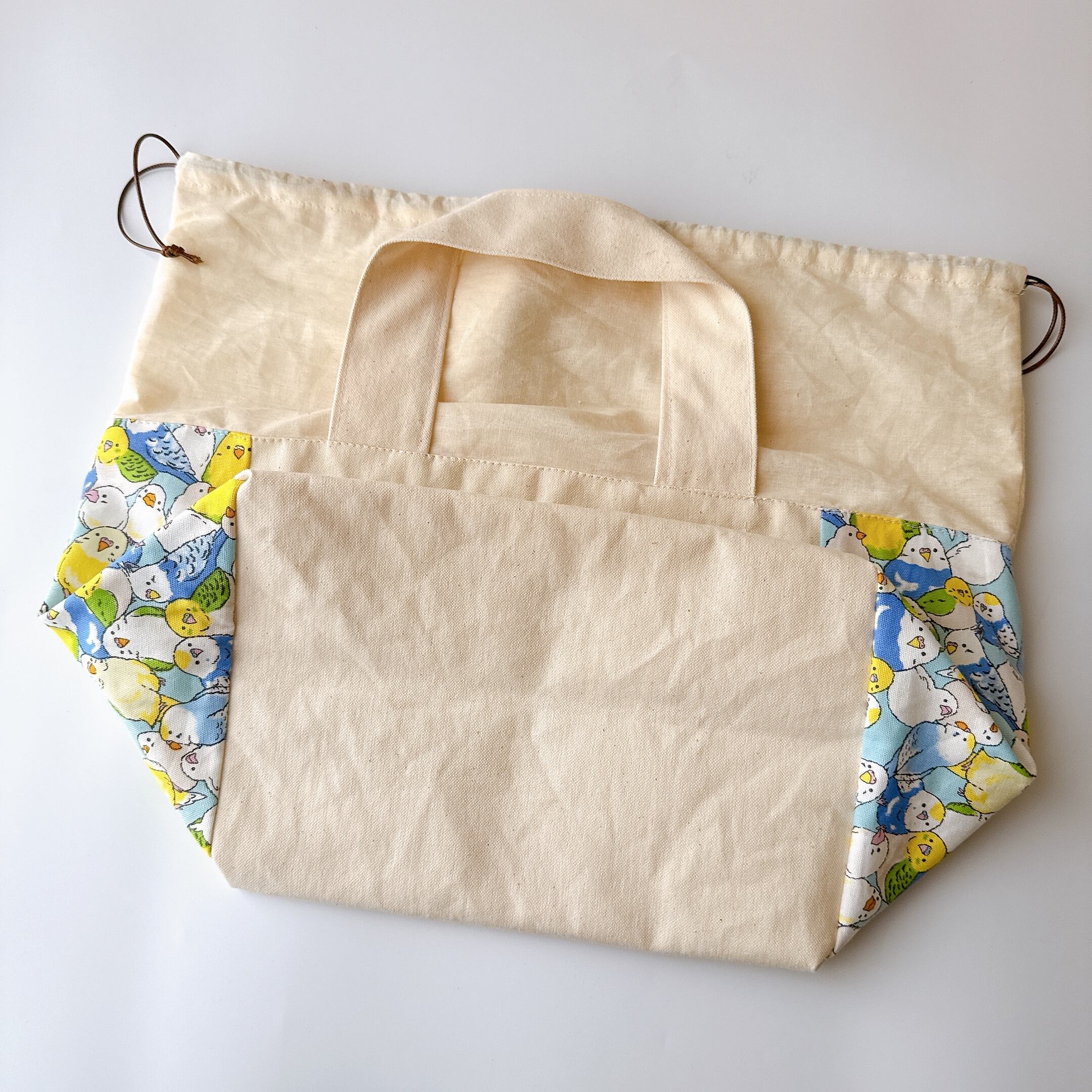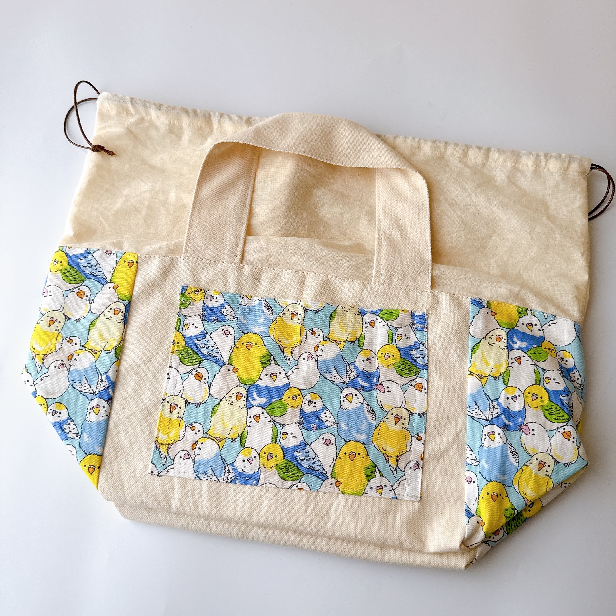 開口部の布は裏布と同じシーチングを使用しました。布が柔らかいので巾着が絞りやすく、小鳥さんの出し入れも安心で統一感も抜群です♪