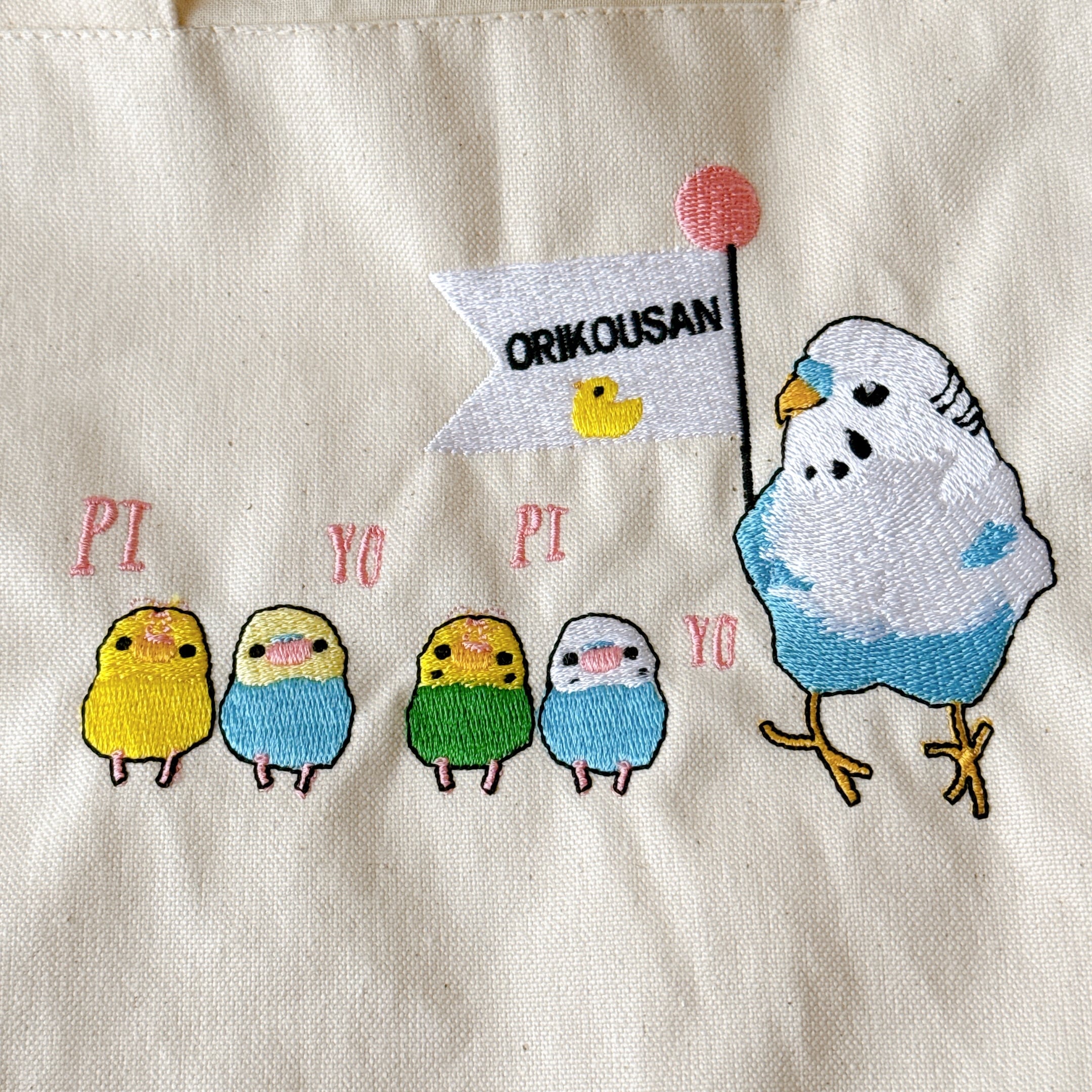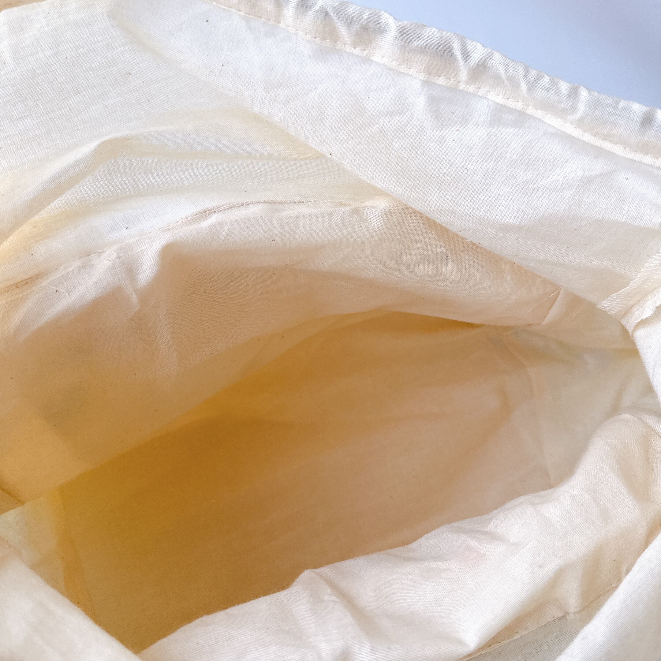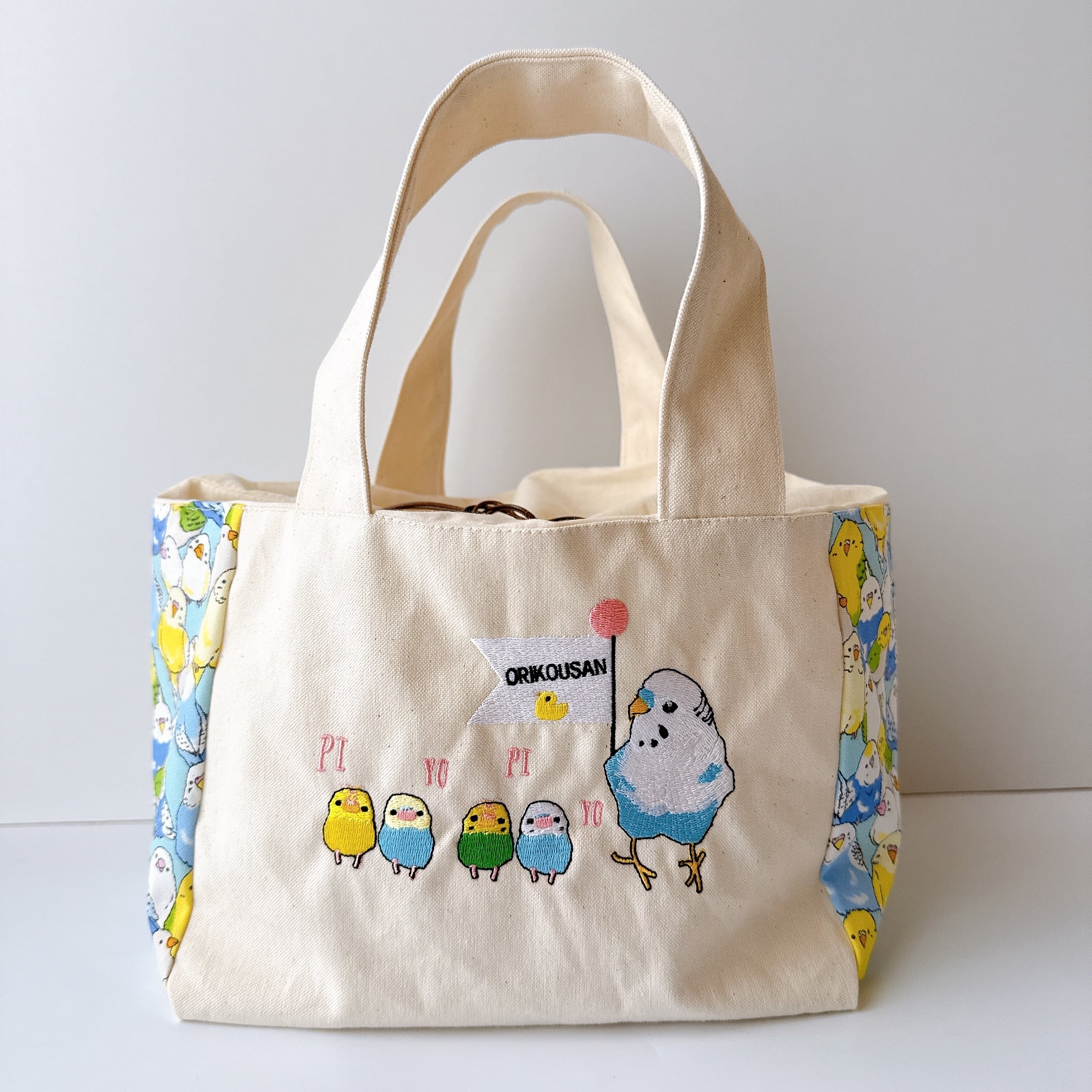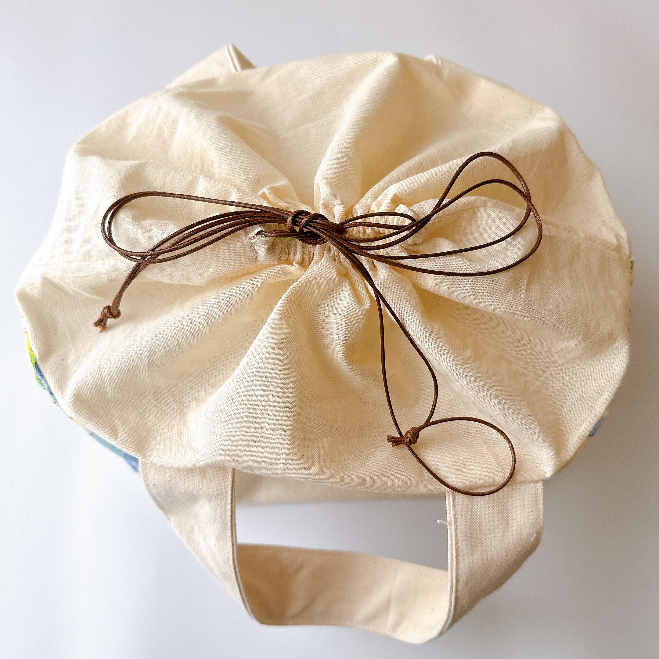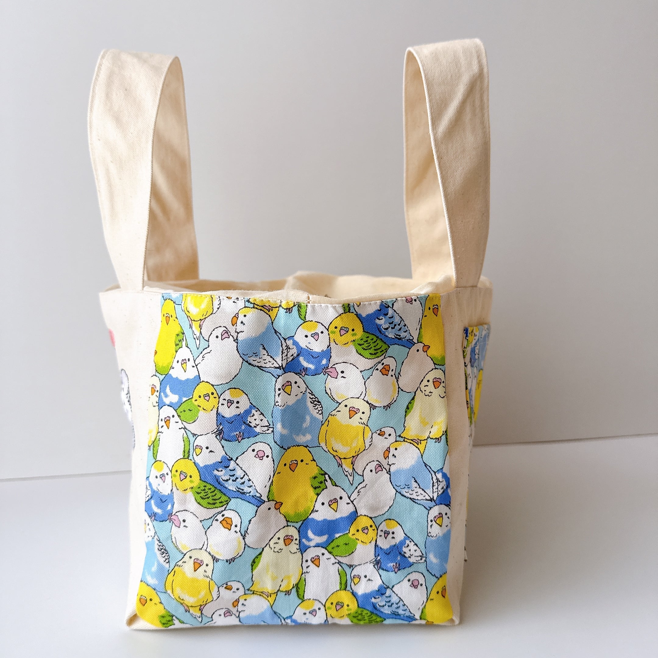 開口部の布は裏布と同じシーチングを使用しました。布が柔らかいので巾着が絞りやすく、小鳥さんの出し入れも安心で統一感も抜群です♪