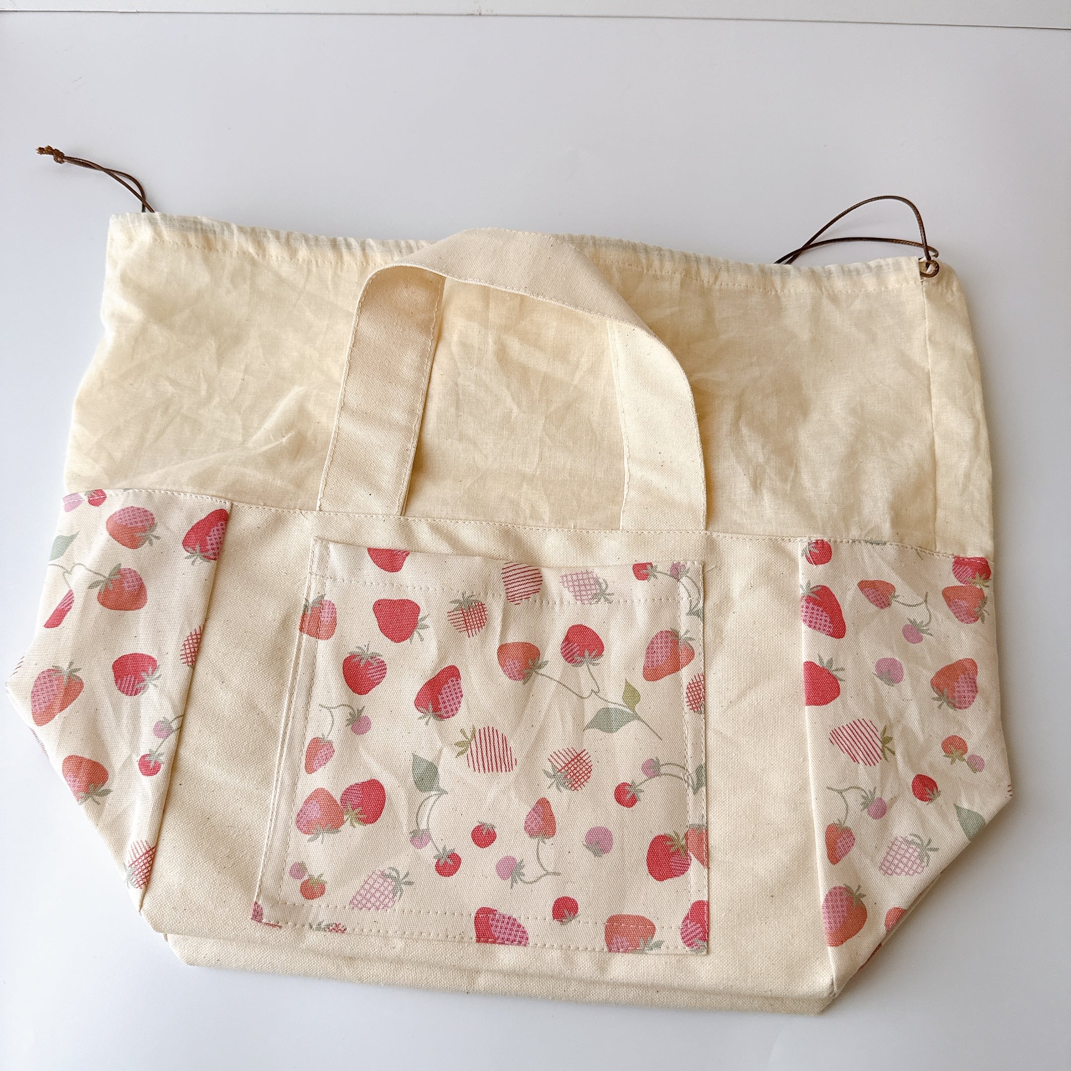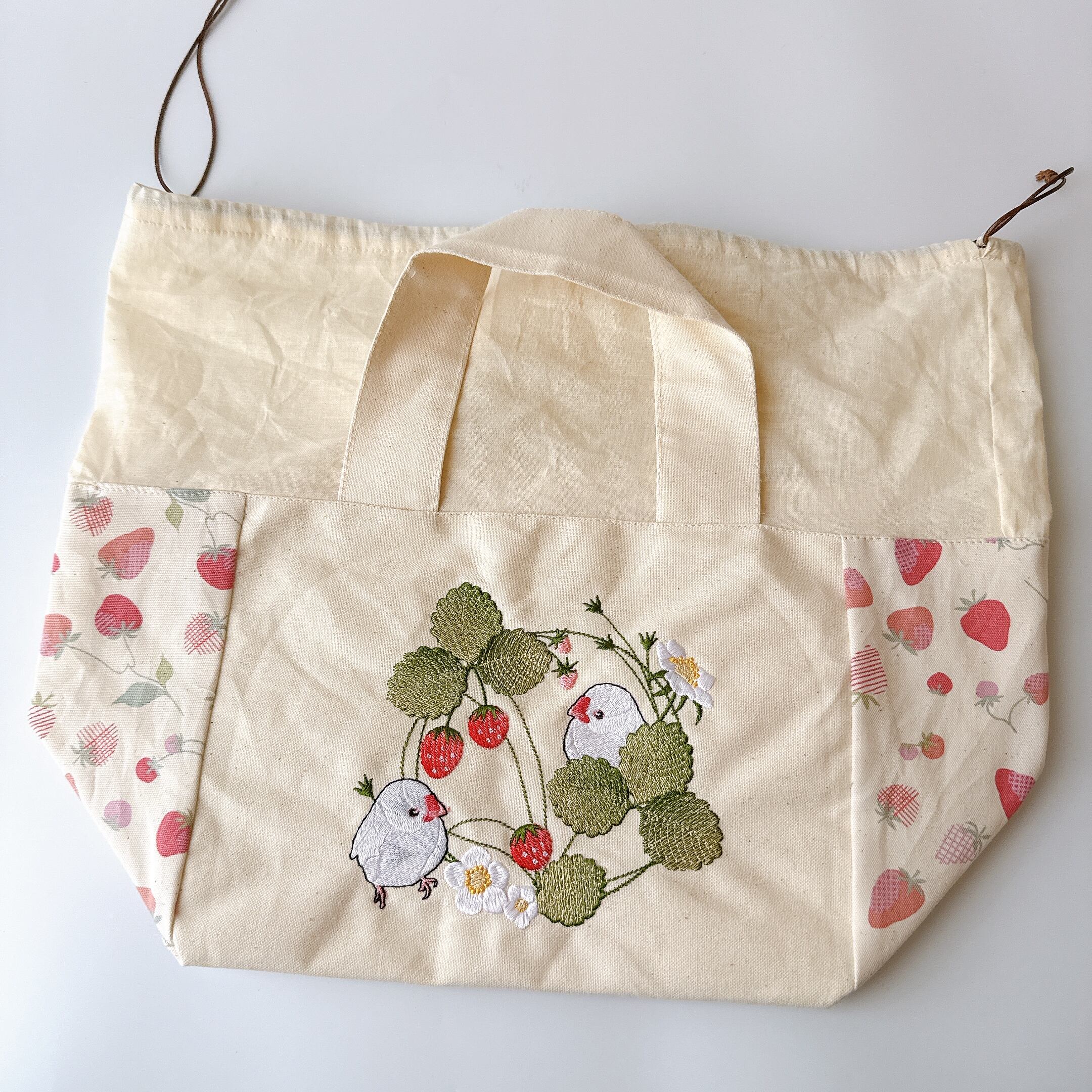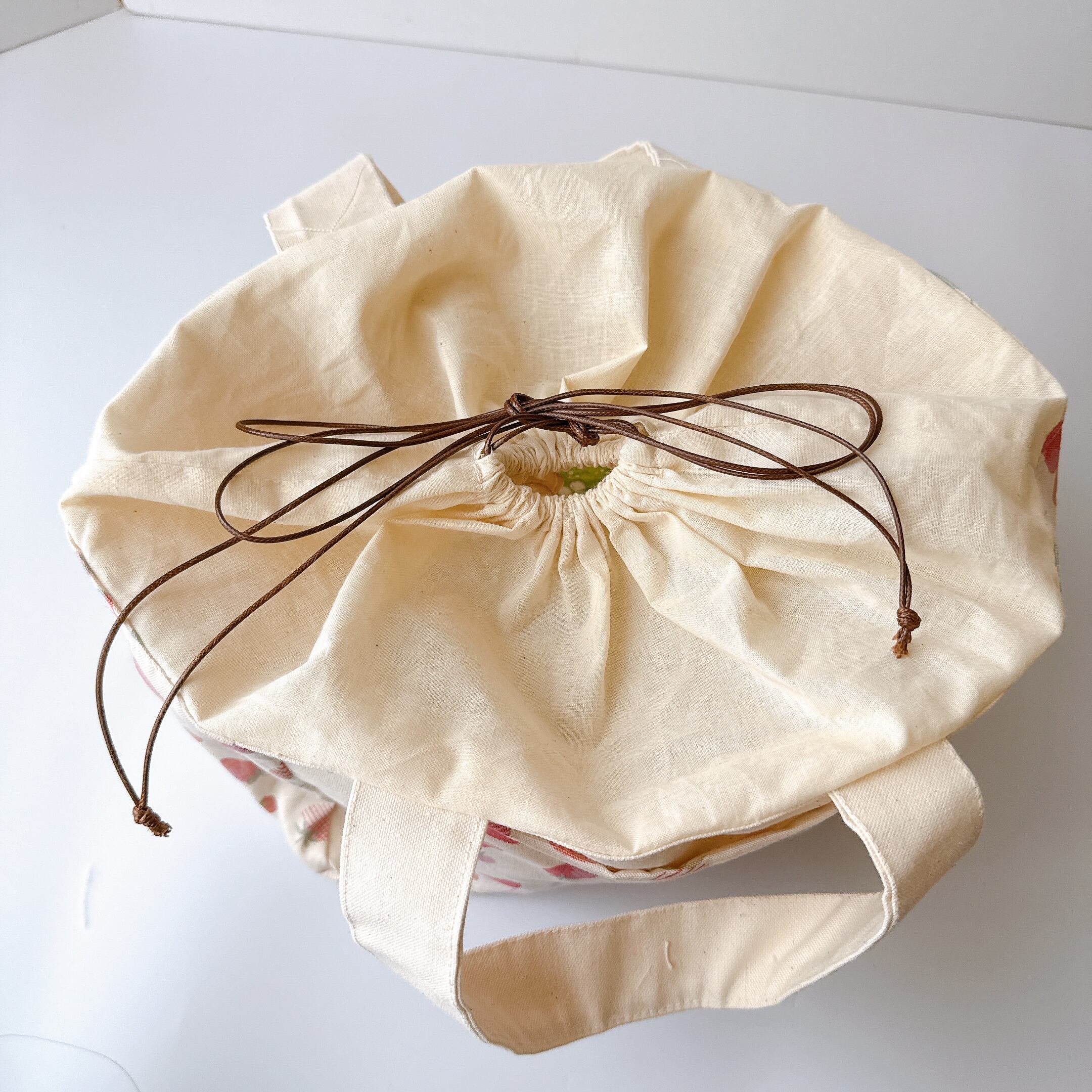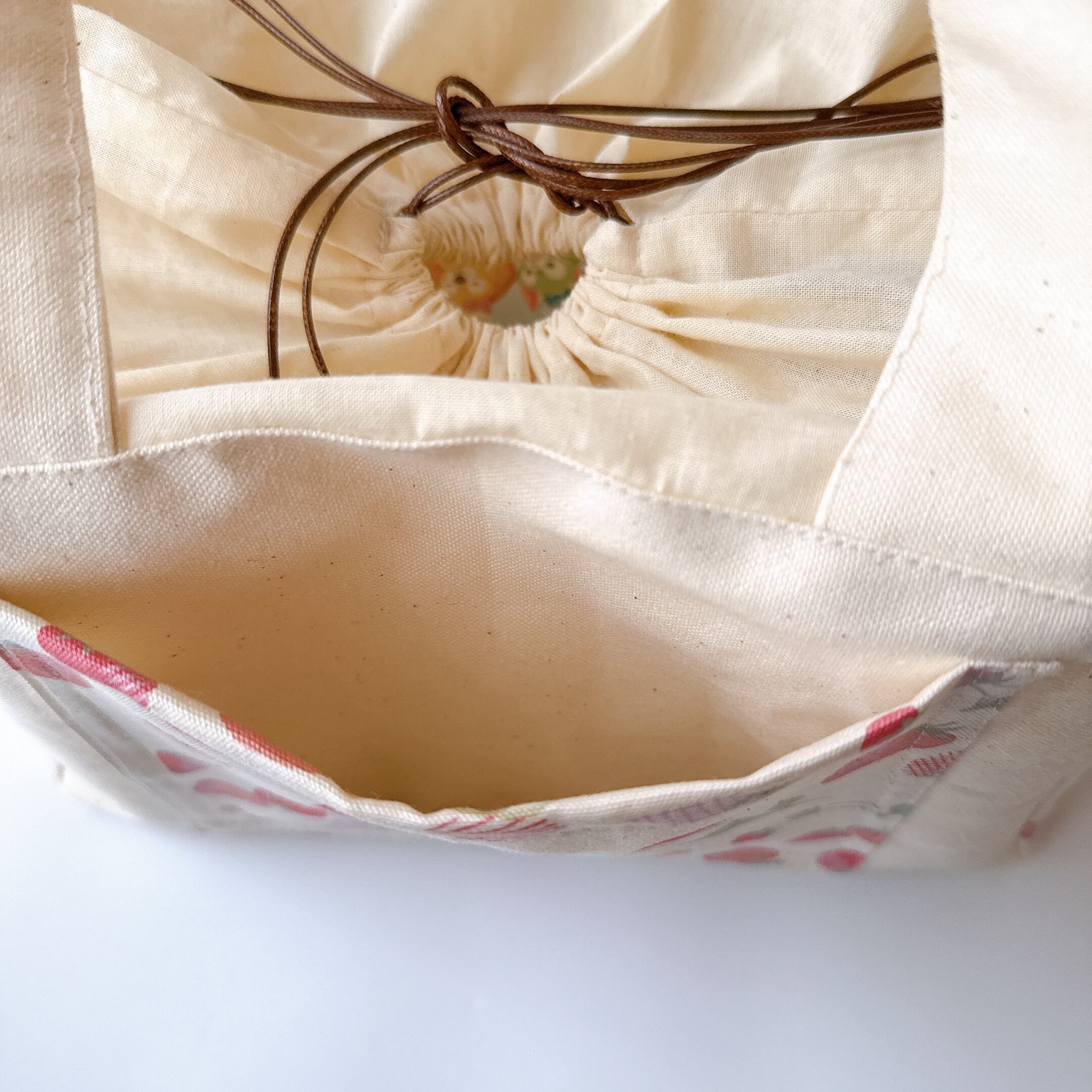 開口部の布は裏布と同じシーチングを使用しました。布が柔らかいので巾着が絞りやすく、小鳥さんの出し入れも安心で統一感も抜群です♪