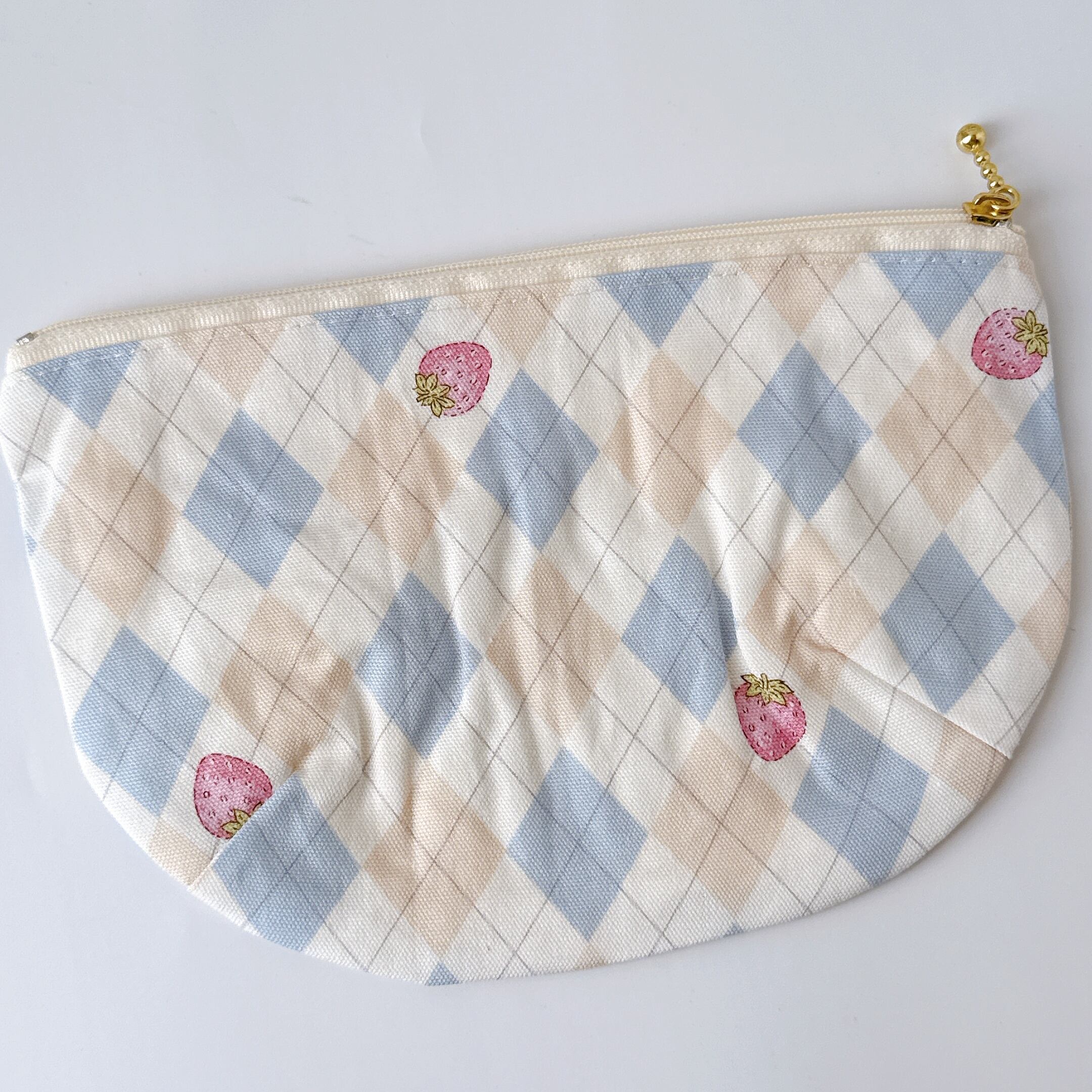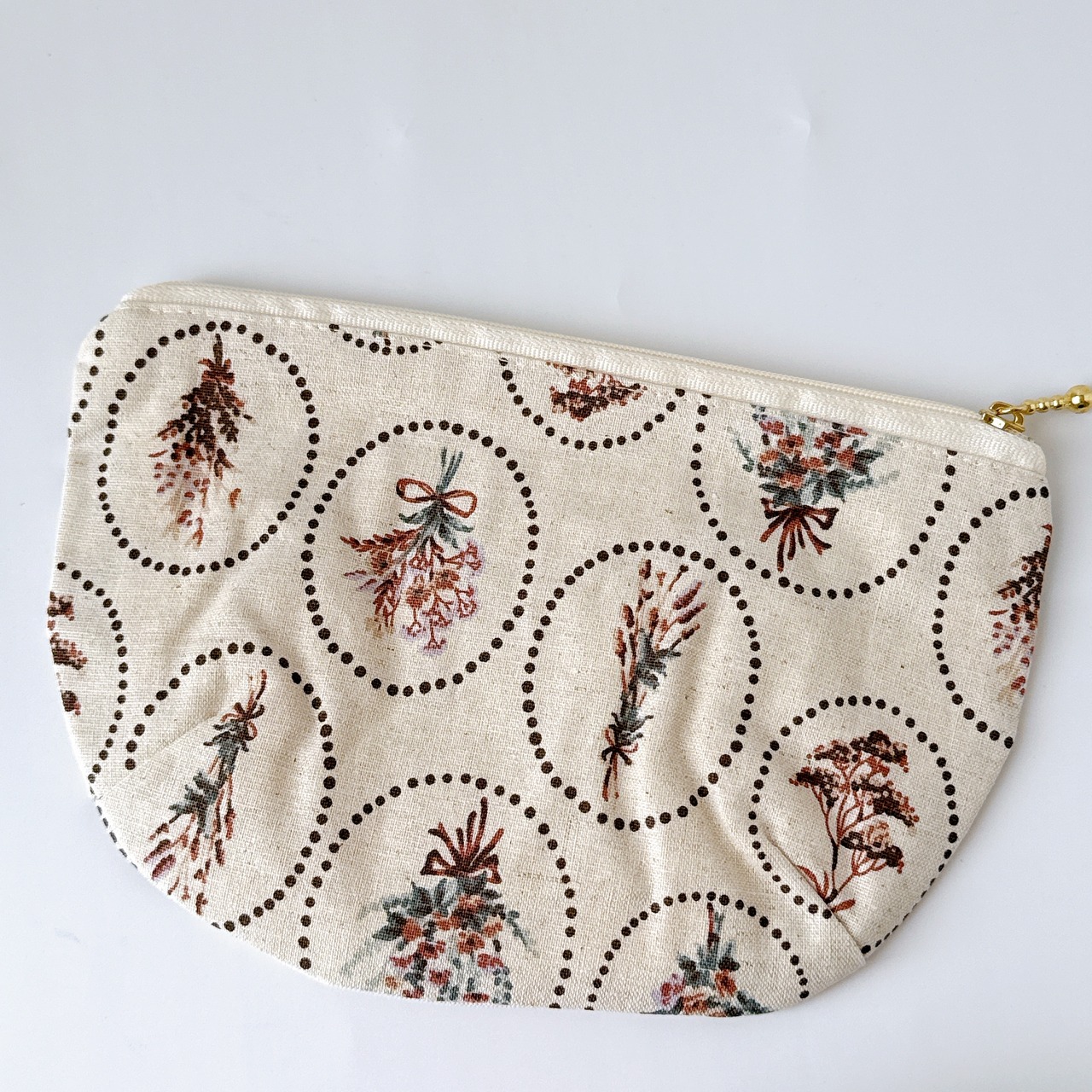 通帳がゆったりと入るポーチです。開口部は20㎝ファスナーを使用して底にはタックをとっていますので中身が確認しやすく、お化粧品を入れるのにもおススメです♪