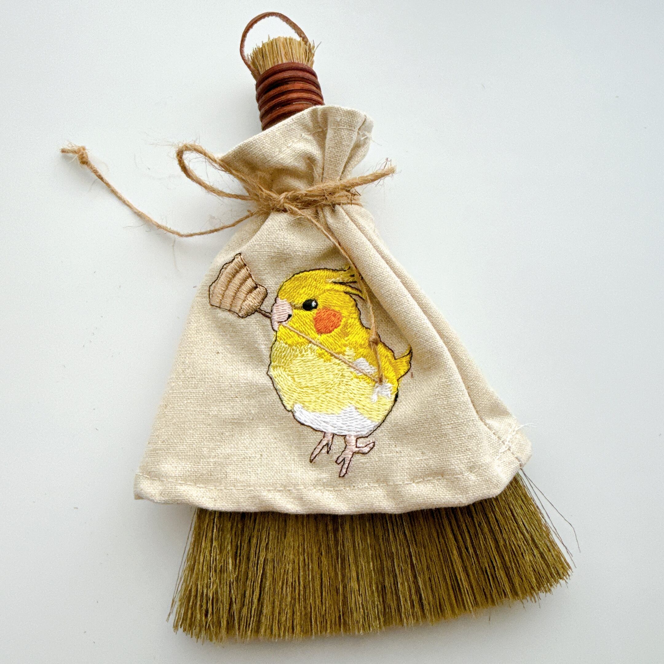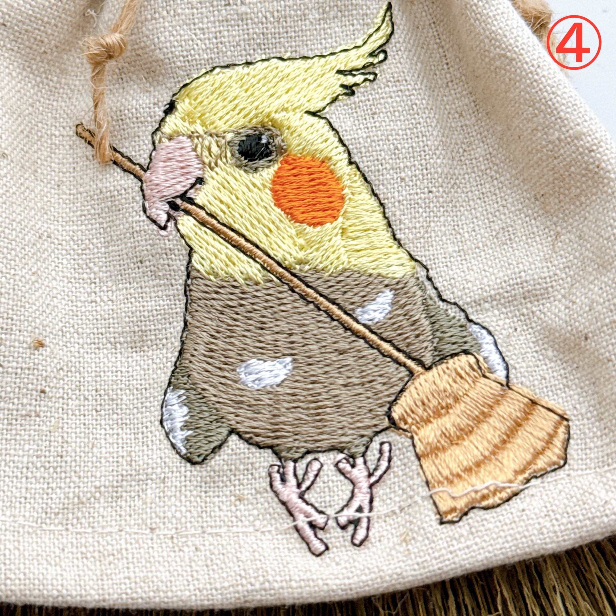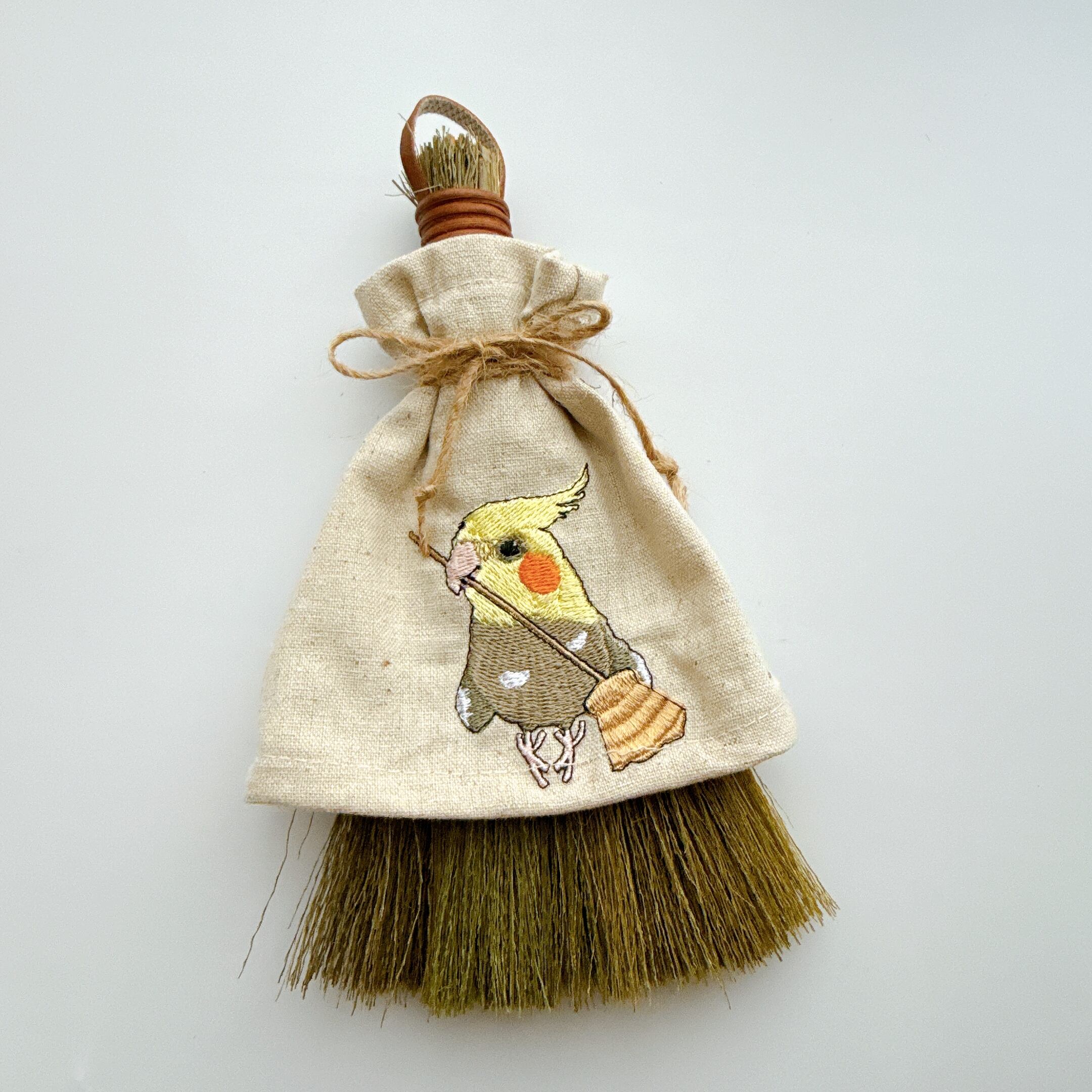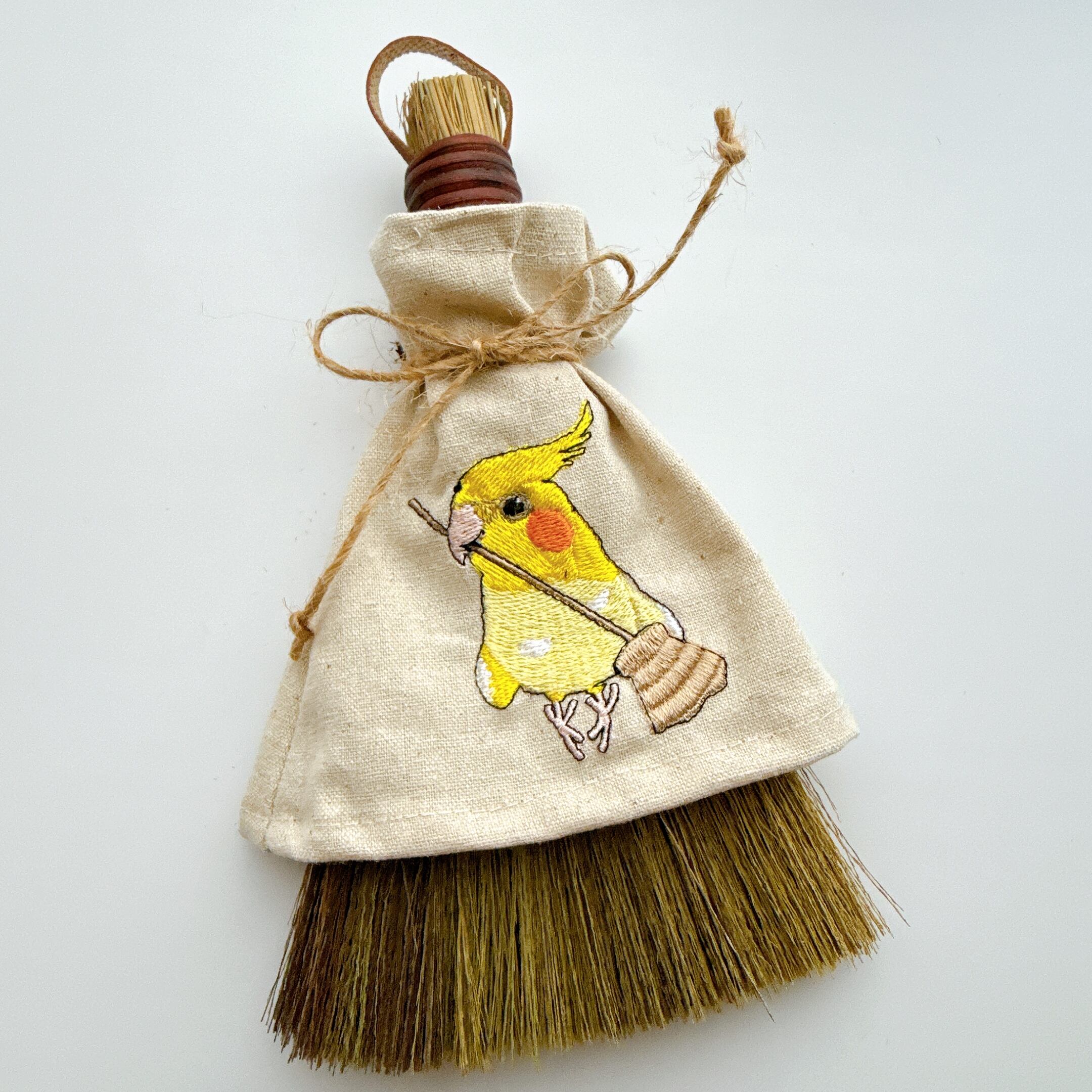 ほうきを持ったオカメインコさんを刺繍しています。