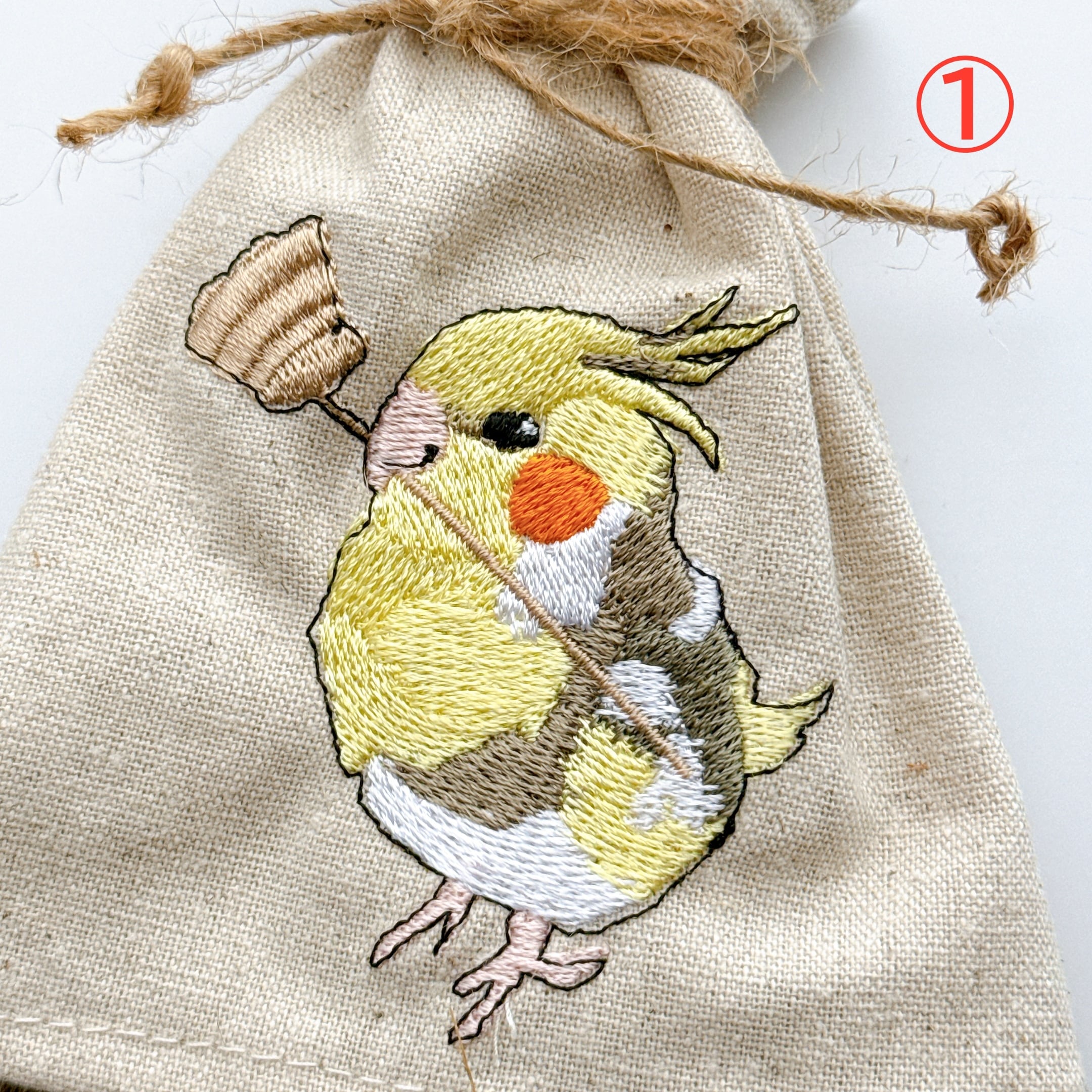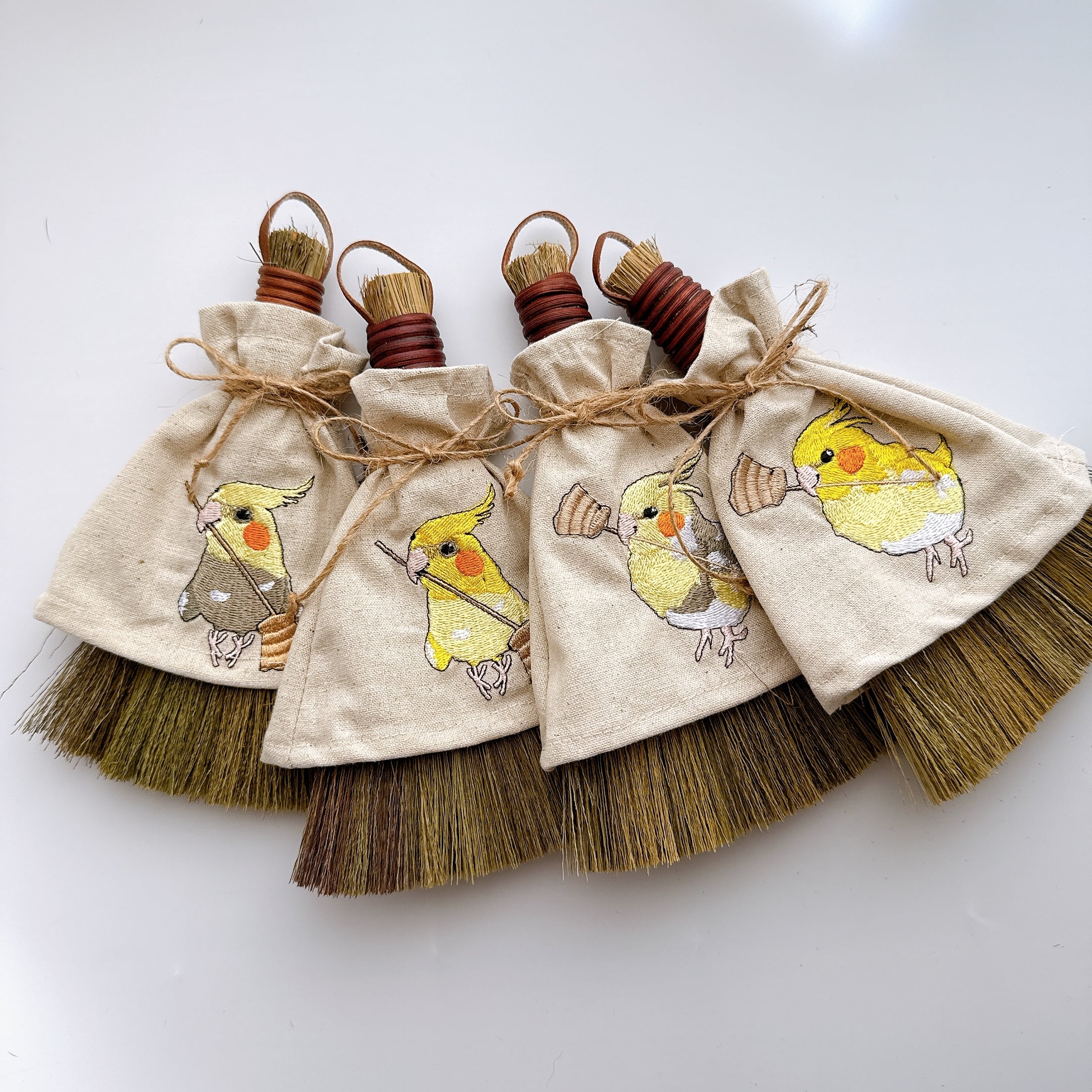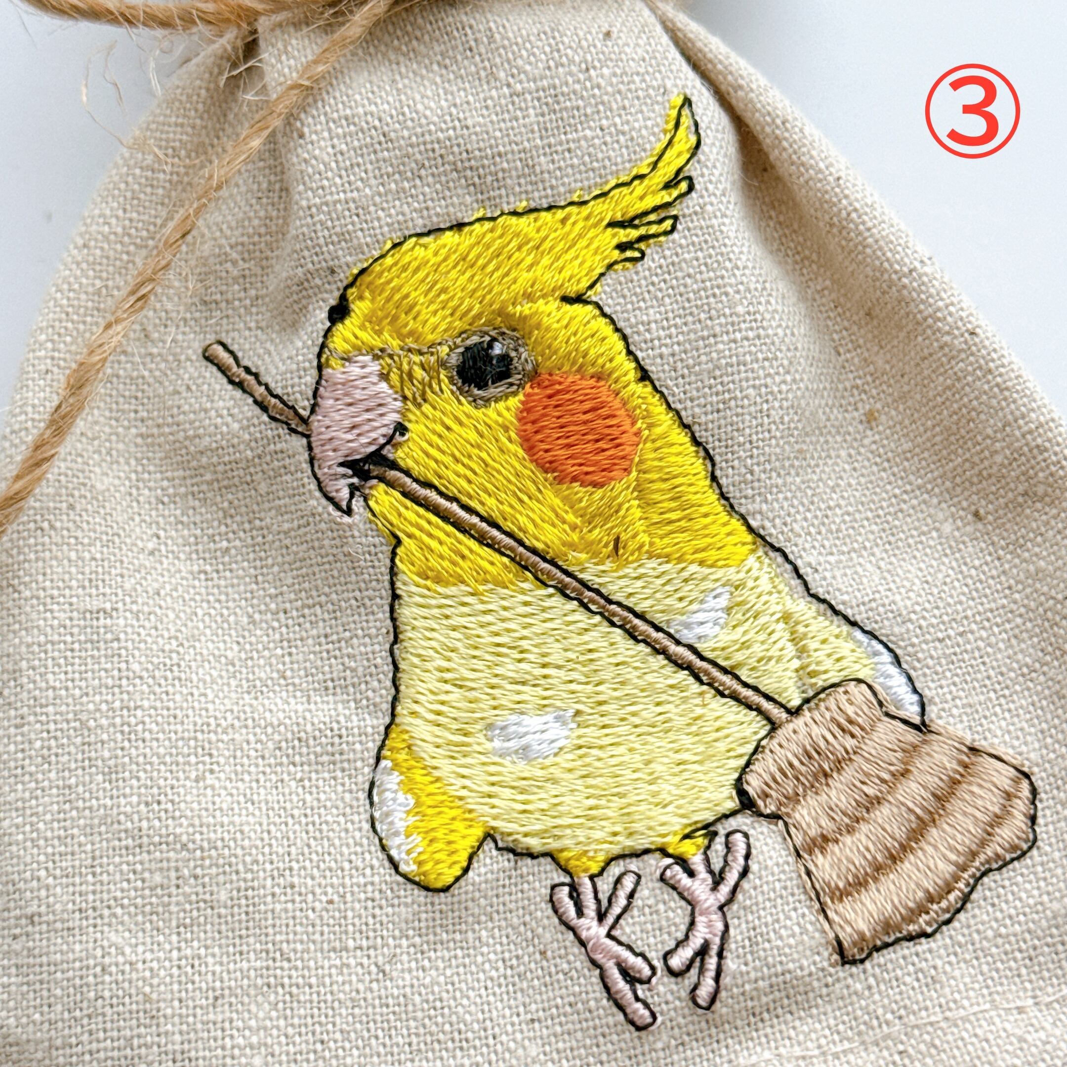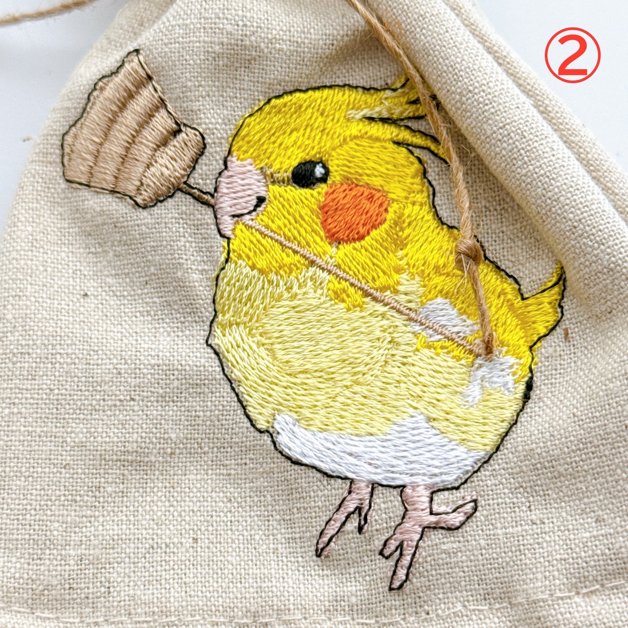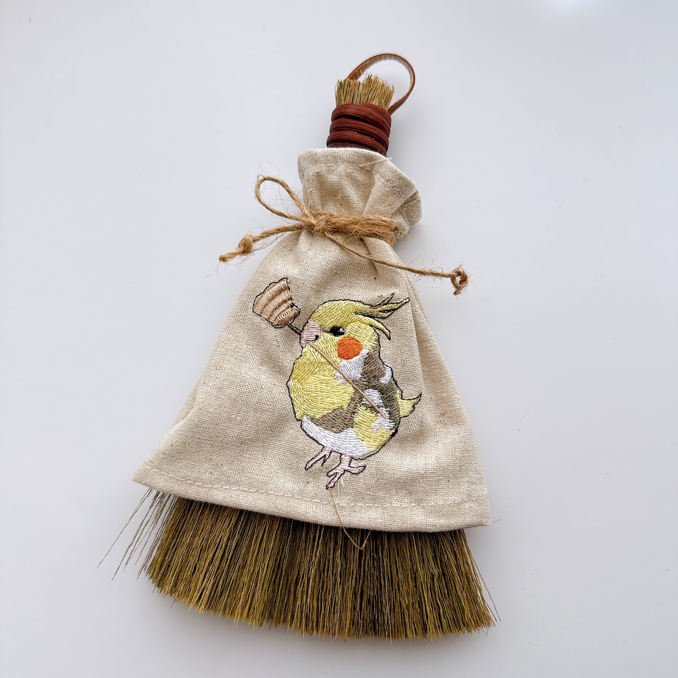 ほうきを持ったオカメインコさんを刺繍しています。