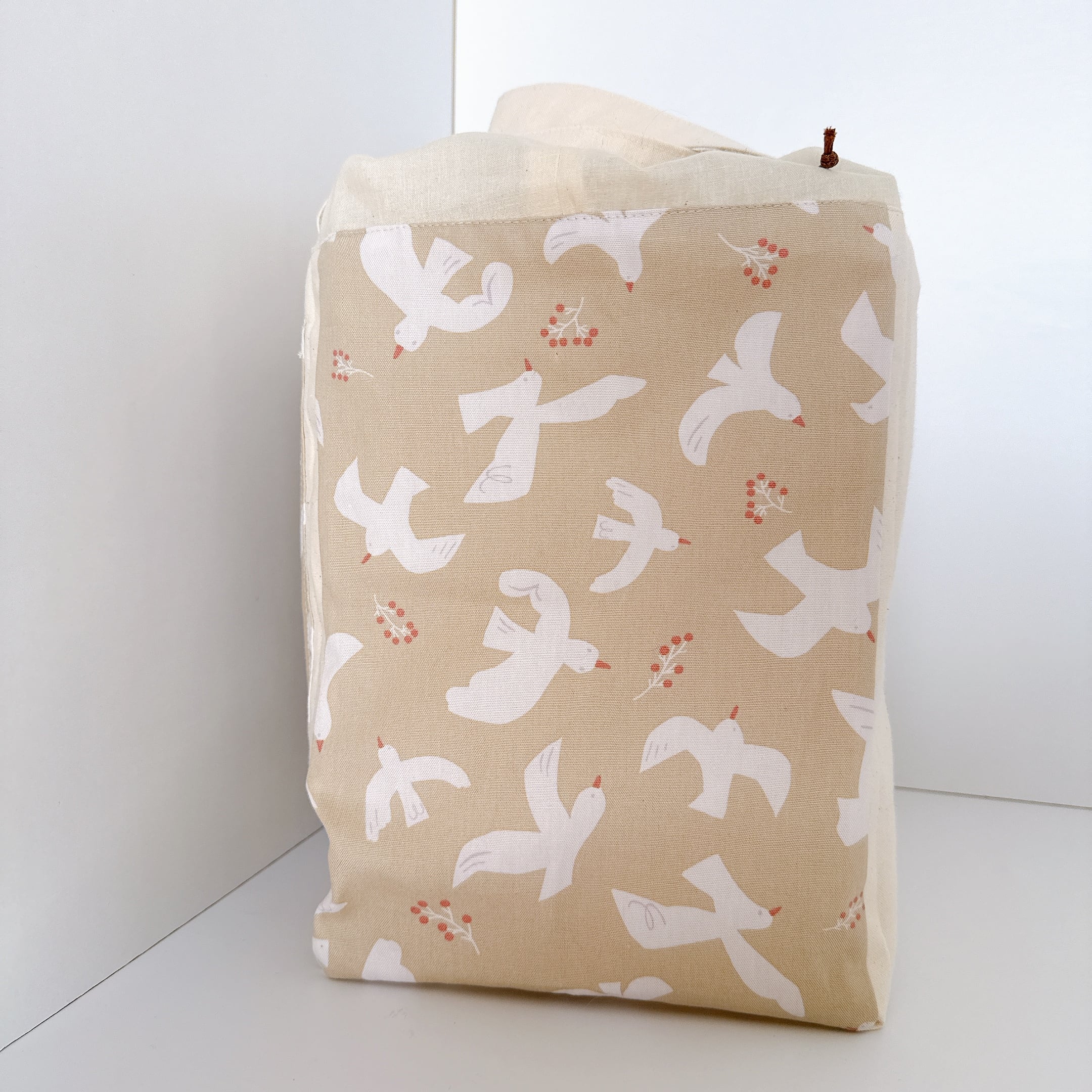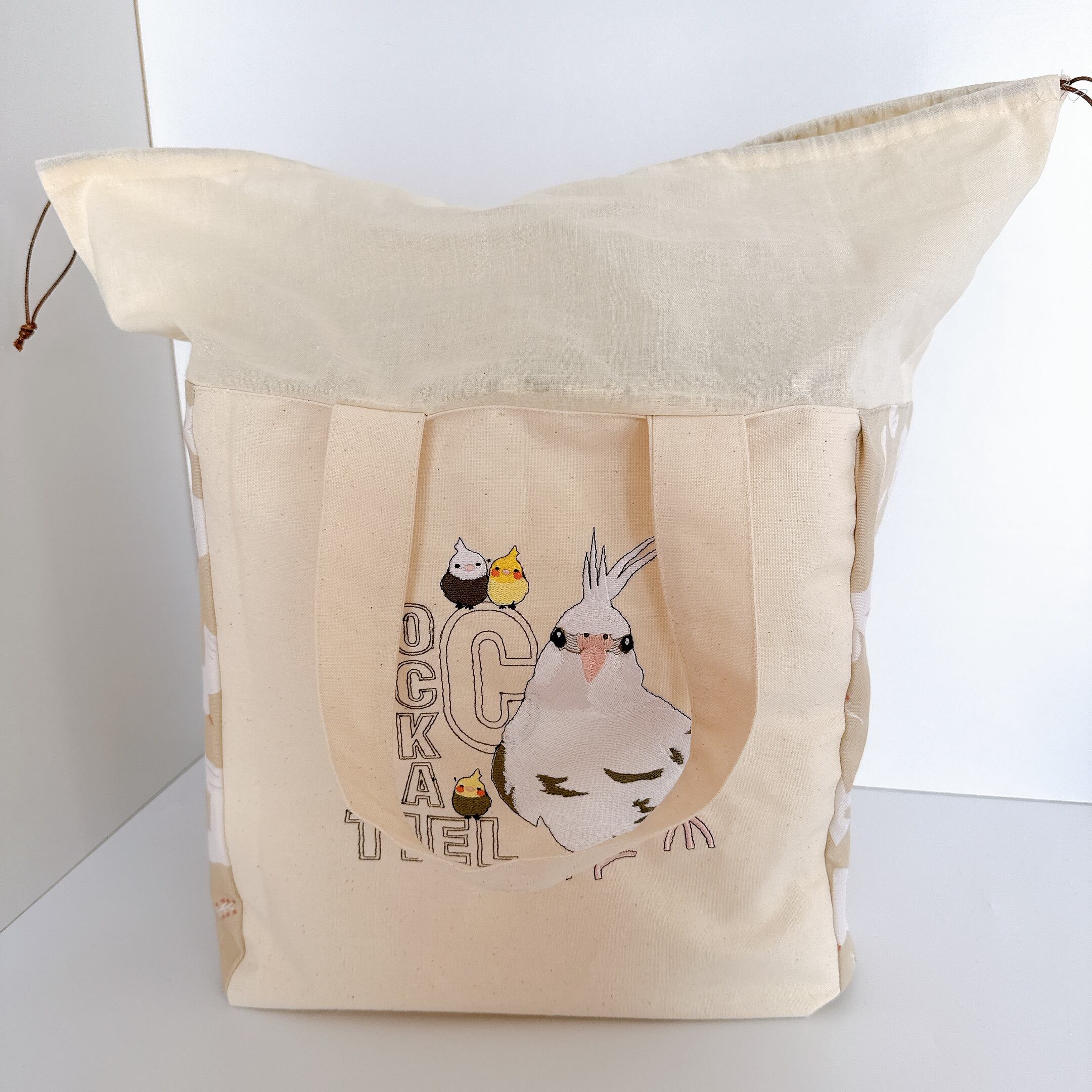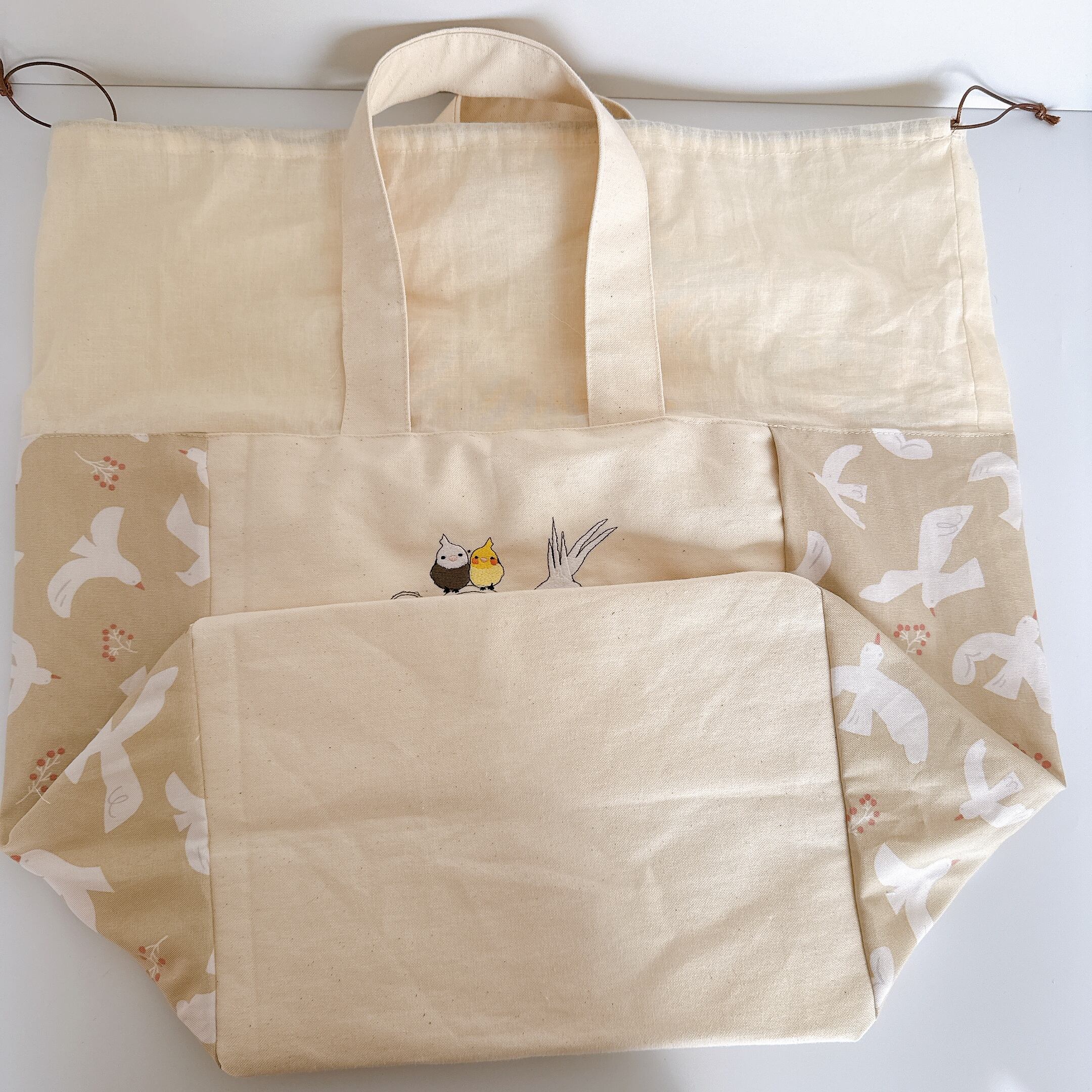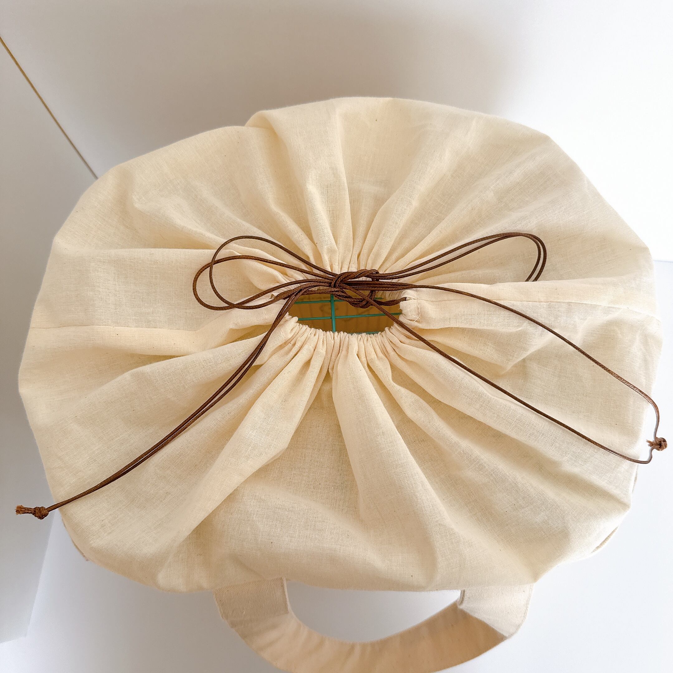 開口部の布は裏布と同じシーチングを使用しました。布が柔らかいので巾着が絞りやすく、小鳥さんの出し入れも安心で統一感も抜群です♪
