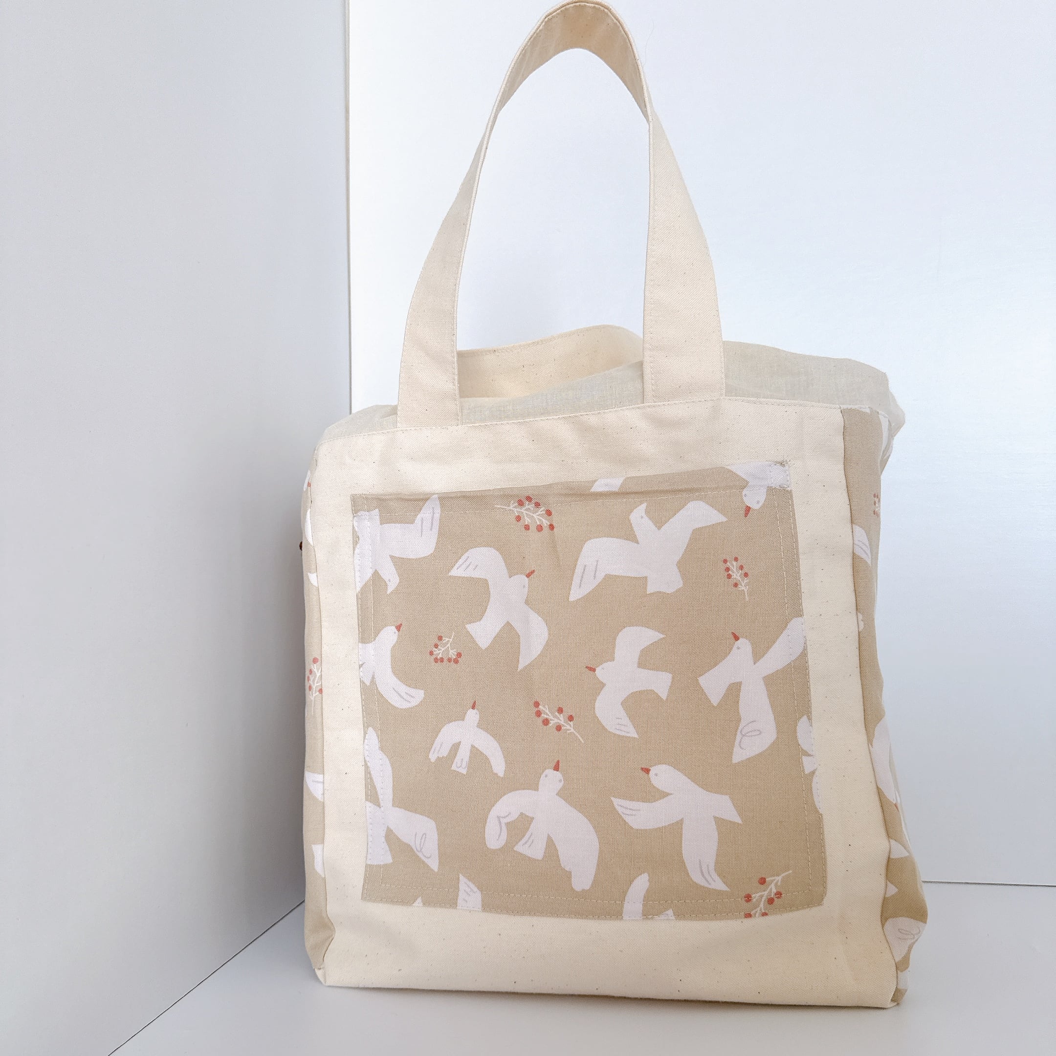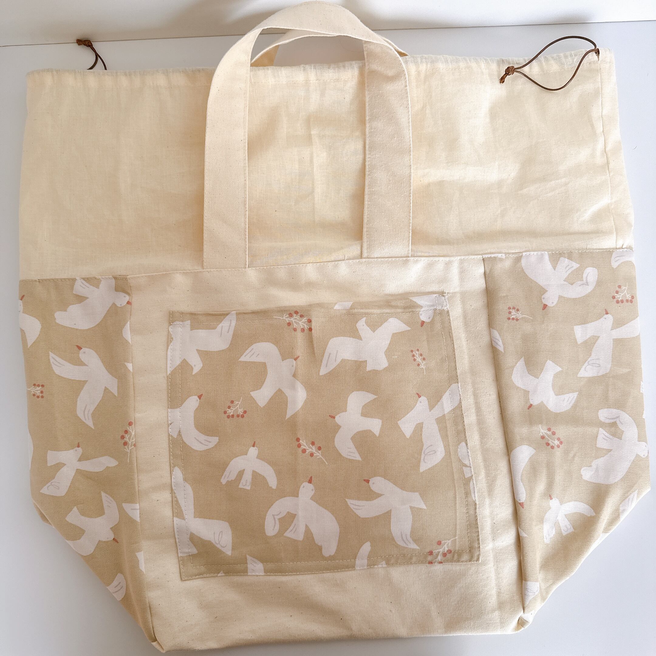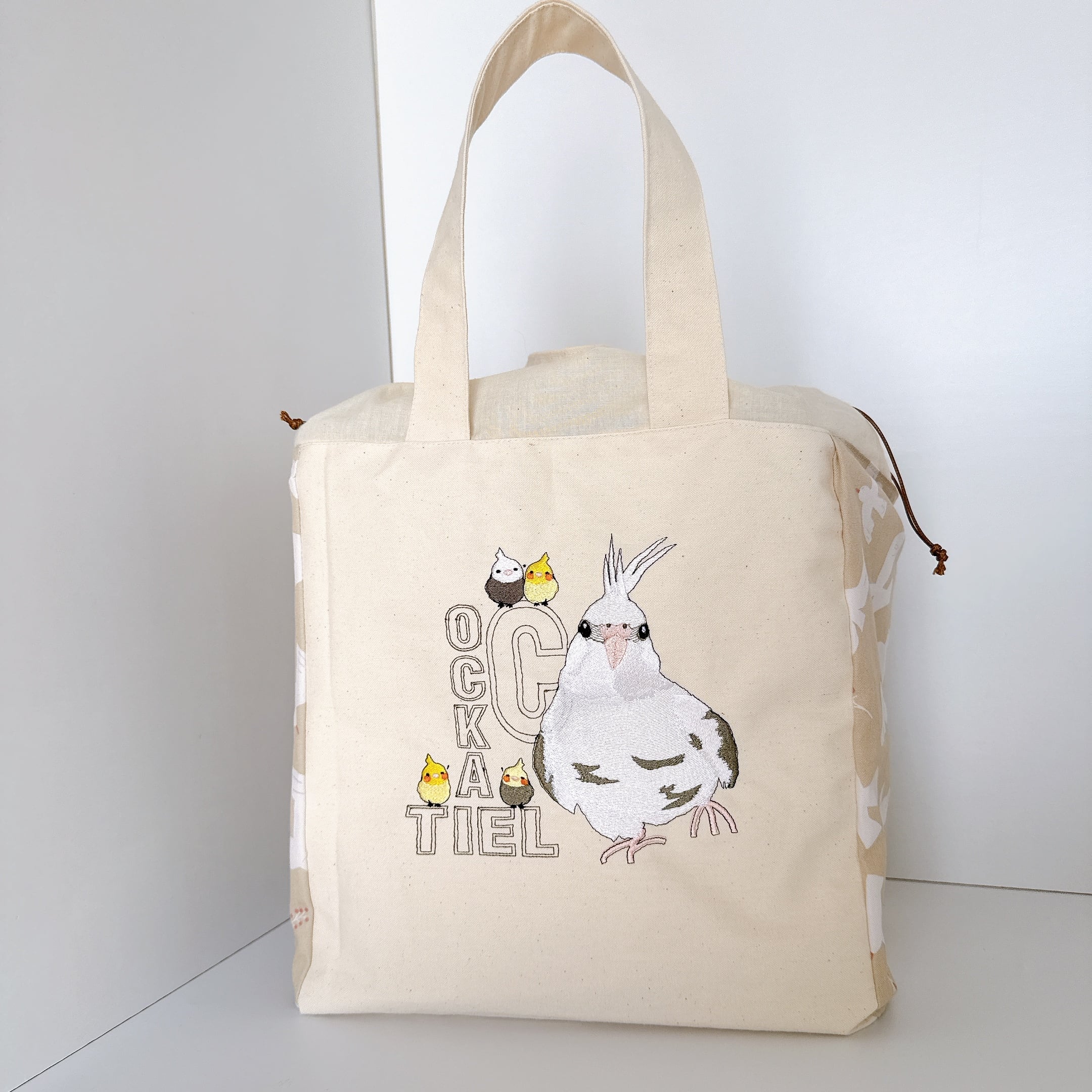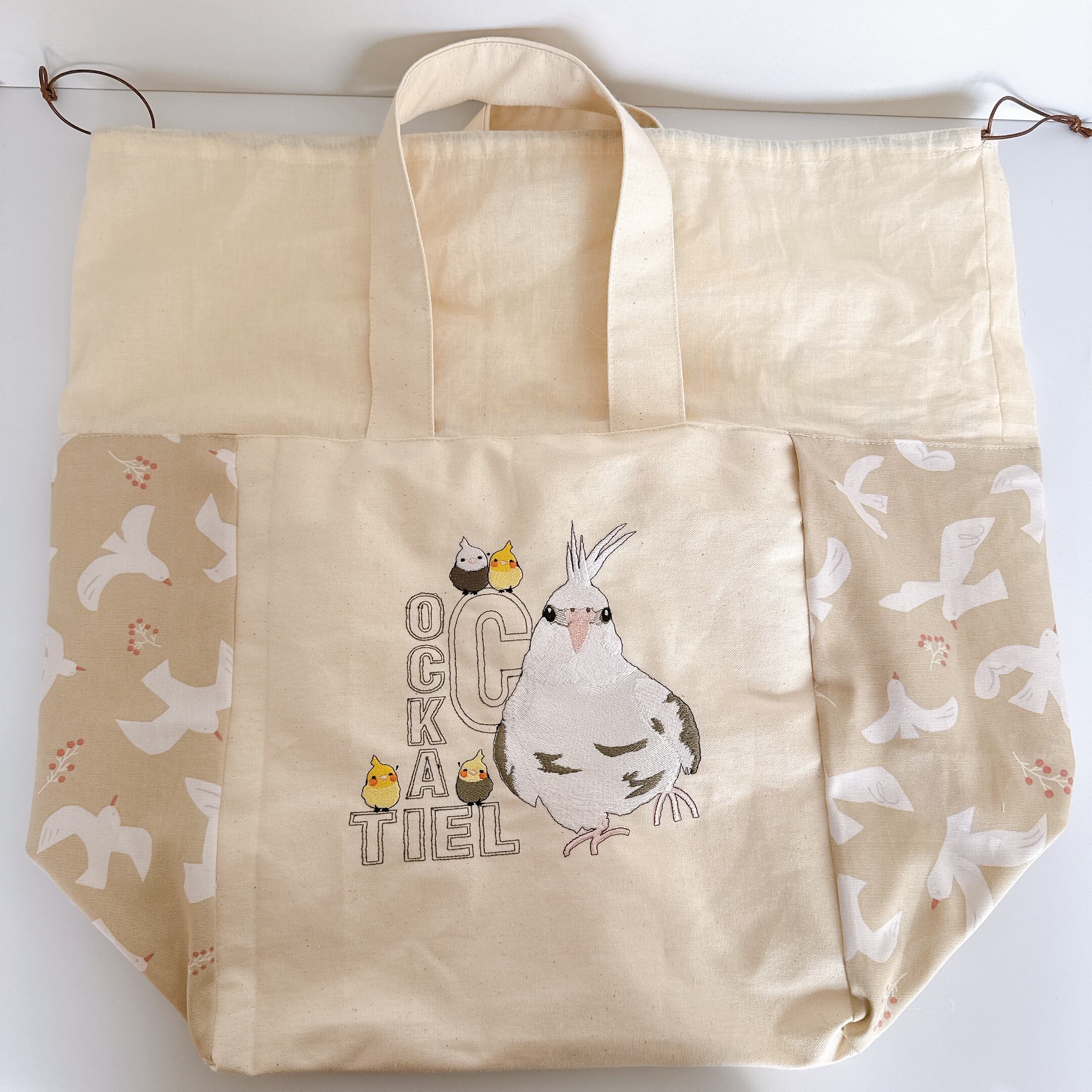 開口部の布は裏布と同じシーチングを使用しました。布が柔らかいので巾着が絞りやすく、小鳥さんの出し入れも安心で統一感も抜群です♪