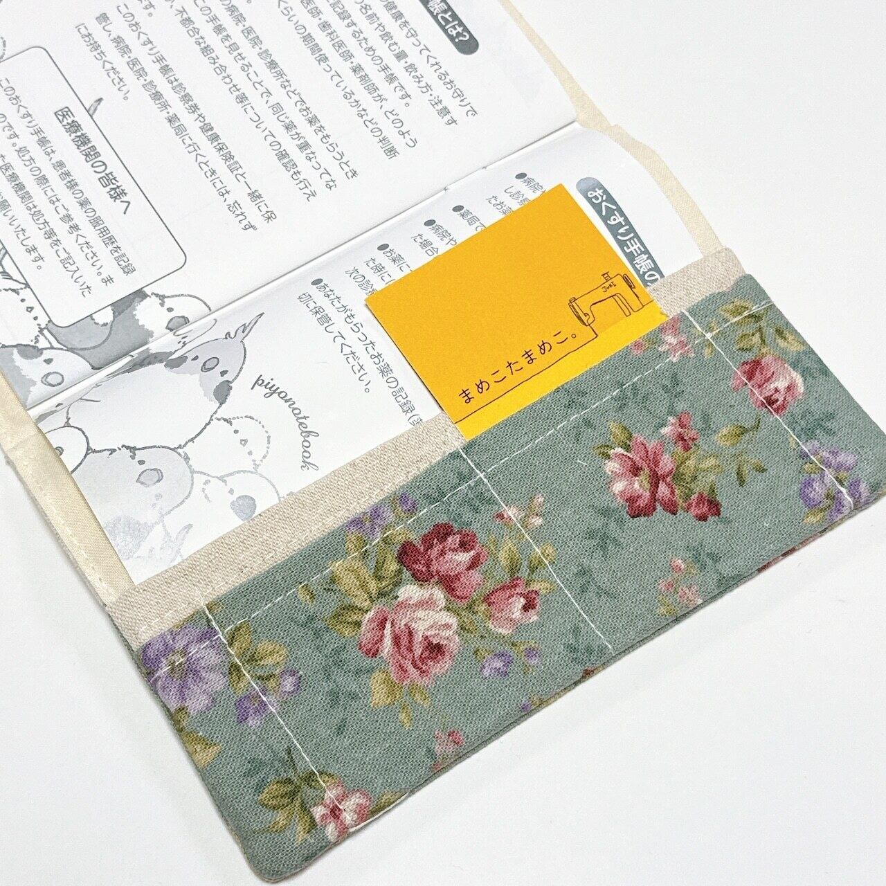 カードポケットが2室、お薬手帳や通帳、医療証などが入るポケットが2室(ブックカバー様式としてお使いの時は背表紙が入ります)