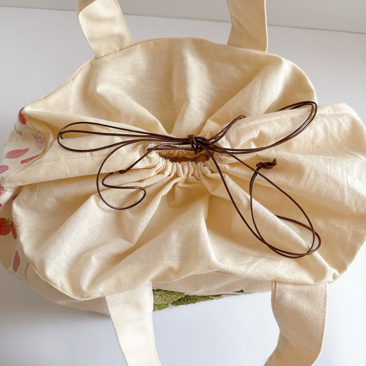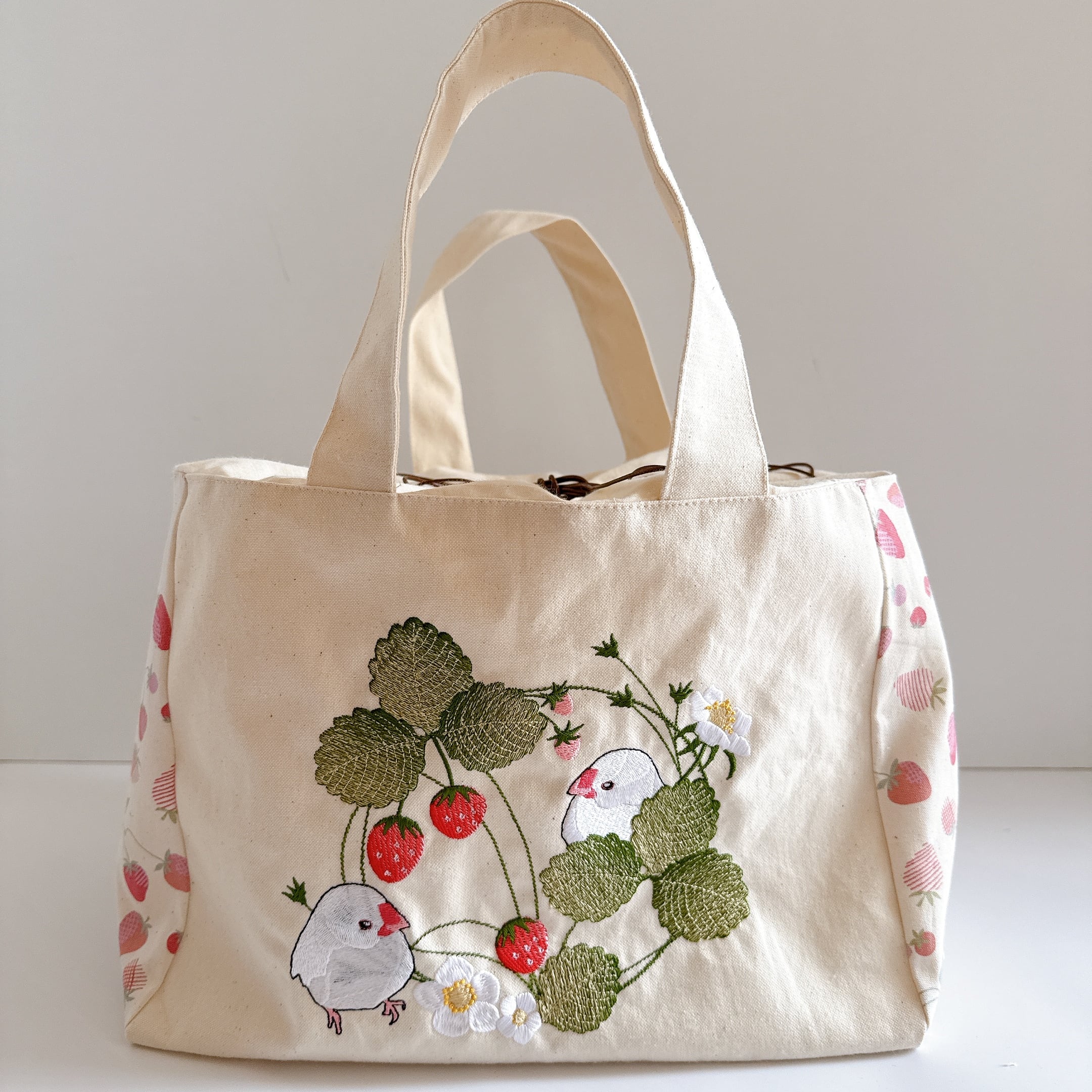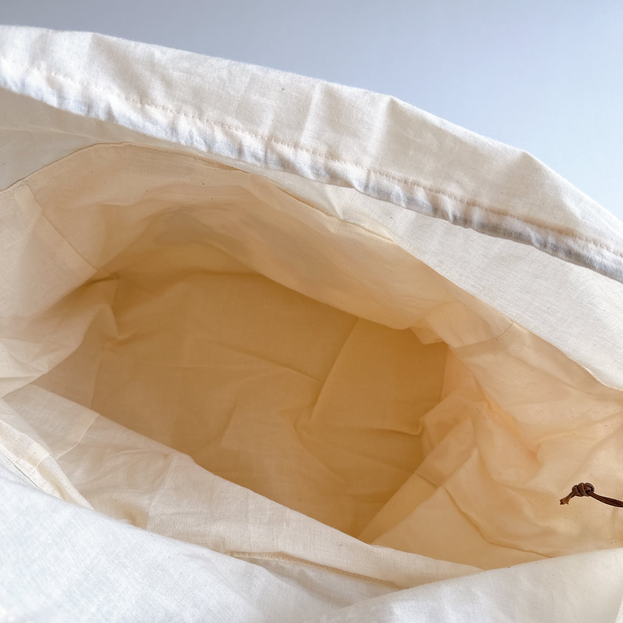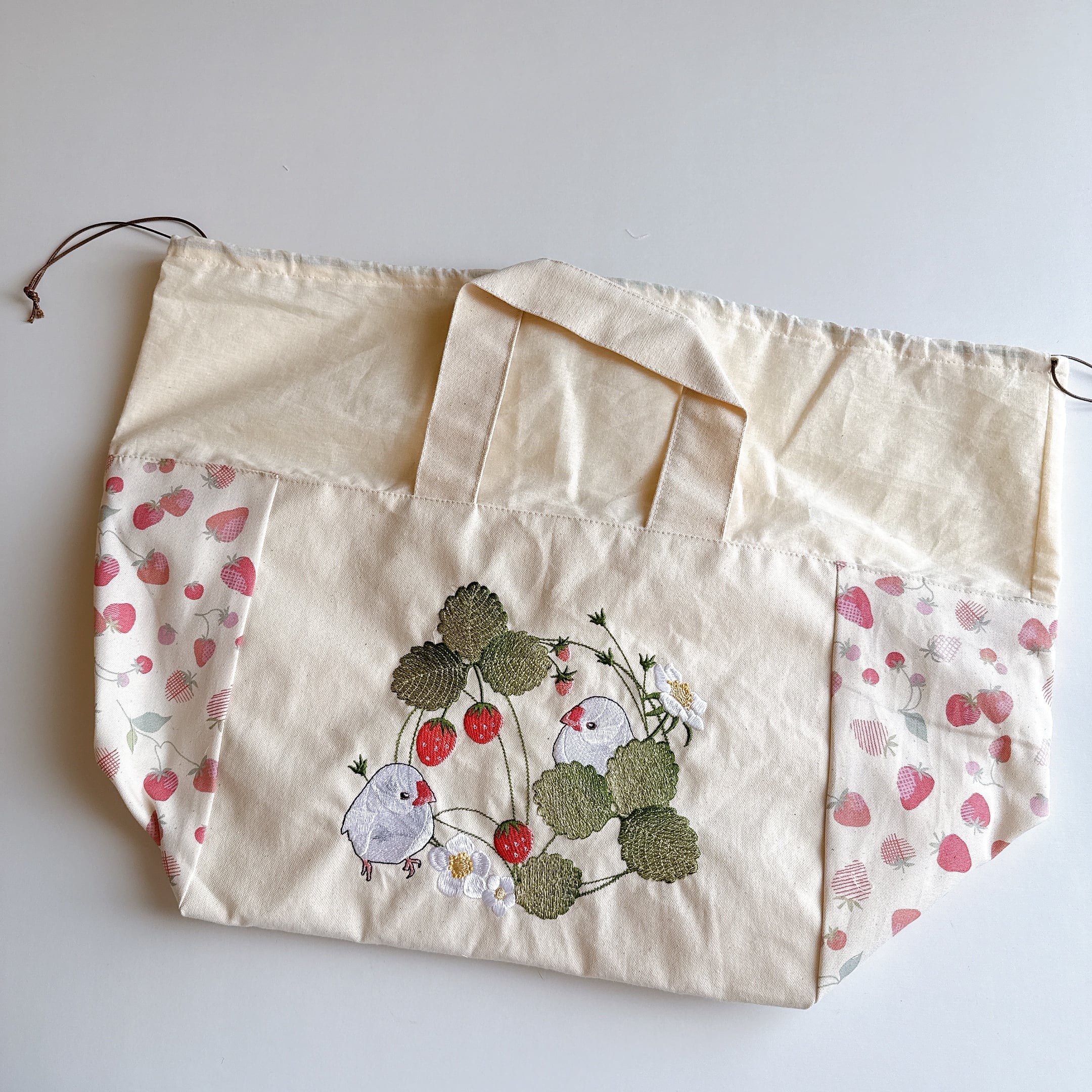 開口部の布は裏布と同じシーチングを使用しました。布が柔らかいので巾着が絞りやすく、小鳥さんの出し入れも安心で統一感も抜群です♪