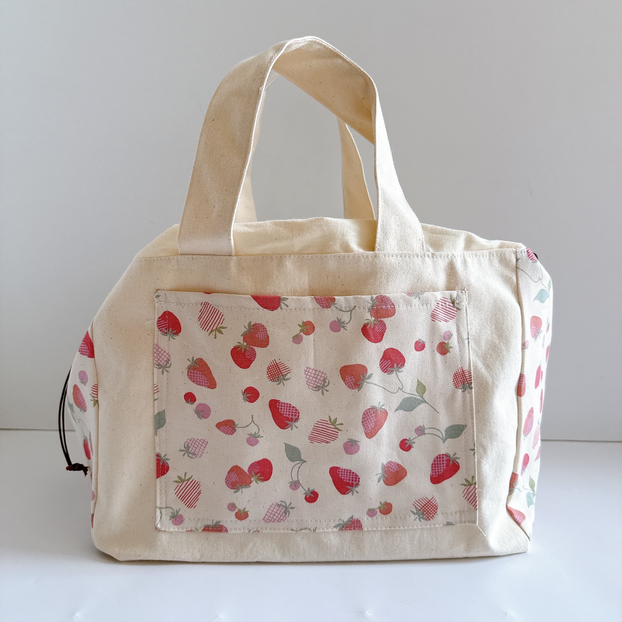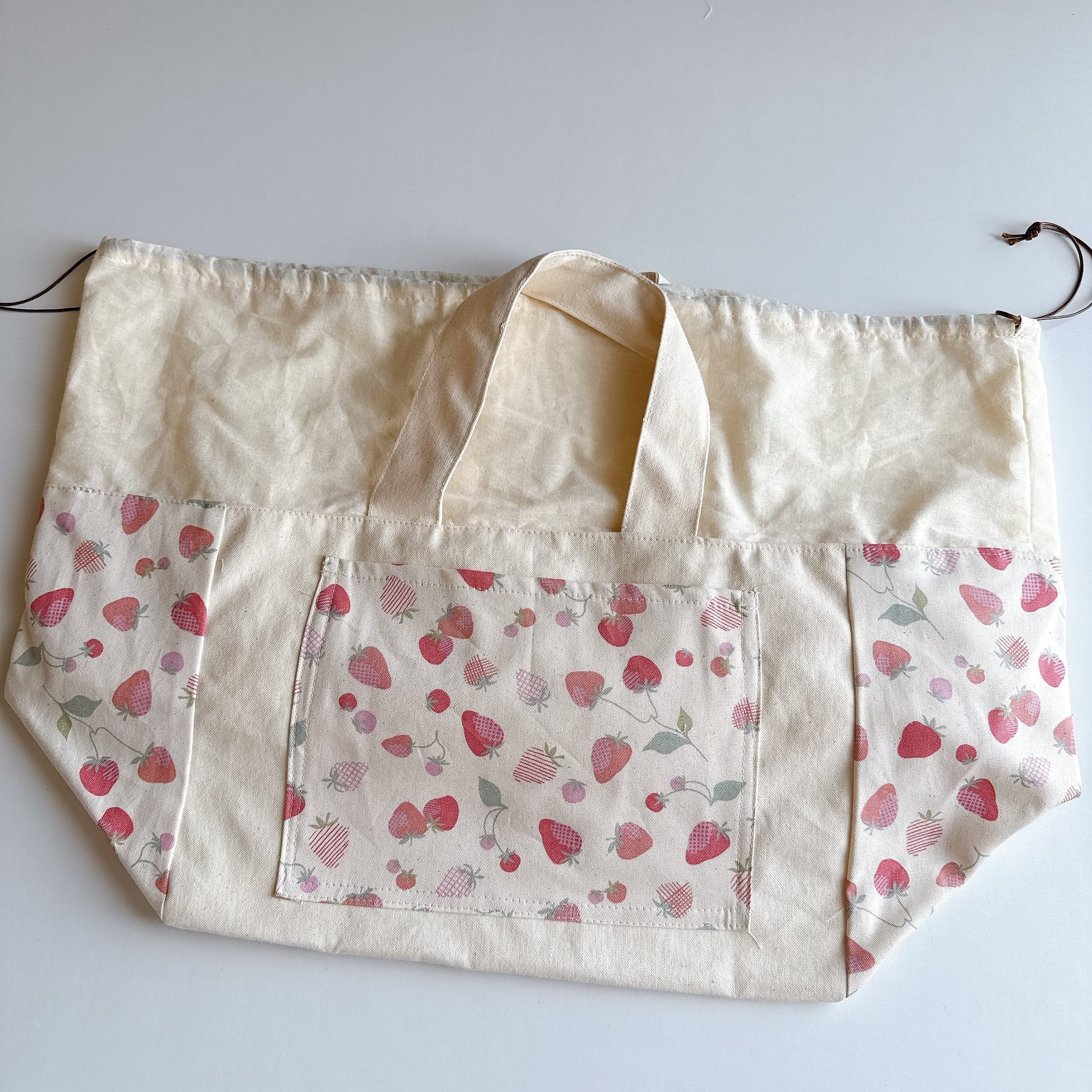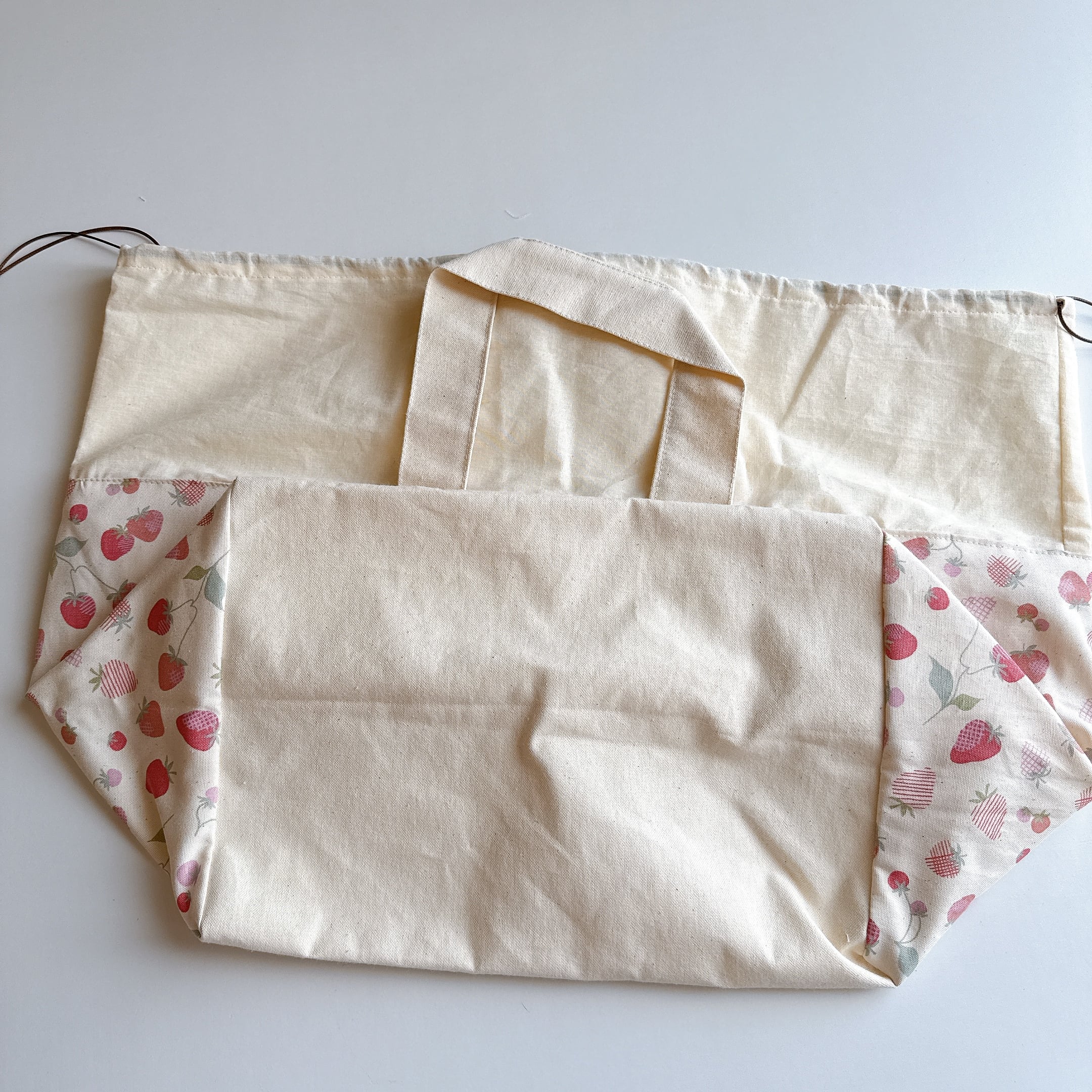 開口部の布は裏布と同じシーチングを使用しました。布が柔らかいので巾着が絞りやすく、小鳥さんの出し入れも安心で統一感も抜群です♪