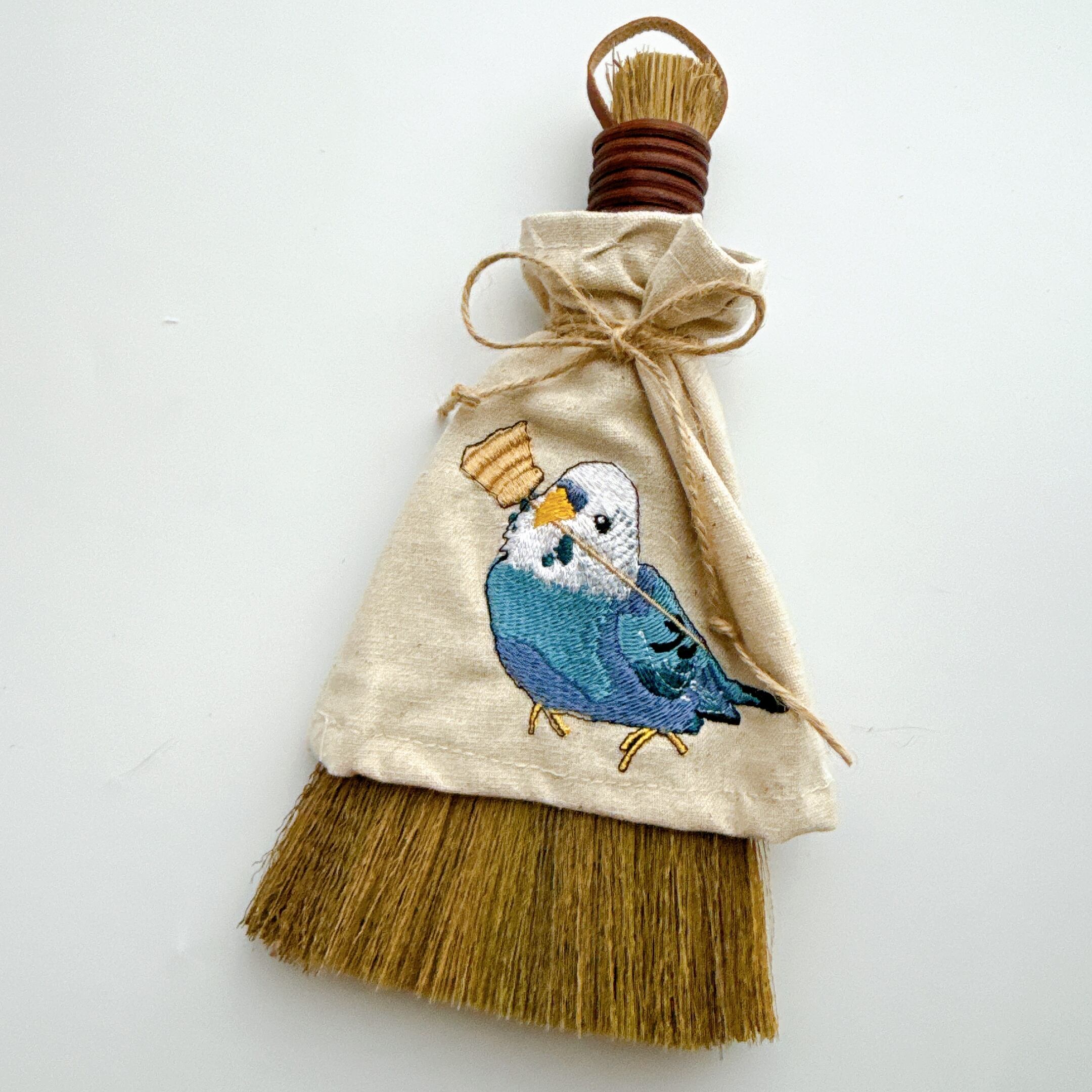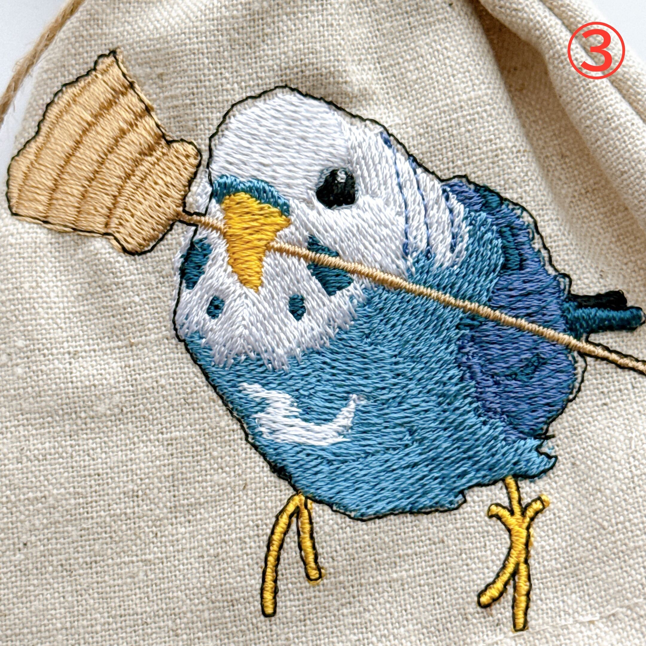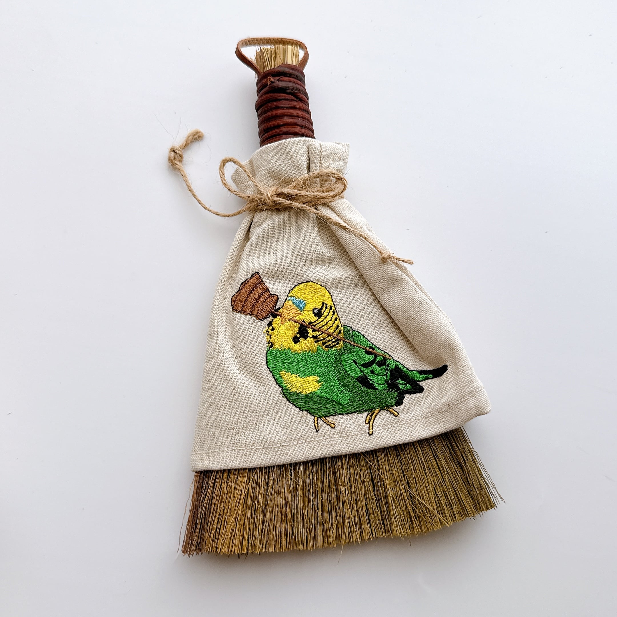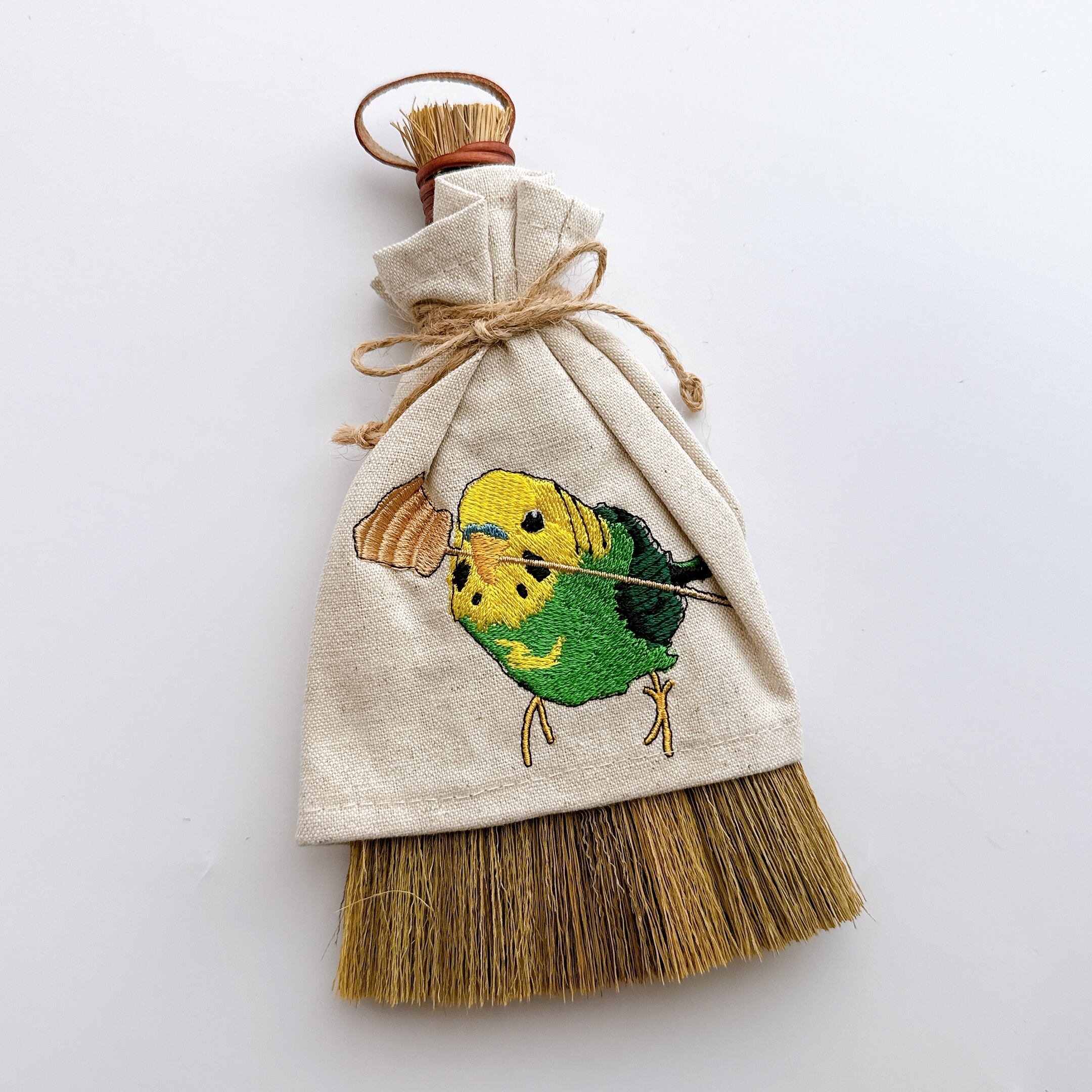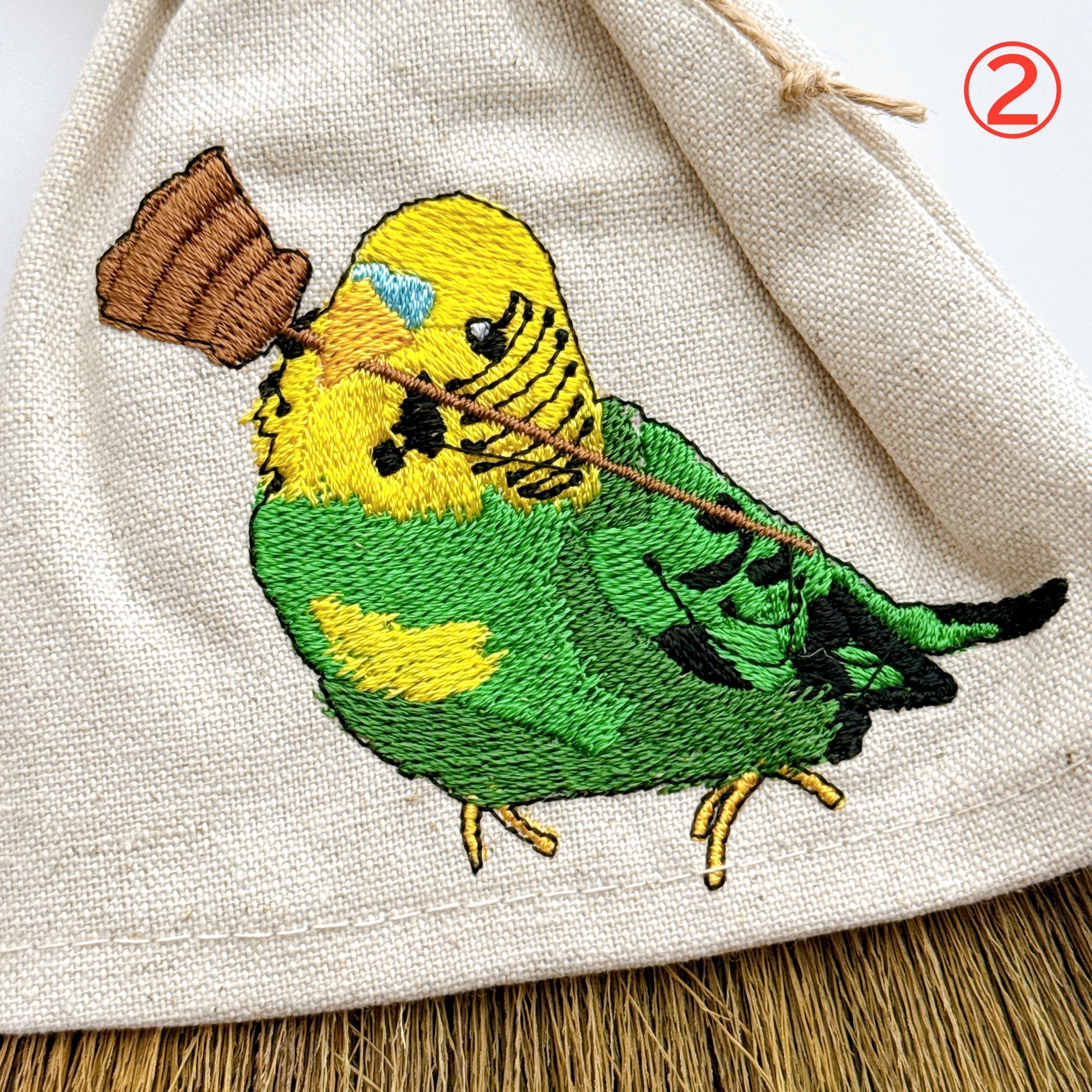ほうきを持ったセキセイインコさんを刺繍しています。