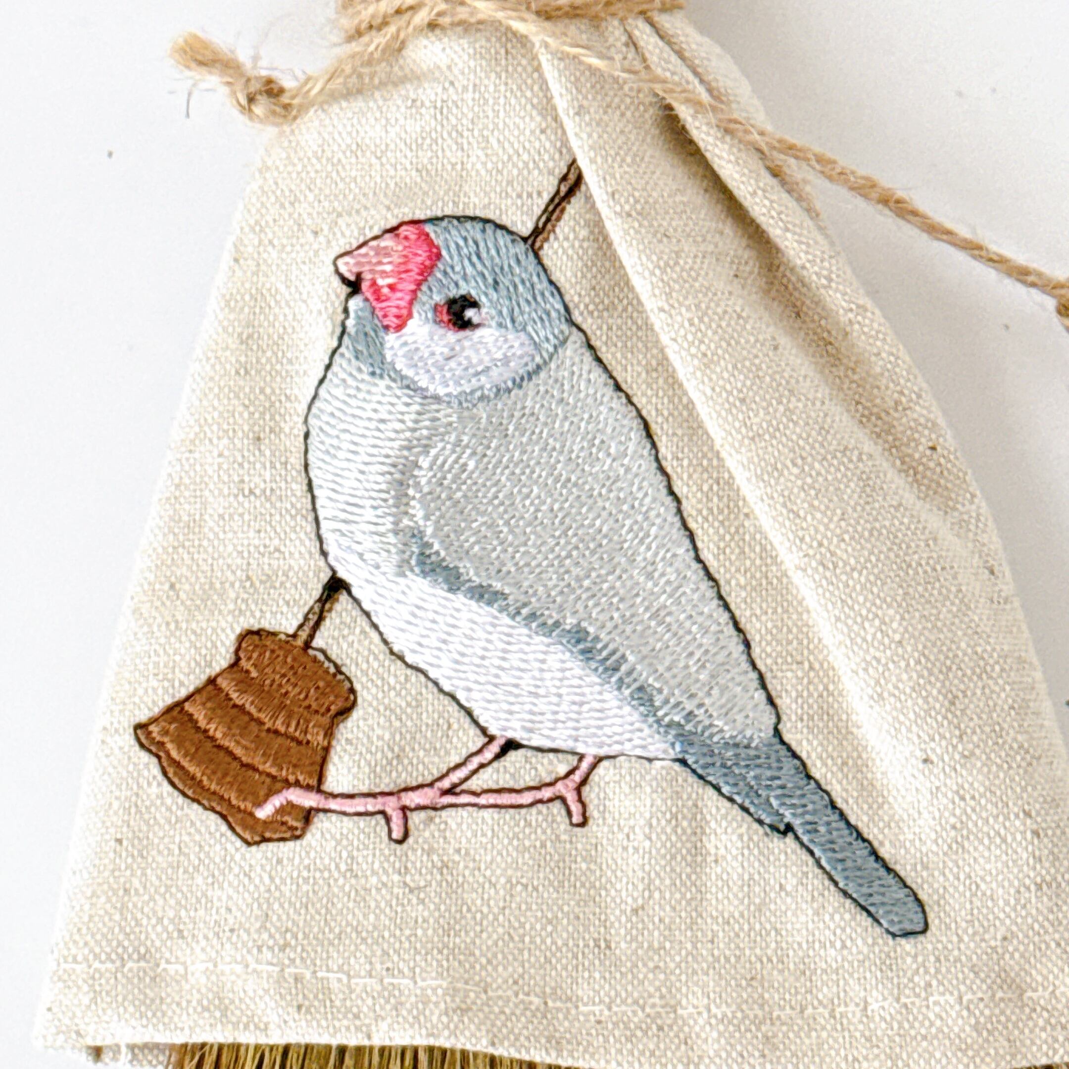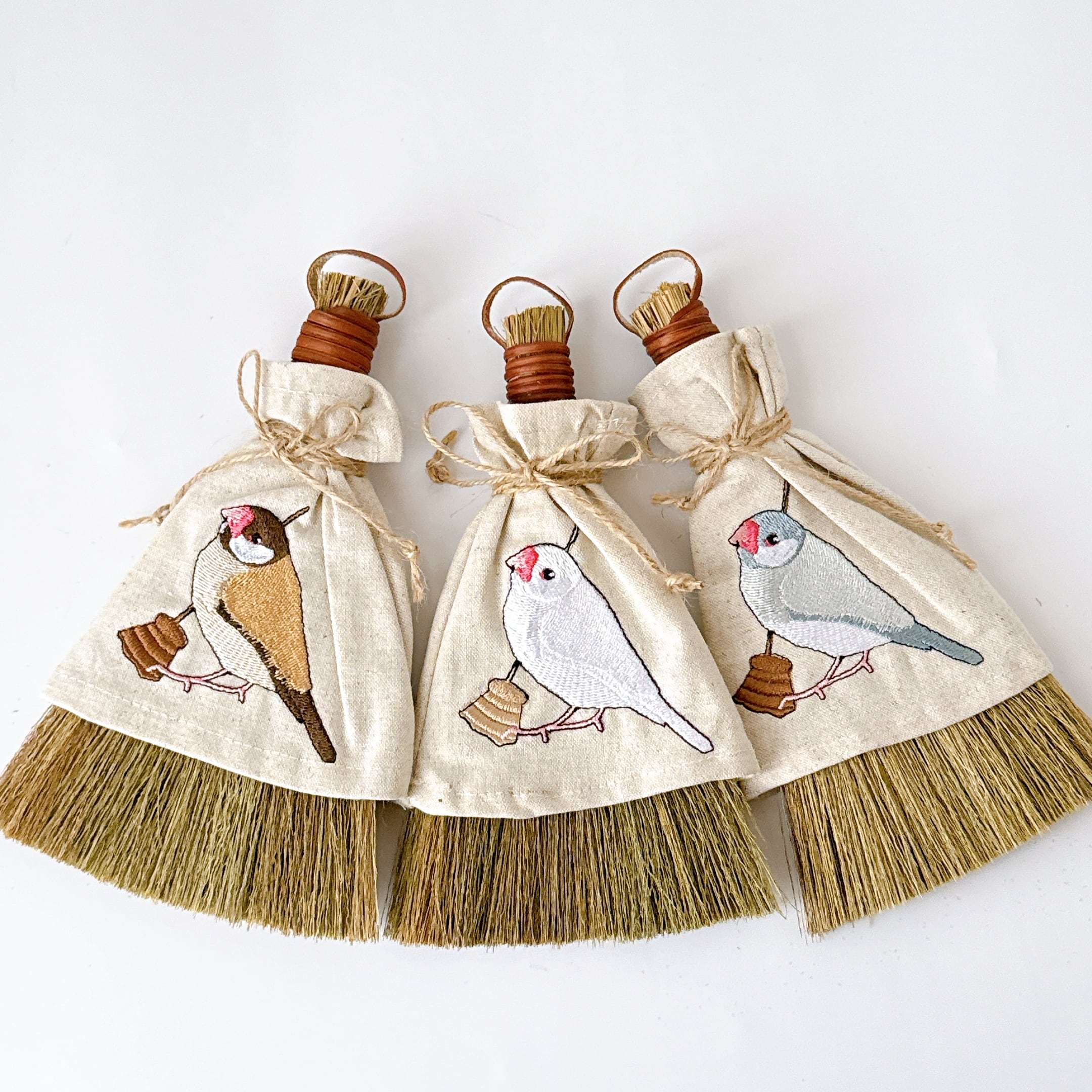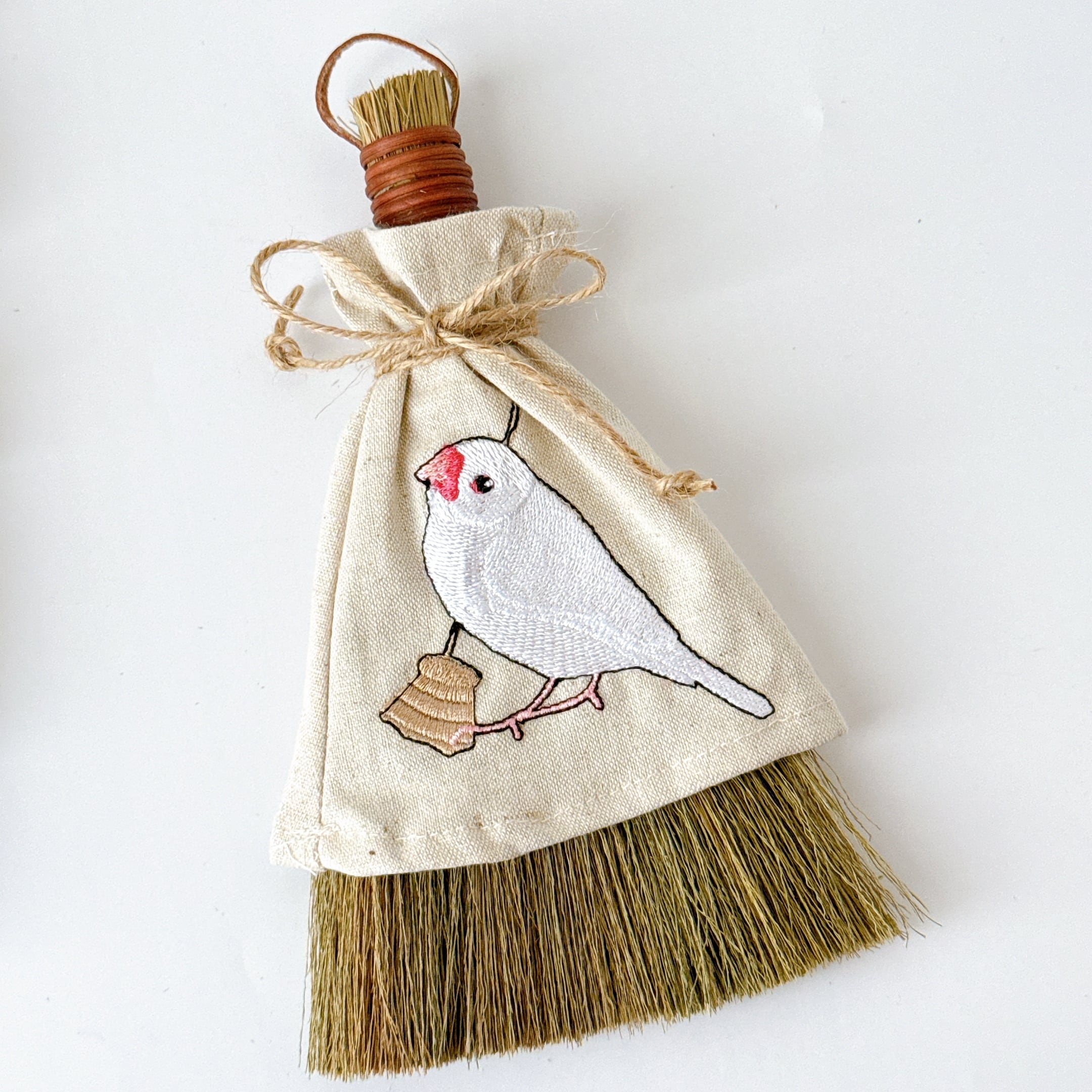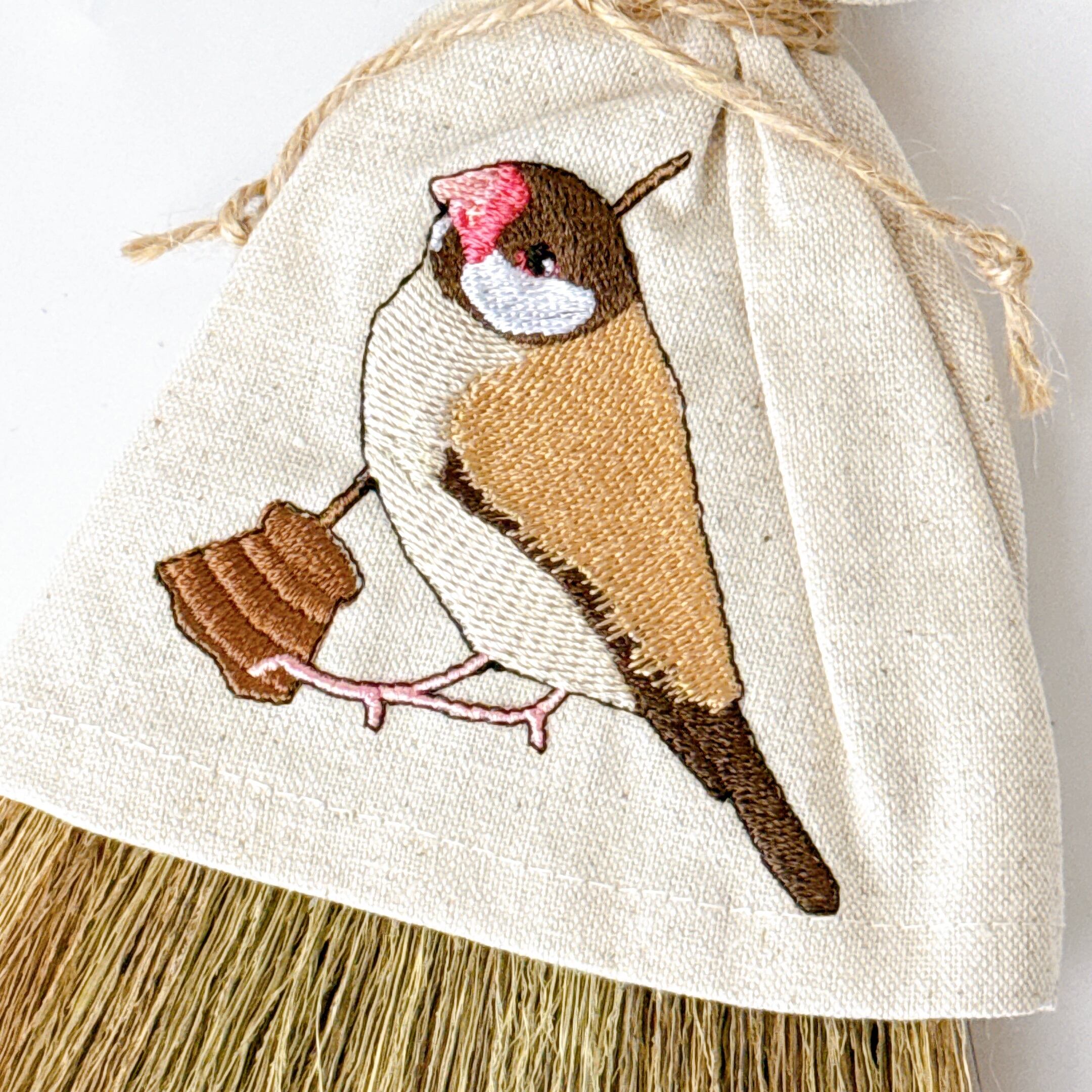 ほうきを持った文鳥さんを刺繍しています。