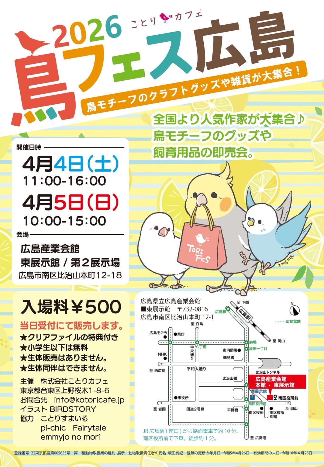 鳥フェス広島(対面販売)2026.4.4~4.5会場:広島産業会館東展示館/第2展示場開場時間:4/4(土)11:00~16:00・4/5(日)10:00~15:00